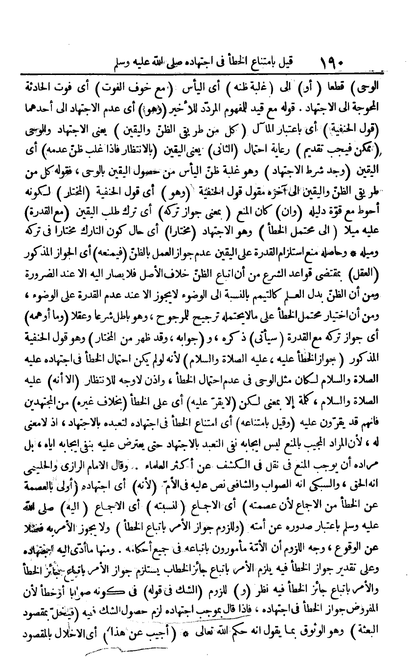 الْوَحْي) قطعا (أَو) إِلَى (غَلَبَة ظَنّه) أَي الْيَأْس (مَعَ خوف الْفَوْت) أَي فَوت الْحَادِثَة المحوجة إِلَى الِاجْتِهَاد. قَوْله مَعَ قيد للمفهوم المردد للأخير (وَهُوَ) أَي عدم الِاجْتِهَاد إِلَى أَحدهمَا (قَول الْحَنَفِيَّة) أَي بِاعْتِبَار الْمَآل (كل من طريقي الظَّن وَالْيَقِين) يَعْنِي الِاجْتِهَاد وَالْوَحي (مُمكن فَيجب تَقْدِيم) رِعَايَة احْتِمَال (الثَّانِي) يَعْنِي الْيَقِين (بالانتظار فَإِذا غلب ظن عَدمه) أَي الْيَقِين (وجد شَرط الِاجْتِهَاد) وَهُوَ غَلَبَة ظن الْيَأْس من حُصُول الْيَقِين بِالْوَحْي، فَقَوله كل من طريقي الظَّن وَالْيَقِين إِلَى آخِره مقول قَول الْحَنَفِيَّة (وَهُوَ) أَي قَول الْحَنَفِيَّة (الْمُخْتَار) لكَونه أحوط مَعَ قُوَّة دَلِيله (وَإِن) كَانَ الْمَنْع (بِمَعْنى جَوَاز تَركه) أَي ترك طلب الْيَقِين (مَعَ الْقُدْرَة) عَلَيْهِ ميلًا (إِلَى مُحْتَمل الْخَطَأ) وَهُوَ الِاجْتِهَاد (مُخْتَارًا) أَي حَال كَون التارك مُخْتَارًا فِي تَركه وميله وَحَاصِله منع استلزام الْقُدْرَة على الْيَقِين عدم جَوَاز الْعَمَل بِالظَّنِّ (فيمنعه) أَي الْجَوَاز الْمَذْكُور (الْعقل) بِمُقْتَضى قَوَاعِد الشَّرْع من أَن اتِّبَاع الظَّن خلاف الأَصْل فَلَا يُصَار إِلَيْهِ إِلَّا عِنْد الضَّرُورَة وَمن أَن الظَّن بدل الْعلم كالتيمم بِالنِّسْبَةِ إِلَى الْوضُوء لَا يجوز إِلَّا عِنْد عدم الْقُدْرَة على الْوضُوء، وَمن أَن اخْتِيَار مُحْتَمل الْخَطَأ على مَا لَا يحْتَملهُ تَرْجِيح للمرجوح، وَهُوَ بَاطِل شرعا وعقلا (وَمَا أَوْهَمهُ) أَي جَوَاز تَركه مَعَ الْقُدْرَة (سَيَأْتِي) ذكره، و (جَوَابه، وَقد ظهر من الْمُخْتَار) وَهُوَ قَول الْحَنَفِيَّة الْمَذْكُور (جَوَاز الْخَطَأ عَلَيْهِ، صلى الله عَلَيْهِ وَسلم) لِأَنَّهُ لَو لم يكن احْتِمَال الْخَطَأ فِي اجْتِهَاده صلى الله عَلَيْهِ وَسلم لَكَانَ مثل الْوَحْي فِي عدم احْتِمَال الْخَطَأ، وَإِذن لَا وَجه للانتظار (إِلَّا أَنه) صلى الله عَلَيْهِ وَسلم، كلمة إِلَّا بِمَعْنى لَكِن (لَا يقر عَلَيْهِ) أَي على الْخَطَأ (بِخِلَاف غَيره) من الْمُجْتَهدين فَإِنَّهُم قد يقرونَ عَلَيْهِ (وَقيل بامتناعه) أَي امْتنَاع الْخَطَأ فِي اجْتِهَاده لتعبده بِالِاجْتِهَادِ، إِذْ لَا معنى لَهُ، لِأَن المُرَاد الْمُجيب بِالْمَنْعِ لَيْسَ إِيجَابه نفي التَّعَبُّد بِالِاجْتِهَادِ حَتَّى يعْتَرض عَلَيْهِ بِنَفْي إِيجَابه إِيَّاه، بل مُرَاده أَن يُوجب الْمَنْع فِي نقل فِي الْكَشْف عَن أَكثر الْعلمَاء. وَقَالَ الإِمَام الرَّازِيّ والحليمي أَنه الْحق، والسبكي أَنه الصَّوَاب وَالشَّافِعِيّ نَص عَلَيْهِ فِي الْأُم (لِأَنَّهُ) أَي اجْتِهَاده (أولى بالعصمة عَن الْخَطَأ من الْإِجْمَاع لِأَن عصمته) أَي الْإِجْمَاع (لنسبته) أَي الْإِجْمَاع (إِلَيْهِ) صلى الله عَلَيْهِ وَسلم بِاعْتِبَار صدوره عَن أمته (وللزوم جَوَاز الْأَمر بِاتِّبَاع الْخَطَأ) وَلَا يجوز الْأَمر بِهِ فضلا عَن الْوُقُوع، وَجه اللُّزُوم أَن الْأمة مأمورون باتباعه فِي جَمِيع أَحْكَامه. وَمِنْهَا مَا أدّى إِلَيْهِ اجْتِهَاده وعَلى تَقْدِير جَوَاز الْخَطَأ فِيهِ يلْزم الْأَمر بِاتِّبَاع جَائِز الْخطاب يسْتَلْزم جَوَاز الْأَمر بِاتِّبَاع جَائِز الْخَطَأ وَالْأَمر بِاتِّبَاع جَائِز الْخَطَأ فِيهِ نظر (و) للُزُوم (الشَّك فِي قَوْله) فِي كَونه صَوَابا أَو خطأ لِأَن الْمَفْرُوض جَوَاز الْخَطَأ فِي اجْتِهَاده، فَإِذا قَالَ بِمُوجب اجْتِهَاده لزم حُصُول الشَّك فِيهِ (فيخل بمقصود الْبعْثَة) وَهُوَ الوثوق بِمَا يَقُول إِنَّه حكم الله تَعَالَى (أُجِيب عَن هَذَا) أَي الْإِخْلَال بِالْمَقْصُودِ