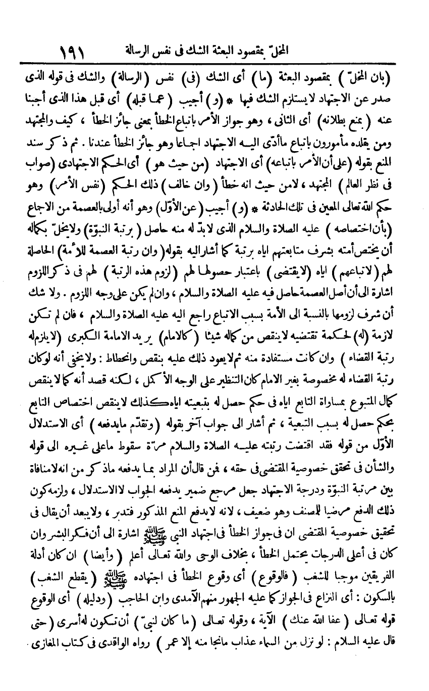 (بَان المخل) بمقصود الْبعْثَة (مَا) أَي الشَّك (فِي) نفس (الرسَالَة) وَالشَّكّ فِي قَوْله الَّذِي صدر عَن الِاجْتِهَاد لَا يسْتَلْزم الشَّك فِيهَا (و) أُجِيب (عَمَّا قبله) أَي قبل هَذَا الَّذِي أجبنا عَنهُ (بِمَنْع بُطْلَانه) أَي الثَّانِي، وَهُوَ جَوَاز الْأَمر بِاتِّبَاع الْخَطَأ بِمَعْنى جَائِز الْخَطَأ، كَيفَ والمجتهد وَمن يقلده مأمورون بِاتِّبَاع مَا أدّى إِلَيْهِ الِاجْتِهَاد إِجْمَاعًا وَهُوَ جَائِز الْخَطَأ عندنَا. ثمَّ ذكر سَنَد الْمَنْع بقوله (على أَن الْأَمر باتباعه) أَي الِاجْتِهَاد (من حَيْثُ هُوَ) أَي الحكم الاجتهادي (صَوَاب فِي نظر الْعَالم) الْمُجْتَهد، لَا من حَيْثُ أَنه خطأ (وَإِن خَالف) ذَلِك الحكم (نفس الْأَمر) وَهُوَ حكم الله تَعَالَى الْمعِين فِي تِلْكَ الْحَادِثَة (و) أُجِيب (عَن الأول) وَهُوَ أَنه أولى بالعصمة من الْإِجْمَاع (بِأَن اخْتِصَاصه) صلى الله عَلَيْهِ وَسلم الَّذِي لَا بُد لَهُ مِنْهُ حَاصِل (برتبة النُّبُوَّة) وَلَا يخل بِكَمَالِهِ أَن يخْتَص أمته بشرف متابعتهم إِيَّاه برتبة كَمَا أَشَارَ إِلَيْهِ بقوله (وَإِن رُتْبَة الْعِصْمَة للْأمة) الْحَاصِلَة لَهُم (لاتباعهم) إِيَّاه (لَا يقتضى) بِاعْتِبَار حُصُولهَا لَهُم (لُزُوم هَذِه الرُّتْبَة) لَهُم فِي ذكر اللُّزُوم إِشَارَة إِلَى أَن أصل الْعِصْمَة حَاصِل فِيهِ صلى الله عَلَيْهِ وَسلم، وَإِن لم يكن على وَجه اللُّزُوم. وَلَا شكّ أَن شرف لُزُومهَا بِالنِّسْبَةِ إِلَى الْأمة بِسَبَب الِاتِّبَاع رَاجع إِلَيْهِ صلى الله عَلَيْهِ وَسلم، فَإِن لم تكن لَازِمَة (لَهُ) لحكمة تَقْتَضِيه لَا ينقص من كَمَاله شَيْئا (كَالْإِمَامِ) يُرِيد الْإِمَامَة الْكُبْرَى (لَا يلْزم لَهُ رُتْبَة الْقَضَاء) وَإِن كَانَت مستفادة مِنْهُ ثمَّ لَا يعود ذَلِك عَلَيْهِ بِنَقص وانحطاط: وَلَا يخفى أَنه لَو كَانَ رُتْبَة الْقَضَاء لَهُ مَخْصُوصَة بِغَيْر الإِمَام كَانَ التنظير على الْوَجْه الْأَكْمَل، لكنه قصد أَنه كَمَا لَا ينقص كَمَال الْمَتْبُوع بمساواة التَّابِع إِيَّاه فِي حكم حصل لَهُ بتبعيته إِيَّاه كَذَلِك لَا ينقص اخْتِصَاص التَّابِع بِحكم حصل لَهُ بِسَبَب التّبعِيَّة، ثمَّ أَشَارَ إِلَى جَوَاب آخر بقوله (وَتقدم مَا يَدْفَعهُ) أَي الِاسْتِدْلَال الأول من قَوْله فقد اقْتَضَت رتبته صلى الله عَلَيْهِ وَسلم مرّة سُقُوط مَا على غَيره إِلَى قَوْله والشأن فِي تحقق خُصُوصِيَّة الْمُقْتَضى فِي حَقه، فَمن قَالَ أَن المُرَاد بِمَا يَدْفَعهُ مَا ذكر من أَنه لَا مُنَافَاة بَين مرتبَة النُّبُوَّة ودرجة الِاجْتِهَاد جعل مرجع ضمير يَدْفَعهُ الْجَواب لَا الِاسْتِدْلَال، وَلَزِمَه كَون ذَلِك الدّفع مرضيا للْمُصَنف وَهُوَ ضَعِيف، لِأَنَّهُ لَا يدْفع الْمَنْع الْمَذْكُور فَتدبر، وَلَا يبعد أَن يُقَال فِي تَحْقِيق خُصُوصِيَّة الْمُقْتَضى أَن فِي جَوَاز الْخَطَأ فِي اجْتِهَاد النَّبِي صلى الله عَلَيْهِ وَسلم إِشَارَة إِلَى أَن فكر الْبشر وَإِن كَانَ فِي أَعلَى الدَّرَجَات يحْتَمل الْخَطَأ، بِخِلَاف الْوَحْي وَالله تَعَالَى أعلم (وَأَيْضًا) إِن كَانَ أَدِلَّة الْفَرِيقَيْنِ مُوجبا للشغب (فالوقوع) أَي وُقُوع الْخَطَأ فِي اجْتِهَاده صلى الله عَلَيْهِ وَسلم (يقطع الشغب) بِالسُّكُونِ: أَي النزاع فِي الْجَوَاز كَمَا عَلَيْهِ الْجُمْهُور مِنْهُم الْآمِدِيّ وَابْن الْحَاجِب (وَدَلِيله) أَي الْوُقُوع قَوْله تَعَالَى {عَفا الله عَنْك} الْآيَة، وَقَوله تَعَالَى {مَا كَانَ لنَبِيّ} أَن تكون لَهُ أسرى (حَتَّى قَالَ صلى الله عَلَيْهِ وَسلم: لَو نزل من السَّمَاء عَذَاب مَا نجا مِنْهُ إِلَّا عمر) رَوَاهُ الْوَاقِدِيّ فِي كتاب الْمَغَازِي