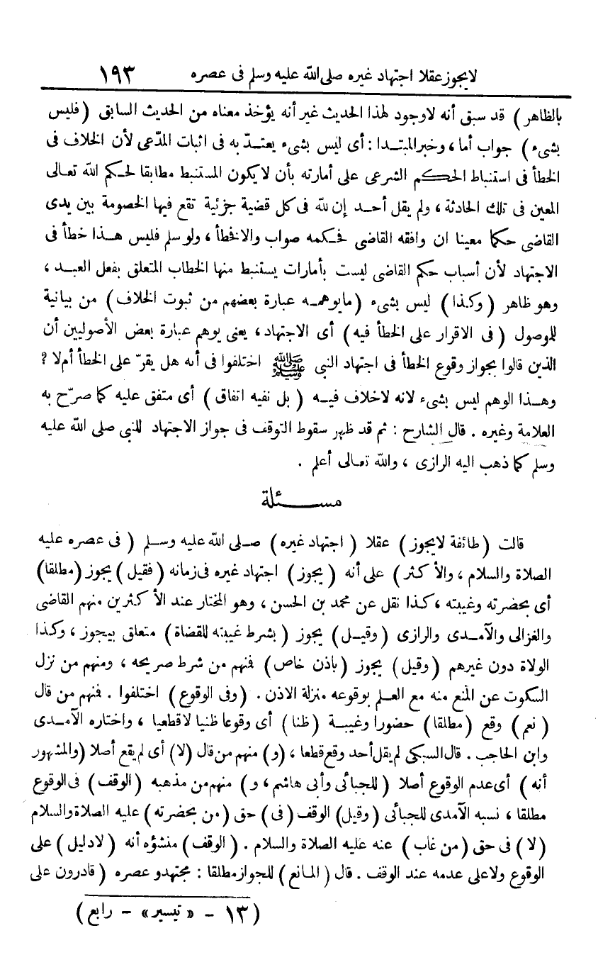قَالَت (طَائِفَة لَا يجوز) عقلا (اجْتِهَاد غَيره) صلى الله عَلَيْهِ وَسلم (فِي عصره صلى الله عَلَيْهِ وَسلم، وَالْأَكْثَر) على أَنه (يجوز) اجْتِهَاد غَيره فِي زَمَانه (فَقيل) يجوز (مُطلقًا) أَي بِحَضْرَتِهِ وغيبته، كَذَا نقل عَن مُحَمَّد بن الْحسن، وَهُوَ الْمُخْتَار عِنْد الْأَكْثَرين مِنْهُم القَاضِي وَالْغَزالِيّ والآمدي والرازي (وَقيل) يجوز (بِشَرْط غيبته للقضاة) مُتَعَلق بيجوز، وَكَذَا الْوُلَاة دون غَيرهم (وَقيل) يجوز (بِإِذن خَاص) فَمنهمْ من شَرط صَرِيحه، وَمِنْهُم من نزل السُّكُوت عَن الْمَنْع مِنْهُ مَعَ الْعلم بِوُقُوعِهِ منزلَة الْإِذْن. (وَفِي الْوُقُوع) اخْتلفُوا. فَمنهمْ من قَالَ (نعم) وَقع (مُطلقًا) حضورا وغيبة (ظنا) أَي وقوعا ظنيا لَا قَطْعِيا، وَاخْتَارَهُ الْآمِدِيّ وَابْن الْحَاجِب. قَالَ السُّبْكِيّ لم يقل أحد وَقع قطعا، (و) مِنْهُم من قَالَ (لَا) أَي لم يَقع أصلا (وَالْمَشْهُور أَنه) أَي عدم الْوُقُوع أصلا (للجبائي وَأبي هَاشم، و) مِنْهُم من مذْهبه (الْوَقْف) فِي الْوُقُوع مُطلقًا، نسبه الْآمِدِيّ للجبائي (وَقيل) الْوَقْف (فِي) حق (من بِحَضْرَتِهِ) صلى الله عَلَيْهِ وَسلم (لَا) فِي حق (من غَابَ) عَنهُ صلى الله عَلَيْهِ وَسلم. (الْوَقْف) منشؤه أَنه (لَا دَلِيل) على الْوُقُوع وَلَا على عَدمه عِنْد الْوَقْف. قَالَ (الْمَانِع) للْجُوَاز مُطلقًا: مجتهدو عصره (قادرون على