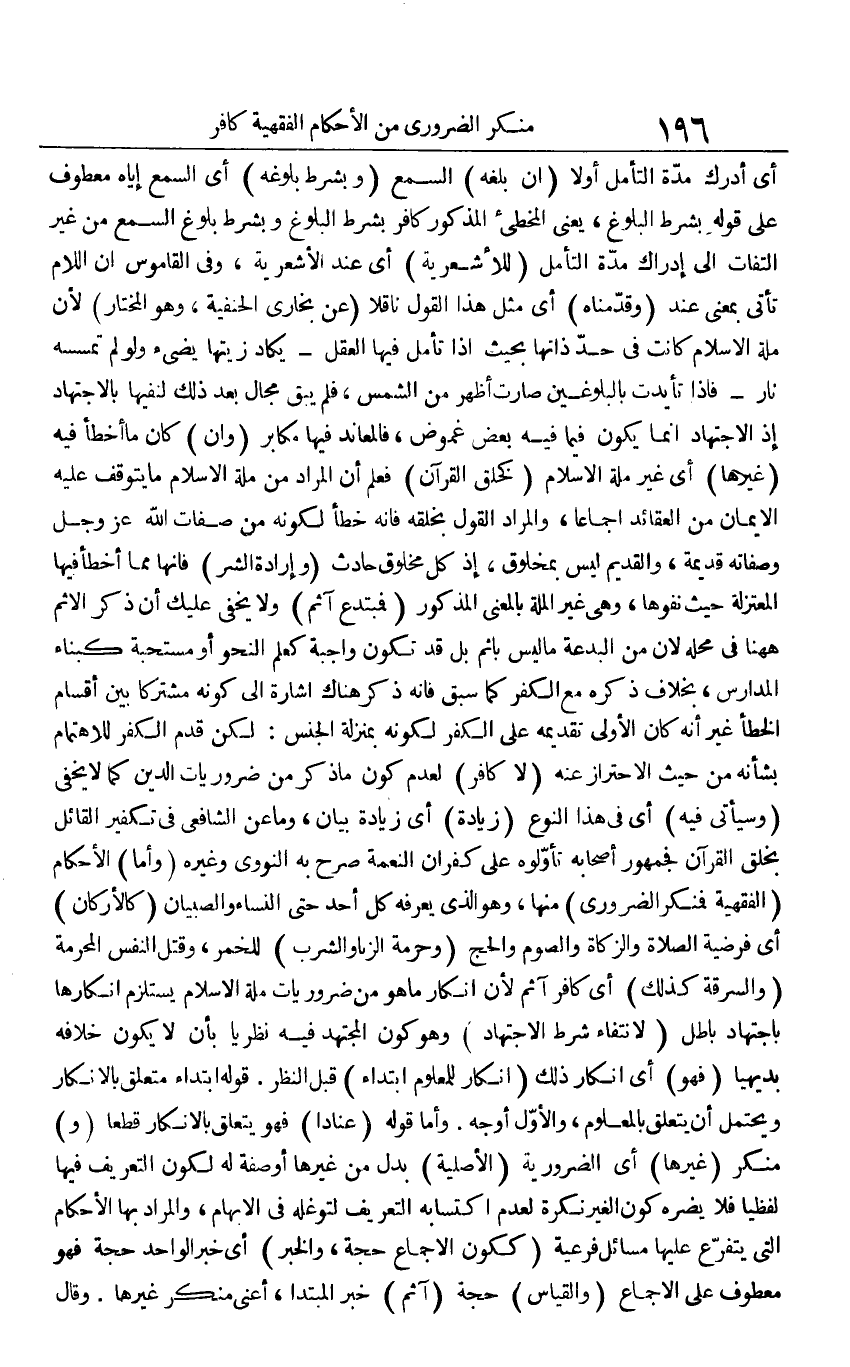 أَي أدْرك مُدَّة التَّأَمُّل أَو لَا (إِن بلغه) السّمع (وبشرط بُلُوغه) أَي السّمع إِيَّاه مَعْطُوف على قَوْله بِشَرْط الْبلُوغ، يَعْنِي الْمُخطئ الْمَذْكُور كَافِر بِشَرْط الْبلُوغ وبشرط بُلُوغ السّمع من غير الْتِفَات إِلَى إِدْرَاك مُدَّة التَّأَمُّل (للأشعرية) أَي عِنْد الأشعرية، وَفِي الْقَامُوس إِن اللَّام تَأتي بِمَعْنى عِنْد (وقدمناه) أَي مثل هَذَا القَوْل نَاقِلا (عَن بُخَارى الْحَنَفِيَّة، وَهُوَ الْمُخْتَار) لِأَن مِلَّة الْإِسْلَام كَانَت فِي حد ذَاتهَا بِحَيْثُ إِذا تَأمل فِيهَا الْعقل - يكَاد زيتها يضيء وَلَو لم تمسسه نَار} - فَإِذا تأيدت بالبلوغين صَارَت أظهر من الشَّمْس، فَلم يبْق مجَال بعد ذَلِك لنفيها بِالِاجْتِهَادِ إِذْ الِاجْتِهَاد إِنَّمَا يكون فِيمَا فِيهِ بعض غموض، فالمعاند فِيهَا مكابر (وَإِن) كَانَ مَا أَخطَأ فِيهِ (غَيرهَا أَي غير مِلَّة الْإِسْلَام (كخلق الْقُرْآن) فَعلم أَن المُرَاد من مِلَّة الْإِسْلَام مَا يتَوَقَّف عَلَيْهِ الْإِيمَان من العقائد إِجْمَاعًا، وَالْمرَاد القَوْل بخلقه فَإِنَّهُ خطأ لكَونه من صِفَات الله عز وَجل وَصِفَاته قديمَة، وَالْقَدِيم لَيْسَ بمخلوق، إِذْ كل مَخْلُوق حَادث (وَإِرَادَة الشَّرّ) فَإِنَّهَا مِمَّا أَخطَأ فِيهَا الْمُعْتَزلَة حَيْثُ نفوها، وَهِي غير الْملَّة بِالْمَعْنَى الْمَذْكُور (فمبتدع آثم) وَلَا يخفى عَلَيْك أَن ذكر الْإِثْم هَهُنَا فِي مَحَله لِأَن من الْبِدْعَة مَا لَيْسَ بإثم بل قد تكون وَاجِبَة كعلم النَّحْو أَو مُسْتَحبَّة كبناء الْمدَارِس، بِخِلَاف ذكره مَعَ الْكفْر كَمَا سبق فَإِنَّهُ ذكر هُنَاكَ إِشَارَة إِلَى كَونه مُشْتَركا بَين أَقسَام الْخَطَأ غير أَنه كَانَ الأولى تَقْدِيمه على الْكفْر لكَونه بِمَنْزِلَة الْجِنْس: لَكِن قدم الْكفْر للاهتمام بِشَأْنِهِ من حَيْثُ الِاحْتِرَاز عَنهُ (لَا كَافِر) لعدم كَون مَا ذكر من ضروريات الدّين كَمَا لَا يخفى (وَسَيَأْتِي فِيهِ) أَي فِي هَذَا النَّوْع (زِيَادَة) أَي زِيَادَة بَيَان، وَمَا عَن الشَّافِعِي فِي تَكْفِير الْقَائِل بِخلق الْقُرْآن فجمهور أَصْحَابه تأولوه على كفران النِّعْمَة صرح بِهِ النَّوَوِيّ وَغَيره (وَأما) الْأَحْكَام (الْفِقْهِيَّة فمنكر الضَّرُورِيّ) مِنْهَا، وَهُوَ الَّذِي يعرفهُ كل أحد حَتَّى النِّسَاء وَالصبيان (كالأركان) أَي فَرضِيَّة الصَّلَاة وَالزَّكَاة وَالصَّوْم وَالْحج (وَحُرْمَة الزِّنَا وَالشرب) للخمر، وَقتل النَّفس الْمُحرمَة (وَالسَّرِقَة كَذَلِك) أَي كَافِر آثم لِأَن إِنْكَار مَا هُوَ من ضروريات مِلَّة الْإِسْلَام يسْتَلْزم إنكارها بِاجْتِهَاد بَاطِل (لانْتِفَاء شَرط الِاجْتِهَاد) وَهُوَ كَون الْمُجْتَهد فِيهِ نظريا بِأَن لَا يكون خِلَافه بديهيا (فَهُوَ) أَي إِنْكَار ذَلِك (إِنْكَار للمعلوم ابْتِدَاء) قبل النّظر. قَوْله ابْتِدَاء مُتَعَلق بالإنكار وَيحْتَمل أَن يتَعَلَّق بالمعلوم، وَالْأول أوجه. وَأما قَوْله (عنادا) فَهُوَ يتَعَلَّق بالإنكار قطعا (و) مُنكر (غَيرهَا) أَي الضرورية (الْأَصْلِيَّة) بدل من غَيرهَا أَو صفة لَهُ لكَون التَّعْرِيف فِيهَا لفظيا فَلَا يضرّهُ كَون الْغَيْر نكرَة لعدم اكتسابه التَّعْرِيف لتوغله فِي الْإِبْهَام، وَالْمرَاد بهَا الْأَحْكَام الَّتِي يتَفَرَّع عَلَيْهَا مسَائِل فرعية (ككون الْإِجْمَاع حجَّة، وَالْخَبَر) أَي خبر الْوَاحِد حجَّة فَهُوَ مَعْطُوف على الْإِجْمَاع (وَالْقِيَاس) حجَّة (آثم) خبر الْمُبْتَدَأ، أَعنِي مُنكر غَيرهَا. وَقَالَ