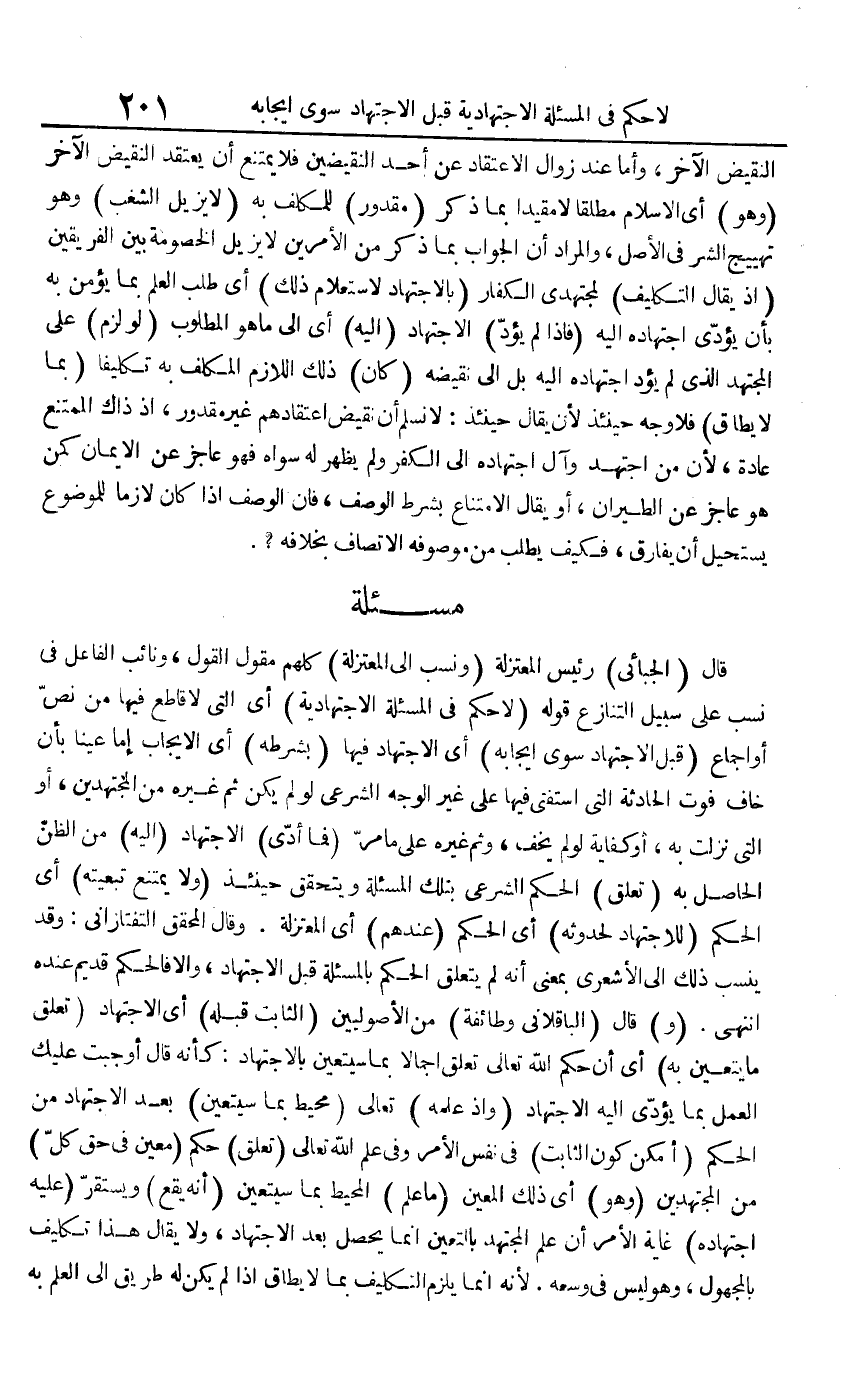 قَالَ (الجبائي) رَئِيس الْمُعْتَزلَة (وَنسب إِلَى الْمُعْتَزلَة) كلهم مقول القَوْل، ونائب الْفَاعِل فِي نسب على سَبِيل التَّنَازُع قَوْله (لَا حكم فِي المسئلة الاجتهادية) أَي الَّتِي لَا قَاطع فِيهَا من نَص أَو إِجْمَاع (قبل الِاجْتِهَاد سوى إِيجَابه) أَي الِاجْتِهَاد فِيهَا (بِشَرْطِهِ) أَي الْإِيجَاب إِمَّا عينا بِأَن خَافَ فَوت الْحَادِثَة الَّتِي استفتى فِيهَا على غير الْوَجْه الشَّرْعِيّ لَو لم يكن ثمَّ غَيره من الْمُجْتَهدين، أَو الَّتِي نزلت بِهِ، أَو كِفَايَة لَو لم يخف، وَثمّ غَيره على مَا مر (فَمَا أدّى) الِاجْتِهَاد (إِلَيْهِ) من الظَّن الْحَاصِل بِهِ (تعلق) الحكم الشَّرْعِيّ بِتِلْكَ المسئلة ويتحقق حِينَئِذٍ (وَلَا يمْتَنع تبعيته) أَي الحكم (للِاجْتِهَاد لحدوثه) أَي الحكم (عِنْدهم) أَي الْمُعْتَزلَة. وَقَالَ الْمُحَقق التَّفْتَازَانِيّ: وَقد ينْسب ذَلِك إِلَى الْأَشْعَرِيّ بِمَعْنى أَنه لم يتَعَلَّق الحكم بالمسئلة قبل الِاجْتِهَاد، وَإِلَّا فَالْحكم قديم عِنْده انْتهى. (و) قَالَ (الباقلاني وَطَائِفَة) من الْأُصُولِيِّينَ (الثَّابِت قبله) أَي الِاجْتِهَاد (تعلق مَا يتَعَيَّن بِهِ) أَي أَن حكم الله تَعَالَى تعلق إِجْمَالا بِمَا سيتعين بِالِاجْتِهَادِ: كَأَنَّهُ قَالَ لَو أوجبت عَلَيْك الْعَمَل بِمَا يُؤَدِّي إِلَيْهِ الِاجْتِهَاد (وَإِذ علمه) تَعَالَى (مُحِيط بِمَا سيتعين) بعد الِاجْتِهَاد من الحكم (أمكن كَون الثَّابِت) فِي نفس الْأَمر وَفِي علم الله تَعَالَى (تعلق) حكم (معِين فِي حق كل) من الْمُجْتَهدين (وَهُوَ) أَي ذَلِك الْمعِين (مَا علم) الْمُحِيط بِمَا سيتعين (أَنه يَقع) ويستقر (عَلَيْهِ اجْتِهَاده) غَايَة الْأَمر أَن علم الْمُجْتَهد بالتعين إِنَّمَا يحصل بعد الِاجْتِهَاد، وَلَا يُقَال هَذَا تَكْلِيف بِالْمَجْهُولِ، وَهُوَ لَيْسَ فِي وَسعه. لِأَنَّهُ إِنَّمَا يلْزم التَّكْلِيف بِمَا لَا يُطَاق إِذا لم يكن لَهُ طَرِيق إِلَى الْعلم بِهِ