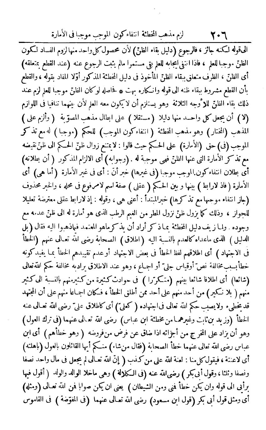 إِلَى قَوْله لكنه جَائِز، فالرجوع (دَلِيل بَقَاء الظَّن) لِأَن محصول كل وَاحِد مِنْهَا لُزُوم الْفساد لكَون الظَّن مُوجبا للْعلم، فَإِذا انْتَفَى إِيجَابه للْعلم بَقِي مستمرا مَا لم يثبت الرُّجُوع عَنهُ (عِنْد الْقطع بمتعلقه) أَي الظَّن، الظّرْف مُتَعَلق بِبَقَاء الظَّن الْمَأْخُوذ فِي دَلِيل المخطئة الْمَذْكُور أَولا المفاد بقوله، وَالْقطع بِأَن الْقطع مَشْرُوط بِبَقَاء ظَنّه إِلَى قَوْله وإنكاره بهت فحاصله لَو كَانَ الظَّن مُوجبا للْعلم لزم عِنْد ذَلِك بَقَاء الظَّن للأوجه الثَّلَاثَة وَهُوَ يسْتَلْزم أَن لَا يكون مَعَه الْعلم لِأَن بَينهمَا تنافيا فِي اللوازم (لَا) أَن يَجْعَل كل وَاحِد مِنْهَا دَلِيلا (مُسْتقِلّا) على إبِْطَال مَذْهَب المصوبة (وألزم على) الْمَذْهَب (الْمُخْتَار) وَهُوَ مَذْهَب المخطئة (انْتِفَاء كَون الْمُوجب) للْحكم (مُوجبا) لَهُ مَعَ تذكر الْمُوجب (فِي) حق (الأمارة) على الحكم حَيْثُ قَالُوا: لَا يمْتَنع زَوَال ظن الحكم إِلَى ظن نقيضه مَعَ تذكر الأمارة الَّتِي عَنْهَا الظَّن فَهِيَ مُوجبَة لَهُ (وَجَوَابه) أَي الْإِلْزَام الْمَذْكُور (أَن بُطْلَانه) أَي بطلَان انْتِفَاء كَون الْمُوجب مُوجبا (فِي غَيرهَا) خبر أَن: أَي فِي غير الأمارة (أما هِيَ) أَي الأمارة (فَإذْ لَا رابط) بَينهَا وَبَين الحكم (عَقْلِي) صفة اسْم لَا مَرْفُوع فِي مَحَله، وَالْخَبَر مَحْذُوف (جَازَ انْتِفَاء مُوجبهَا مَعَ تذكرها) خبر الْمُبْتَدَأ: أَعنِي هِيَ، وَقَوله: إِذْ لَا رابط عَقْلِي مُعْتَرضَة تعليلا للْجُوَاز، وَذَلِكَ كَمَا يَزُول ظن نزُول الْمَطَر من الْغَيْم الرطب الَّذِي هُوَ أَمارَة لَهُ إِلَى ظن عَدمه مَعَ وجوده. وَلما زيف دَلِيل المخطئة بِمَا ذكر أَرَادَ أَن يذكر مَا هُوَ الْمُعْتَمد فِيمَا ذَهَبُوا إِلَيْهِ فَقَالَ (بل الدَّلِيل) الَّذِي مَا عداهُ كَالْعدمِ بِالنِّسْبَةِ إِلَيْهِ (إِطْلَاق) الصَّحَابَة رَضِي الله تَعَالَى عَنْهُم (الْخَطَأ فِي الِاجْتِهَاد) أَي إِطْلَاقهم لفظ الْخَطَأ فِي بعض الِاجْتِهَاد أَو عدم تقييدهم الْخَطَأ بِمَا يُفِيد كَونه خطأ بِسَبَب مُخَالفَة نَص أَو قِيَاس جلي أَو إِجْمَاع، وَهُوَ عِنْد الْإِطْلَاق يُرَاد بِهِ مُخَالفَة حكم الله تَعَالَى (شَائِعا) أَي إطلاقا شَائِعا بَينهم (متكررا) فِي حوادث كَثِيرَة من كثير مِنْهُم بِالنِّسْبَةِ إِلَى كثير مِنْهُم (بِلَا نَكِير) من أحد مِنْهُم على أحد مِمَّن أطلق الْخَطَأ، فَكَانَ إِجْمَاعًا مِنْهُم على أَن الْمُجْتَهد قد يُخطئ وَلَا يُصِيب حكم الله تَعَالَى فِي اجْتِهَاده (كعلي) أَي كإطلاق عَليّ رَضِي الله تَعَالَى عَنهُ الْخَطَأ (وَزيد بن ثَابت وَغَيرهمَا من مخطئة ابْن عَبَّاس) رَضِي الله تَعَالَى عَنْهُمَا (فِي ترك الْعَوْل) وَهُوَ أَن يُزَاد على الْمخْرج من أَجْزَائِهِ إِذْ ضَاقَ عَن فرض من فروضه (وَهُوَ خطأهم) أَي ابْن عَبَّاس رَضِي الله تَعَالَى عَنْهُمَا خطأ الصَّحَابَة (فَقَالَ من شَاءَ) مِنْكُم أَيهَا الْقَائِلُونَ بالعول (باهلته) أَي لَاعَنته، فَيَقُول كل منا: لعنة الله على من كذب (إِن الله تَعَالَى لم يَجْعَل فِي مَال وَاحِد نصفا وَنصفا وَثلثا، وَقَول أبي بكر) رَضِي الله عَنهُ (فِي الْكَلَالَة) وَهِي مَا خلا الْوَالِد وَالْولد (أَقُول فِيهَا برأيي إِلَى قَوْله وَإِن يكن خطأ فمني وَمن الشَّيْطَان) يَعْنِي إِن يكن صَوَابا فَمن الله تَعَالَى (وَمثله) أَي وَمثل قَول أبي بكر (قَول ابْن مَسْعُود) رَضِي الله تَعَالَى عَنْهُمَا (فِي المفوضة) فِي الْقَامُوس
