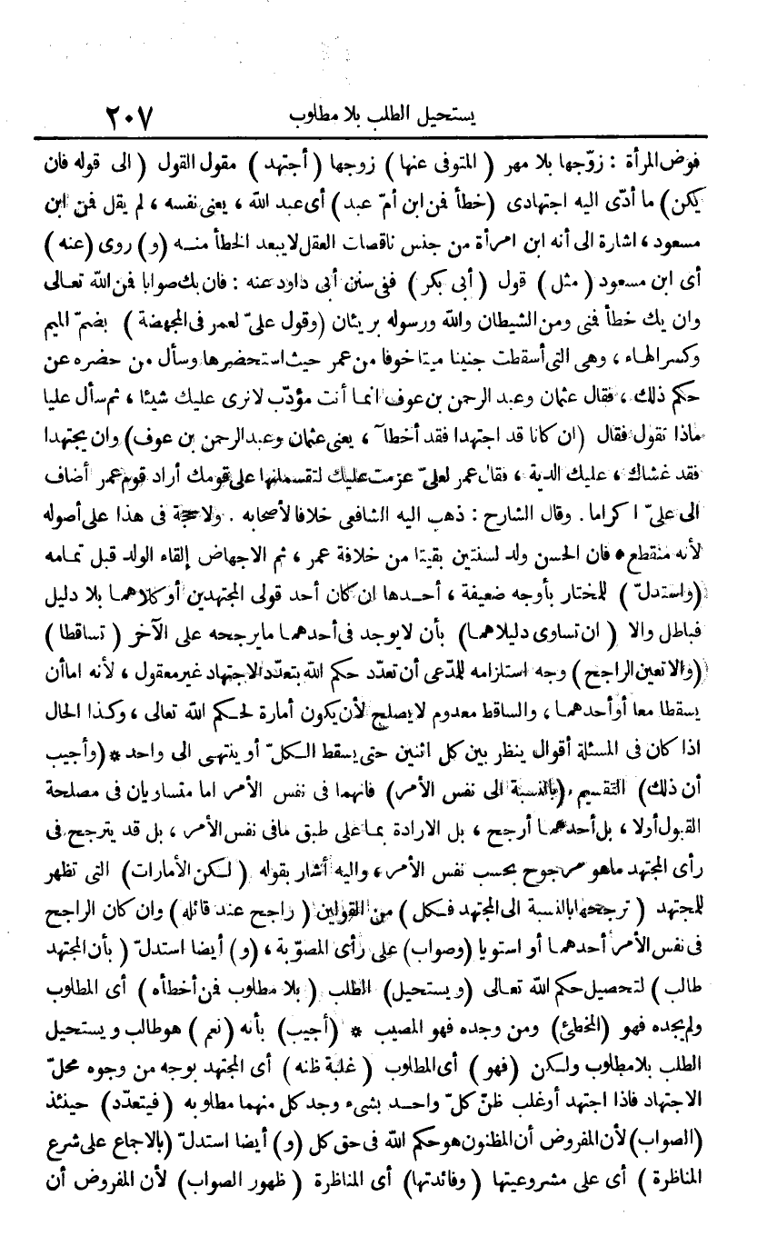 فوض الْمَرْأَة: زَوجهَا بِلَا مهر (الْمُتَوفَّى عَنْهَا) زَوجهَا (أجتهد) مقول القَوْل (إِلَى قَوْله فَإِن يكن) مَا أدّى إِلَيْهِ اجتهادي (خطأ فَمن ابْن أم عبد) أَي عبد الله، يَعْنِي نَفسه، لم يقل فَمن ابْن مَسْعُود، إِشَارَة إِلَى أَنه ابْن امْرَأَة من جنس ناقصات الْعقل لَا يبعد الْخَطَأ مِنْهُ (و) روى (عَنهُ) أَي ابْن مَسْعُود (مثل) قَول (أبي بكر) فَفِي سنَن أبي دَاوُد عَنهُ: فَإِن بك صَوَابا فَمن الله تَعَالَى وَإِن يَك خطأ فمني وَمن الشَّيْطَان وَالله وَرَسُوله بريئان (وَقَول عَليّ لعمر فِي المجهضة) بِضَم الْمِيم وَكسر الْهَاء وَهِي الَّتِي أسقطت جَنِينا مَيتا خوفًا من عمر حَيْثُ استحضرها وَسَأَلَ من حَضَره عَن حكم ذَلِك، فَقَالَ عُثْمَان وَعبد الرَّحْمَن بن عَوْف إِنَّمَا أَنْت مؤدب لَا نرى عَلَيْك شَيْئا، ثمَّ سَأَلَ عليا مَاذَا تَقول فَقَالَ (إِن كَانَا قد اجتهدا فقد أخطآ، يَعْنِي عُثْمَان وَعبد الرَّحْمَن بن عَوْف) وَإِن يجتهدا فقد غشاك، عَلَيْك الدِّيَة، فَقَالَ عمر لعَلي عزمت عَلَيْك لتقسمانها على قَوْمك أَرَادَ قوم عمر أضَاف إِلَى عَليّ إِكْرَاما. وَقَالَ الشَّارِح: ذهب إِلَيْهِ الشَّافِعِي خلافًا لأَصْحَابه. وَلَا حجَّة فِي هَذَا على أُصُوله لِأَنَّهُ مُنْقَطع، فَإِن الْحسن ولد لِسنتَيْنِ بَقِيَتَا من خلَافَة عمر، ثمَّ الإجهاض إِلْقَاء الْوَلَد قبل تَمَامه (وَاسْتدلَّ) للمختار بأوجه ضَعِيفَة، أَحدهَا إِن كَانَ أحد قولي الْمُجْتَهدين أَو كِلَاهُمَا بِلَا دَلِيل فَبَاطِل وَإِلَّا (إِن تساوى دليلاهما) بِأَن لَا يُوجد فِي أَحدهمَا مَا يرجحه على الآخر (تساقطا) (وَإِلَّا تعين الرَّاجِح) وَجه استلزامه للْمُدَّعِي أَن تعدد حكم الله بِتَعَدُّد الِاجْتِهَاد غير مَعْقُول، لِأَنَّهُ إِمَّا أَن يسقطا مَعًا أَو أَحدهمَا، والساقط مَعْدُوم لَا يصلح لِأَن يكون أَمارَة لحكم الله تَعَالَى، وَكَذَا الْحَال إِذا كَانَ فِي المسئلة أَقْوَال ينظر بَين كل اثْنَيْنِ حَتَّى يسْقط الْكل أَو يَنْتَهِي إِلَى وَاحِد (وَأجِيب أَن ذَلِك) التَّقْسِيم (بِالنِّسْبَةِ إِلَى نفس الْأَمر) فَإِنَّهُمَا فِي نفس الْأَمر إِمَّا متساويان فِي مصلحَة الْقبُول أَو لَا، بل أَحدهمَا أرجح، بل الْإِرَادَة بِمَا على طبق مَا فِي نفس الْأَمر، بل قد يتَرَجَّح فِي رَأْي الْمُجْتَهد مَا هُوَ مَرْجُوح بِحَسب نفس الْأَمر، وَإِلَيْهِ أَشَارَ بقوله (لَكِن الأمارات) الَّتِي تظهر للمجتهد (ترجحها بِالنِّسْبَةِ إِلَى الْمُجْتَهد فَكل) من الْقَوْلَيْنِ (رَاجِح عِنْد قَائِله) وَإِن كَانَ الرَّاجِح فِي نفس الْأَمر أَحدهمَا أَو اسْتَويَا (وصواب) على رَأْي المصوبة، (و) أَيْضا اسْتدلَّ (بِأَن الْمُجْتَهد طَالب) لتَحْصِيل حكم الله تَعَالَى (ويستحيل) الطّلب (بِلَا مَطْلُوب فَمن أخطأه) أَي الْمَطْلُوب وَلم يجده فَهُوَ (الْمُخطئ) وَمن وجده فَهُوَ الْمُصِيب (أُجِيب) بِأَنَّهُ (نعم) هُوَ طَالب ويستحيل الطّلب بِلَا مَطْلُوب وَلَكِن (فَهُوَ) أَي الْمَطْلُوب (غَلَبَة ظَنّه) أَي الْمُجْتَهد بِوَجْه من وُجُوه مَحل الِاجْتِهَاد فَإِذا اجْتهد أَو غلب ظن كل وَاحِد بِشَيْء وجد كل مِنْهُمَا مَطْلُوبه (فيتعدد) حِينَئِذٍ (الصَّوَاب) لِأَن الْمَفْرُوض أَن المظنون هُوَ حكم الله فِي حق كل (و) أَيْضا اسْتدلَّ (بِالْإِجْمَاع على شرع المناظرة) أَي على مشروعيتها (وفائدتها) أَي المناظرة (ظُهُور الصَّوَاب) لِأَن الْمَفْرُوض أَن