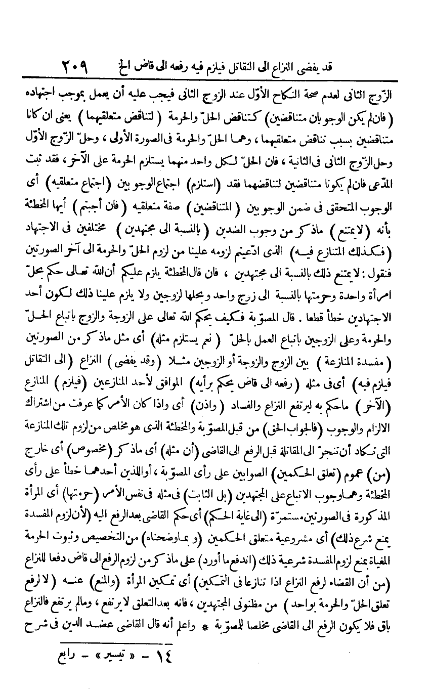 الزَّوْج الثَّانِي لعدم صِحَة النِّكَاح الأول عِنْد الزَّوْج الثَّانِي فَيجب عَلَيْهِ أَن يعْمل بِمُوجب اجْتِهَاده (فَإِن لم يكن الوجوبان متناقضين) كتناقض الْحل وَالْحُرْمَة (لتناقض متعلقيهما) يَعْنِي إِن كَانَا متناقضين بِسَبَب تنَاقض متعلقيهما، وهما الْحل وَالْحُرْمَة فِي الصُّورَة الأولى، وَحل الزَّوْج الأول وَحل الزَّوْج الثَّانِي فِي الثَّانِيَة، فَإِن الْحل لكل وَاحِد مِنْهُمَا يسْتَلْزم الْحُرْمَة على الآخر، فقد ثَبت الْمُدعى فَإِن لم يَكُونَا متناقضين لتناقضهما فقد (استلزم) اجْتِمَاع الوجوبين (اجْتِمَاع متعلقيه) أَي الْوُجُوب المتحقق فِي ضمن الوجوبين (المتناقضين) صفة متعلقية (فَإِن أجبتم) أَيهَا المخطئة بِأَنَّهُ (لَا يمْتَنع) مَا ذكر من وجوب الضدين (بِالنِّسْبَةِ إِلَى مجتهدين) مُخْتَلفين فِي الِاجْتِهَاد (فَكَذَلِك الْمُتَنَازع فِيهِ) الَّذِي ادعيتم لُزُومه علينا من لُزُوم الْحل وَالْحُرْمَة إِلَى آخر الصُّورَتَيْنِ فَنَقُول: لَا يمْتَنع ذَلِك بِالنِّسْبَةِ إِلَى مجتهدين، فَإِن قَالَ المخطئة يلْزم عَلَيْكُم أَن الله تَعَالَى حكم بِحل امْرَأَة وَاحِدَة وحرمتها بِالنِّسْبَةِ إِلَى زوج وَاحِد وبحلها لزوجين وَلَا يلْزم علينا ذَلِك لكَون أحد الاجتهادين خطأ قطعا. قَالَ المصوبة فَكيف يحكم الله تَعَالَى على الزَّوْجَة وَالزَّوْج بِاتِّبَاع الْحل وَالْحُرْمَة وعَلى الزَّوْجَيْنِ بِاتِّبَاع الْعَمَل بِالْحلِّ (نعم يسْتَلْزم مثله) أَي مثل مَا ذكر من الصُّورَتَيْنِ (مفْسدَة الْمُنَازعَة) بَين الزَّوْج وَالزَّوْجَة أَو الزَّوْجَيْنِ مثلا (وَقد يُفْضِي) النزاع (إِلَى التقاتل فَيلْزم فِيهِ) أَي فِي مثله (رَفعه إِلَى قَاض يحكم بِرَأْيهِ) الْمُوَافق لأحد المنازعين (فَيلْزم) المنازع (الآخر) مَا حكم بِهِ ليرتفع النزاع وَالْفساد (واذن) أَي وَإِذا كَانَ الْأَمر كَمَا عرفت من اشْتِرَاك الْإِلْزَام وَالْوُجُوب (فَالْجَوَاب الْحق) من قبل المصوبة والمخطئة الَّذِي هُوَ مخلص من لُزُوم تِلْكَ الْمُنَازعَة الَّتِي تكَاد أَن تنجر إِلَى الْمُقَاتلَة قبل الرّفْع إِلَى القَاضِي (أَن مثله) أَي مَا ذكر (مَخْصُوص) أَي خَارج (من) عُمُوم (تعلق الْحكمَيْنِ) الصوابين على رَأْي المصوبة، أَو اللَّذين أَحدهمَا خطأ على رَأْي المخطئة وهما وجوب الِاتِّبَاع على الْمُجْتَهدين (بل الثَّابِت) فِي مثله فِي نفس الْأَمر (حرمتهَا) أَي الْمَرْأَة الْمَذْكُورَة فِي الصُّورَتَيْنِ مستمرة (إِلَى غَايَة الحكم) أَي حكم القَاضِي بعد الرّفْع إِلَيْهِ (لِأَن لُزُوم الْمفْسدَة يمْنَع شرع ذَلِك) أَي مَشْرُوعِيَّة مُتَعَلق الْحكمَيْنِ (وَبِمَا وضحناه) من التَّخْصِيص وَثُبُوت الْحُرْمَة المغياة بِمَنْع لُزُوم الْمفْسدَة شَرْعِيَّة ذَلِك (انْدفع مَا أورد) على مَا ذكر من لُزُوم الرّفْع إِلَى قَاض دفعا للنزاع (من أَن الْقَضَاء لرفع النزاع إِذا تنَازعا فِي التَّمْكِين) أَي تَمْكِين الْمَرْأَة (وَالْمَنْع) عَنهُ (لَا لرفع تعلق الْحل وَالْحُرْمَة بِوَاحِد) من مظنوني الْمُجْتَهدين، فَإِنَّهُ بعد التَّعَلُّق لَا يرْتَفع، وَمَا لم يرْتَفع فالنزاع بَاقٍ فَلَا يكون الرّفْع إِلَى القَاضِي مخلصا للمصوبة وَاعْلَم أَنه قَالَ القَاضِي عضد الدّين فِي شرح