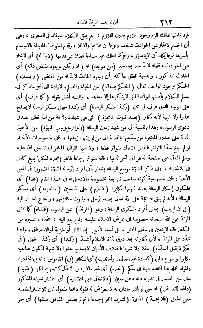 فَرد مَا مِنْهَا للفلك للَزِمَ وجود الْمَلْزُوم بِدُونِ اللَّازِم: نعم يبْقى الْكَلَام حِينَئِذٍ فِي الصُّغْرَى، وَهِي أَن الْجِسْم لَا يَخْلُو عَن الْحَوَادِث شخصا ونوعا إِن تمّ تمّ وَإِلَّا فَلَا، وَقدم الْحَوَادِث المحيطة بالأجسام بأسرها نوعا يكَاد أَن لَا يتَصَوَّر، وحركة الْفلك غير مسلمة فضلا عَن قدمهَا (لَا بُد لَهُ) أَي لَا يَخْلُو عَن الْحَوَادِث، فَقَوله لَا بُد خبر بعد خبر (من موجد) لَهُ (إِذْ لم يكن الْوُجُود مُقْتَضى ذَاته) أَي الْحَادِث الْمَذْكُور، وبديهة الْعقل حاكمة بِأَن وجود الْحَادِث لَا بُد لَهُ من الْمُقْتَضى (ويستلزم) الحكم بِوُجُود الْوَاجِب تَعَالَى (الحكم بصفاته) من الْحَيَاة وَالْعلم والإرادة إِلَى آخر مَا ذكر فِي علم الْكَلَام بأدلتها الْوَاضِحَة الَّتِي لَا ينكرها إِلَّا معاند، وَإِلَيْهِ أَشَارَ بقوله (كَمَا عرف) أَي على الْوَجْه الَّذِي عرف فِي مَحَله (وَكَذَا مُنكر الرسَالَة) أَي وَكَذَا جهل مُنكر الرسَالَة لَا يصلح عذرا وَلَا شُبْهَة لِأَنَّهُ مكابر (بعد ثُبُوت المعجزة) الَّتِي هِيَ شَهَادَة وَاضِحَة من الله تَعَالَى بِصدق دَعْوَى الرَّسُول، وَهَذَا بِالنِّسْبَةِ إِلَى من شهد زمَان الرسَالَة (وتواتر مَا يُوجب النُّبُوَّة) من الْأَخْبَار الدَّالَّة على صُدُور المعجزة من مدعيها بِالنِّسْبَةِ إِلَى من لم يشْهد زمانها، فَإِن خصوصيات الْأَخْبَار لَو لم تبلغ حدا التَّوَاتُر فالقدر الْمُشْتَرك متواتر قطعا، وَلَا سِيمَا الْقُرْآن المعجز لنبينا صلى الله عَلَيْهِ وَسلم الْبَاقِي على صفحة الدَّهْر إِلَى آخر الدُّنْيَا، فانه متواتر إِجْمَاعًا ظَاهر إعجازه لكل بليغ كَامِل فِي بلاغته، وَفِي ذكر النُّبُوَّة مَوضِع الرسَالَة إِشْعَار بِأَن المُرَاد بالرسالة النُّبُوَّة الْمَشْهُورَة فِي الْمَعْنى الْأَعَمّ، فَإِن خُصُوصِيَّة كَونه صَاحب شَرِيعَة مَخْصُوصَة مَا لَا دخل لَهُ فِي هَذَا الْمقَام (فَلِذَا) أَي فلكون إِنْكَار الرسَالَة بعد ثُبُوتهَا مُكَابَرَة (لَا تلْزم) على الْمُسلمين (مناظرته) أَي مُنكر الرسَالَة، لِأَنَّهُ لم يبْق لَهُ حجَّة على الله تَعَالَى بعد الرُّسُل، وَثُبُوت معجزتهم، وبلوغ الْخَبَر إِلَيْهِ (بل إِن لم يتب) بعض أَفْرَاد منكري الرسَالَة، وَهُوَ (الْمُرْتَد) عَن الرَّسُول (قَتَلْنَاهُ) كَمَا نقْتل الْمُرْتَد عَن الله سُبْحَانَهُ خُصُوصا إِن عرض الْإِسْلَام عَلَيْهِ وَلم يرجع إِلَيْهِ، بِخِلَاف غَيره من الْكفَّار فَإِنَّهُ لَا يتَعَيَّن فِي حَقهم الْقَتْل، بل أحد الْأُمُور: إِمَّا الْقَتْل أَو الْجِزْيَة أَو الاسترقاق، وَإِنَّمَا شدد على الْمُرْتَد، لِأَن مكابرته بُد ذوق لَذَّة الْإِسْلَام أَشد (وَكَذَا) أَي وَكَذَا الْجَهْل (فِي حكم لَا يقبل التبدل) عقلا وَلَا شرعا باخْتلَاف الْأَدْيَان لَا يصلح عذرا وَلَا شُبْهَة لكَون صَاحبه مكابرا لوضوح دَلِيله (كعبادة غَيره تَعَالَى. وَأما تدينه) أَي الْكَافِر (فِي) الْقَامُوس: تدين اتخذ دينا وَالْمرَاد عمله بِمَا اتَّخذهُ دينا فِي حكم (غَيره) أَي غير مَا لَا يقبل التبدل كتحريم الْخمر (ذِمِّيا) حَال من الضَّمِير فِي تدينه فَإِنَّهُ فَاعل معِين (فالاتفاق على اعْتِبَاره) أَي اعْتِبَار تدينه الْمَذْكُور (دافعا للتعرض) لَهُ حَتَّى لَو بَاشر مَا دَان بِهِ لَا يتَعَرَّض لَهُ فَقَوله دافعا مفعول ثَان للاعتبار لتَضَمّنه معنى الْجعل (فَلَا يحد) الذِّمِّيّ (لشرب الْخمر إِجْمَاعًا، ثمَّ لم يضمن الشَّافِعِي متلفها) أَي خمر