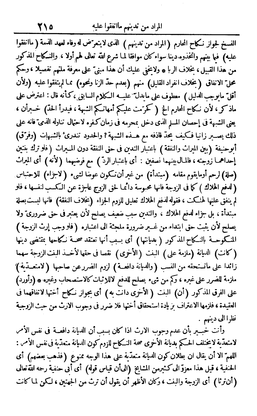 النّسخ لجَوَاز نِكَاح الْمَحَارِم (المُرَاد من تدينهم) الَّذِي لَا يتَعَرَّض لَهُ وَفَاء لعهد الذِّمَّة (مَا اتَّفقُوا عَلَيْهِ) فِيمَا بَينهم واتخذوه دينا سَوَاء كَانَ مُوَافقا لما شرع الله تَعَالَى لَهُم أَو لَا، وَالنِّكَاح الْمَذْكُور من هَذَا الْقَبِيل، بِخِلَاف الرِّبَا وَلَا يخفى عَلَيْك أَن هَذَا مَبْنِيّ على معرفَة ملتهم تَفْصِيلًا، وَحكم مَحل الِاتِّفَاق (بِخِلَاف انْفِرَاد الْقَلِيل) مِنْهُم (بِعَدَمِ حد الزِّنَا وَنَحْوه) مِمَّا لم يتفقوا عَلَيْهِ (وَلِأَن أقل مَا يُوجب الدَّلِيل) مَعْطُوف على مَا يدل عَلَيْهِ الْكَلَام السَّابِق، كَأَنَّهُ قَالَ: اعْترض على مَا ذكر لِأَن نِكَاح الْمَحَارِم الخ (كحرمت عَلَيْكُم أُمَّهَاتكُم الشُّبْهَة، فيدرأ الْحَد) خبر أَن، يَعْنِي الشُّبْهَة فِي إِحْصَان الْمُسلم الَّذِي دخل بمحرمه فِي زمَان كفره لاحْتِمَال تنَاوله الذِّمِّيّ فَإِنَّهُ على ذَلِك يصير زَانيا فَكيف يحد قَاذفه مَعَ هَذِه الشُّبْهَة؟ وَالْحُدُود تندرئ بِالشُّبُهَاتِ (وَفرق) أَبُو حنيفَة (بَين الْمِيرَاث وَالنَّفقَة) بِاعْتِبَار التدين فِي حق النَّفَقَة دون الْمِيرَاث (فَلَو ترك بنتين إِحْدَاهمَا زَوجته، فَالْمَال بَينهمَا نِصْفَيْنِ: أَي بِاعْتِبَار الرَّد) مَعَ فرضيهما (لِأَنَّهُ) أَي الْمِيرَاث (صلَة) لرحم أَو مَا يقوم مقَامه (مُبتَدأَة) من غير أَن تكون عوضا لشَيْء (لَا جَزَاء) للاحتباس (لدفع الْهَلَاك) كَمَا فِي الزَّوْجَة فَإِنَّهَا محبوسة دَائِما لحق الزَّوْج عاجزة عَن الْكسْب لنَفسهَا، فَلَو لم ينْفق عَلَيْهَا لهلكت، فَقَوله لدفع الْهَلَاك تَعْلِيل للُزُوم الْجَزَاء (بِخِلَاف النَّفَقَة) فَإِنَّهَا لَيست بصلَة مُبتَدأَة، بل جَزَاء لدفع الْهَلَاك، والتدين سَبَب ضَعِيف يصلح لِأَن يعْتَبر فِي حق ضَرُورِيّ وَلَا يصلح لِأَن يثبت حق ابْتِدَاء من غير ضَرُورَة ملجئة إِلَى اعْتِبَاره (فَلَو وَجب إِرْث الزَّوْجَة) الْمَنْكُوحَة بِالنِّكَاحِ الْمَذْكُور (بديانتها) أَي بِسَبَب أَنَّهَا تعتقد صِحَة نِكَاحهَا بِمُقْتَضى دينهَا (كَانَت) الدّيانَة (ملزمة على) الْبِنْت (الْأُخْرَى) نقصا فِي حَقّهَا لأخذ الْبِنْت الزَّوْجَة سَهْما زَائِدا على مَا تستحقه من النّسَب (والديانة دافعة) لُزُوم الضَّرَر عَن صَاحبهَا (لَا متعدية) ملزمة للضَّرَر على غَيره، وَكم من شَيْء يصلح للدَّفْع لَا للإثبات كالاستصحاب وَغَيره (وَأورد) على الْفرق الْمَذْكُور (أَن) الْبِنْت (الْأُخْرَى دَانَتْ بِهِ) أَي بِجَوَاز نِكَاح أُخْتهَا لاتِّفَاقهمَا فِي العقيدة، فلزمها الِاعْتِرَاف بِزِيَادَة اسْتِحْقَاق أُخْتهَا فَلَا ضَرَر فِي وجوب الْإِرْث من حَيْثُ الزَّوْجِيَّة نظرا إِلَى دينهم.