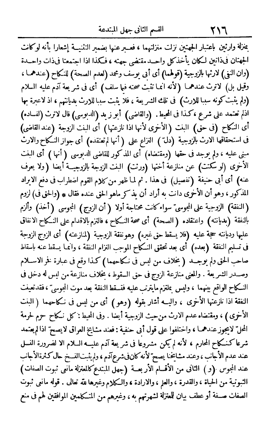 بِمَنْزِلَة وارثين بِاعْتِبَار الْجِهَتَيْنِ نزلت منزلتهما، فَعبر عَنْهَا بضمير التَّثْنِيَة إشعارا بِأَنَّهُ لَو كَانَت الجهتان فِي ذاتين لَكَانَ يَأْخُذ كل وَاحِد مُقْتَضى جِهَته، فَكَذَا إِذا اجتمعتا فِي ذَات وَاحِدَة (وَأَن النَّفْي) لإرثها بِالزَّوْجِيَّةِ (قَوْلهمَا) أَي أبي يُوسُف وَمُحَمّد (لعدم الصِّحَّة) للنِّكَاح (عِنْدهمَا، وَقيل بل) لَا تَرث عِنْدهمَا (لِأَنَّهُ إِنَّمَا تثبت صِحَّته فِيمَا سلف) أَي فِي شَرِيعَة آدم عَلَيْهِ السَّلَام (وَلم يثبت كَونه سَببا للإرث) فِي تِلْكَ الشَّرِيعَة، فَلَا يثبت سَببا للإرث بديانتهم، إِذْ لَا عِبْرَة بهَا إِذْ لم تعتمد على شرع، كَذَا فِي الْمُحِيط. (وَالْقَاضِي) أَبُو زيد (الدبوسي) قَالَ لَا تَرث (لفساده) أَي النِّكَاح (فِي حق) الْبِنْت (الْأُخْرَى لِأَنَّهَا إِذا نازعتها) أَي الْبِنْت الزَّوْجَة (عِنْد القَاضِي) فِي اسْتِحْقَاقهَا الْإِرْث بِالزَّوْجِيَّةِ (دلّ) النزاع على (أَنَّهَا لم تعتقده) أَي جَوَاز النِّكَاح وَالْإِرْث مَبْنِيّ عَلَيْهِ، وَلم يُوجد فِي حَقّهَا (وَمُقْتَضَاهُ) أَي الْمَذْكُور للْقَاضِي الدبوسي (أَنَّهَا) أَي الْبِنْت الْأُخْرَى (لَو سكتت) عَن مُنَازعَة أُخْتهَا (ورثت) الْبِنْت الزَّوْجَة بِالزَّوْجِيَّةِ أَيْضا (وَلَا يعرف عَنهُ) أَي أبي حنيفَة (تَفْصِيل) فِي هَذَا. ثمَّ لما ظهر من كَلَام الْقَوْم اضْطِرَاب فِي دفع الْإِيرَاد الْمَذْكُور، وَهُوَ أَن الْأُخْرَى دَانَتْ بِهِ أَرَادَ أَن يذكر مَا هُوَ الْحق عِنْده فَقَالَ (وَالْحق فِي) لُزُوم (النَّفَقَة) الزَّوْجِيَّة على الْمَجُوسِيّ سَوَاء كَانَت محتاجة أَو لَا (أَن الزَّوْج) الْمَجُوسِيّ (أَخذ) وألزم بِالنَّفَقَةِ (بديانته) واعتقاده (الصِّحَّة) أَي صِحَة النِّكَاح، فالتزم بالإقدام على النِّكَاح الْإِنْفَاق عَلَيْهَا وديانته حجَّة عَلَيْهِ (فَلَا يسْقط حق غَيره) وَهُوَ نَفَقَة الزَّوْجِيَّة (لمنازعته) أَي الزَّوْج الزَّوْجَة فِي تَسْلِيم النَّفَقَة (بعده) أَي بعد تحقق النِّكَاح الْمُوجب الْتِزَام النَّفَقَة، وَإِنَّمَا يسْقط عَنهُ بِإِسْقَاط صَاحب الْحق وَلم يُوجد (بِخِلَاف من لَيْسَ فِي نِكَاحهمَا) كَذَا وَقع فِي عبارَة فَخر الْإِسْلَام وَصدر الشَّرِيعَة. وَالْمعْنَى مُنَازعَة الزَّوْج فِي حق السُّقُوط، بِخِلَاف مُنَازعَة من لَيْسَ لَهُ دخل فِي النِّكَاح الْوَاقِع بَينهمَا، وَلَيْسَ بملتزم مَا يَتَرَتَّب عَلَيْهِ فَتسقط النَّفَقَة بعد موت الْمَجُوسِيّ، فقد تعيّنت النَّفَقَة إِذا نازعتها الْأُخْرَى، وَإِلَيْهِ أَشَارَ بقوله (وَهُوَ) أَي من لَيْسَ فِي نِكَاحهمَا. (الْبِنْت الْأُخْرَى)، وَمُقْتَضَاهُ عدم الْإِرْث من حَيْثُ الزَّوْجِيَّة أَيْضا. وَفِي الْمُحِيط: كل نِكَاح حرم لحُرْمَة الْمحل لَا يجوز عِنْدهمَا، وَاخْتلفُوا على قَول أبي حنيفَة: فَعِنْدَ مَشَايِخ الْعرَاق لَا يَصح إِذا لم يعْتَمد شرعا كَنِكَاح الْمَحَارِم، لِأَنَّهُ لم يكن مَشْرُوعا فِي شَرِيعَة آدم عَلَيْهِ السَّلَام إِلَّا لضَرُورَة النَّسْل عِنْد عدم الْأَجَانِب، وَعند مَشَايِخنَا يَصح لِأَنَّهُ كَانَ فِي شرع آدم، وَلم يثبت النّسخ حَال كَثْرَة الْأَجَانِب عِنْد الْمَجُوس (و) الثَّانِي من الْأَقْسَام الْأَرْبَعَة (جهل المبتدع كالمعتزلة مانعي ثُبُوت الصِّفَات) الثبوتية من الْحَيَاة، وَالْقُدْرَة، وَالْعلم، والإرادة، وَالْكَلَام وَغَيرهَا لله تَعَالَى. قَوْله مانعي ثُبُوت الصِّفَات صفة أَو عطف بَيَان للمعتزلة لشهرتهم بِهِ، وَغَيرهم من الْمُتَكَلِّمين الموافقين لَهُم فِي منع