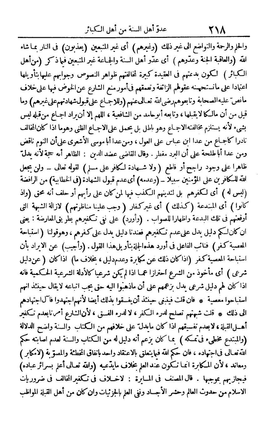 والحلم وَالرَّحْمَة والتواضع إِلَى غير ذَلِك (وَغَيرهم) أَي غير المتبعين (يُعَذبُونَ) فِي النَّار بِمَا شَاءَ الله (وَالْعَاقبَة الْجنَّة وعدوهم) أَي عَدو أهل السّنة وَالْجَمَاعَة غير المتبعين فِيمَا ذكر (من أهل الْكَبَائِر) لكَون بدعتهم فِي العقيدة كَبِيرَة لمخالفتهم ظواهر النُّصُوص وجوابهم عَلَيْهَا بتأويلها اعْتِمَادًا على مَا تستحسنه عُقُولهمْ الزائغة وتعمقهم فِي أُمُور منع الشَّارِع عَن الْخَوْض فِيهَا على خلاف مَا نَص عَلَيْهِ الصَّحَابَة وتابعوهم رَضِي الله تَعَالَى عَنْهُم (وللإجماع على قبُول شَهَادَتهم على غَيرهم) وَمَا قيل من أَن مَالِكًا لَا يقبلهَا، وَتَابعه أَبُو حَامِد من الشَّافِعِيَّة، اللَّهُمَّ إِلَّا أَن يُرَاد إِجْمَاع من قبله لَيْسَ بِشَيْء لِأَنَّهُ يسْتَلْزم مُخَالفَته الْإِجْمَاع وَهُوَ بَاطِل بل يحمل على الْإِجْمَاع الظني وَهُوَ مَا إِذا كَانَ الْمُخَالف نَادرا كإجماع من عدا ابْن عَبَّاس على الْعَوْل، وَمن عدا أَبَا مُوسَى الْأَشْعَرِيّ على أَن النّوم نَاقض وَمن عدا أَبَا طَلْحَة على أَن الْبرد مفطر. وَقَالَ القَاضِي عضد الدّين: الظَّاهِر أَنه حجَّة لِأَنَّهُ يدل ظَاهرا على وجود رَاجِح أَو قَاطع (وَلَا شَهَادَة لكَافِر على مُسلم) لقَوْله تَعَالَى - {وَلنْ يَجْعَل الله للْكَافِرِينَ على الْمُؤمنِينَ سَبِيلا} - (وَعَدَمه) أَي عدم قبُول الشَّهَادَة (فِي الخطابية) من الرافضة (لَيْسَ لَهُ) أَي لكفرهم بل لتدينهم الْكَذِب فِيهَا لمن كَانَ على رَأْيهمْ أَو حلف أَنه محق (وَإِذ كَانُوا) أَي المبتدعة (كَذَلِك) أَي غير كفار (وَجب علينا مناظرتهم) لإِزَالَة الشُّبْهَة الَّتِي أوقعتهم فِي تِلْكَ الْبِدْعَة وإظهارا للصَّوَاب. (وَأورد) على نفي تكفيرهم بطرِيق الْمُعَارضَة: يَعْنِي إِن كَانَ لكم دَلِيل يدل على عدم تكفيرهم فعندنا دَلِيل يدل على كفرهم، وَهُوَ قَوْلنَا (اسْتِبَاحَة الْمعْصِيَة كفر) فنائب الْفَاعِل فِي أورد هَذِه الْجُمْلَة بِتَأْوِيل هَذَا القَوْل. (وَأجِيب) عَن الْإِيرَاد بِأَن اسْتِبَاحَة الْمعْصِيَة كفر (إِذا كَانَ ذَلِك عَن مُكَابَرَة وَعدم دَلِيل، بِخِلَاف مَا) إِذا كَانَ (عَن دَلِيل شَرْعِي) أَي مَأْخُوذ من الشَّرْع احْتِرَازًا عَمَّا إِذا لم يكن شَرْعِيًّا كالأدلة الشَّرْعِيَّة الْحكمِيَّة فَإِنَّهُ إِذا كَانَ لَهُم دَلِيل شَرْعِي يدل بزعمهم على أَن مَا ذَهَبُوا إِلَيْهِ حق يجب اتِّبَاعه لَا يُقَال حِينَئِذٍ أَنهم استباحوا مَعْصِيّة فَإِن قلت فَيَنْبَغِي حِينَئِذٍ أَن يفسقوا بذلك أَيْضا لأَنهم اجتهدوا فآل اجتهادهم إِلَى ذَلِك قلت شبهتهم تصلح لدرء الْكفْر، لَا لدرء الْفسق، لِأَن الشَّارِع أمرنَا بِعَدَمِ تَكْفِير أهل الْقبْلَة، لَا بِعَدَمِ تفسيقهم إِذا كَانَ مَا يدل على خلافهم من الْكتاب وَالسّنة وَاضح الدّلَالَة (والمبتدع مُخطئ فِي تمسكه) بِمَا كَانَ يزْعم أَنه دَلِيل لَهُ من الْكتاب وَالسّنة لعدم إِصَابَته حكم الله تَعَالَى فِي اجْتِهَاده، فَإِن حكم الله فِيمَا يتَعَلَّق بالاعتقاد وَاحِد بِاتِّفَاق المخطئة والمصوبة (لَا مكابر) ومعاند، لِأَن المكابرة إِنَّمَا تكون عِنْد الْعلم بِخِلَاف مَا يَدعِيهِ (وَالله تَعَالَى أعلم بسرائر عباده) فيجازيهم بموجبها. قَالَ المُصَنّف فِي المسايرة: لَا خلاف فِي تَكْفِير الْمُخَالف فِي ضروريات الْإِسْلَام من حُدُوث الْعَالم وَحشر الأجساد وَنفي الْعلم بالجزئيات وَإِن كَانَ من أهل الْقبْلَة المواظب