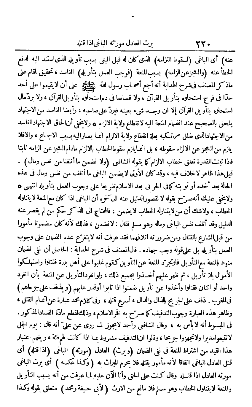 عَنهُ) أَي الْبَاغِي (لسُقُوط الْتِزَامه) الَّذِي كَانَ لَهُ قبل الْبَغي بِسَبَب تَأْوِيله الَّذِي اسْتندَ إِلَيْهِ لدفع الْخَطَأ عَنهُ (وَالْعجز عَن إِلْزَامه) بِسَبَب المنعة (فَوَجَبَ الْعَمَل بتأويله) الْفَاسِد، تَحْقِيق الْمقَام على مَا ذكر المُصَنّف فِي شرح الْهِدَايَة أَنه أجمع أَصْحَاب رَسُول الله صلى الله عَلَيْهِ وَسلم على أَن لَا يقيموا على أحد حدا فِي فرج اسْتَحَلُّوهُ بِتَأْوِيل الْقُرْآن، وَلَا قصاصا فِي دم اسْتَحَلُّوهُ بِتَأْوِيل الْقُرْآن، وَلَا برد مَال اسْتَحَلُّوهُ بِتَأْوِيل الْقُرْآن إِلَّا أَن وجد شَيْء بِعَيْنِه فَيرد على صَاحبه، وَأَيْضًا الْفَاسِد من الِاجْتِهَاد يلْحق بِالصَّحِيحِ عِنْد انضمام المنعة إِلَيْهِ لانْقِطَاع ولَايَة الْإِلْزَام وَلَا يخفى أَن إِلْحَاق الِاجْتِهَاد الْفَاسِد من الِاجْتِهَاد الَّذِي ضلل مرتكبه بعلة انْقِطَاع ولَايَة الْإِلْزَام إِنَّمَا يُصَار إِلَيْهِ بِسَبَب الْإِجْمَاع، وَإِلَّا فَلَا يلْزم من الْعَجز عَن الْإِلْزَام سُقُوطه، بل إِنَّمَا يلْزم سُقُوط الْخطاب بالإلزام مَا دَامَ الْعَجز عَن إِلْزَامه ثَابتا فَإِذا ثبتَتْ الْقُدْرَة تعلق خطاب الْإِلْزَام كَمَا يَقُوله الشَّافِعِي (وَلَا نضمن مَا أتلفنا من نفس وَمَال). قيل هَذَا ظَاهر لَا خلاف فِيهِ، وَقد كَانَ الأولى لَا يضمن الْبَاغِي مَا أتلف من نفس وَمَال فِي هَذِه الْحَالة بعد أَخذه أَو تَوْبَته كَمَا فِي الْحَرْبِيّ بعد الْإِسْلَام تَفْرِيعا على وجوب الْعَمَل بتأويله انْتهى وَلَا يخفى عَلَيْك أَنه صرح بقوله لَا لقُصُور الدَّلِيل عَنهُ إِلَى آخِره أَن الْبَاغِي إِذا كَانَ مَعَ المنعة لَا يتَنَاوَلهُ الْخطاب، وَلَا شكّ أَن من لَا يتَنَاوَلهُ الْخطاب لَا يضمن، فالمحتاج إِلَى الذّكر حكم من لم يقصر عَنهُ الدَّلِيل وَقد أتلف نفس الْبَاغِي وَمَاله وَهُوَ مُسلم فَقَالَ: لَا نضمن، فَذَلِك لِأَنَّهُ كَانَ مَضْمُونا مَأْمُورا من قبل الشَّارِع بِالْقِتَالِ وَمن ضَرُورَته إتلافهما فقد عرفت أَنه لَا يتَفَرَّع عدم الضَّمَان على وجوب الْعَمَل بتأويله بل على قَوْله وَجب جهاده. قَالَ المُصَنّف فِي شرح الْهِدَايَة: الْحَاصِل أَن نفي الضَّمَان مَنُوط بالمنعة مَعَ التَّأْوِيل فَلَو تجرد المنعة عَن التَّأْوِيل كقوم غلبوا على أهل بَلْدَة فَقتلُوا واستهلكوا الْأَمْوَال بِلَا تَأْوِيل، ثمَّ ظهر عَلَيْهِم أخذُوا بِجَمِيعِ ذَلِك، وَلَو انْفَرد التَّأْوِيل عَن المنعة بِأَن انْفَرد وَاحِد أَو اثْنَان فَقتلُوا وَأخذُوا عَن تَأْوِيل ضمنُوا إِذا تَابُوا أَو قدر عَلَيْهِم (ويذفف على جرحاهم) فِي الْمغرب. ذفف على الجريح بِالذَّالِ وَالدَّال، أسْرع قَتله، وَفِي كَلَام مُحَمَّد عبارَة عَن إتْمَام الْقَتْل، وَظَاهر هَذِه الْعبارَة وجوب التدفيف كَمَا صرح بِهِ فَخر الْإِسْلَام، وَذَلِكَ لقطع مَادَّة الْفساد الْمَذْكُور. فِي الْمَبْسُوط أَنه لَا بَأْس بِهِ، وَقَالَ الشَّافِعِي وَأحمد لَا يجوز لما روى عَن عَليّ أَنه قَالَ: يَوْم الْجمل لَا تتبعوا مُدبرا وَلَا تجهزوا جريحا، وَقَالُوا أَن التدفيف مَشْرُوط بِمَا إِذا كَانَت لَهُم فِئَة، وَيفهم اعْتِبَار هَذَا الْقَيْد من اشْتِرَاط المنعة فِي نفي الضَّمَان (وَيَرِث) الْعَادِل (مُوَرِثه) الْبَاغِي (إِذا قَتله) أَي قتل الْعَادِل الْبَاغِي اتِّفَاقًا لِأَنَّهُ مَأْمُور بقتْله فَلَا يحرم الْمِيرَاث بِهِ (وَكَذَا عَكسه) أَي يَرث الْبَاغِي مُوَرِثه الْعَادِل إِذا قَتله وَقَالَ كنت على الْحق وَأَنا الْآن عَلَيْهِ لما عرفت من أَنه بِسَبَب التَّأْوِيل والمنعة لَا يتَنَاوَل الْخطاب وَهُوَ مُسلم فَلَا مَانع من الْإِرْث (لأبي حنيفَة وَمُحَمّد) مُتَعَلق بقوله وَكَذَا