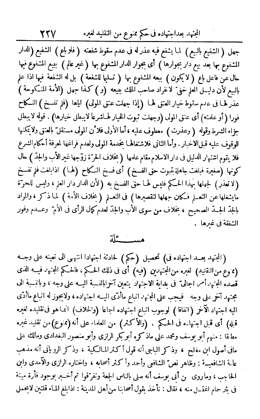 (الْمُجْتَهد بعد اجْتِهَاده فِي) تَحْصِيل (حكم) لحادثة اجْتِهَادًا انْتهى إِلَى تعينه على وَجه (مَمْنُوع من التَّقْلِيد) لغيره من الْمُجْتَهدين (فِيهِ) أَي فِي ذَلِك الحكم، فَالْحكم الْمُجْتَهد فِيهِ الَّذِي قَصده الْمُجْتَهد أَمر إجمالي فِي بداية الِاجْتِهَاد يتَعَيَّن آخر بِالنِّسْبَةِ إِلَيْهِ على وَجه، وبالنسبة إِلَى مُجْتَهد آخر على وَجه فَيجب على الْمُجْتَهد اتِّبَاع مَا أدّى إِلَيْهِ اجْتِهَاده، وَلَا يجوز لَهُ اتِّبَاع مَا أدّى إِلَيْهِ اجْتِهَاد الآخر (اتِّفَاقًا) لوُجُوب اتِّبَاع اجْتِهَاده إِجْمَاعًا (وَالْخلاف) إِنَّمَا هُوَ فِي تَقْلِيده لغيره قبله) أَي قبل اجْتِهَاده فِي الحكم. (وَالْأَكْثَر) من الْعلمَاء على أَنه (مَمْنُوع) من تَقْلِيد غَيره مطبقا: مِنْهُم أَبُو يُوسُف وَمُحَمّد على مَا ذكره أَبُو بكر الرَّازِيّ وَأَبُو مَنْصُور الْبَغْدَادِيّ وَمَالك على مَا فِي أصُول ابْن مُفْلِح، وَذكر الْبَاجِيّ أَنه قَول أَكثر الْمَالِكِيَّة، وَذكر الرَّوْيَانِيّ أَنه مَذْهَب عَامَّة الشَّافِعِيَّة: وَظَاهر نَص الشَّافِعِي وَأحمد وَأكْثر أَصْحَابه، وَاخْتَارَهُ الرَّازِيّ والآمدي وَابْن الْحَاجِب، وَمَا روى عَن أبي يُوسُف أَنه صلى بِالنَّاسِ الْجُمُعَة وَتَفَرَّقُوا ثمَّ أخبر بِوُجُود فَأْرَة ميتَة فِي بِئْر حمام اغْتسل مِنْهُ، فَقَالَ: نَأْخُذ بقول أَصْحَابنَا من أهل الْمَدِينَة: إِذا بلغ المَاء قُلَّتَيْنِ لَا يحمل