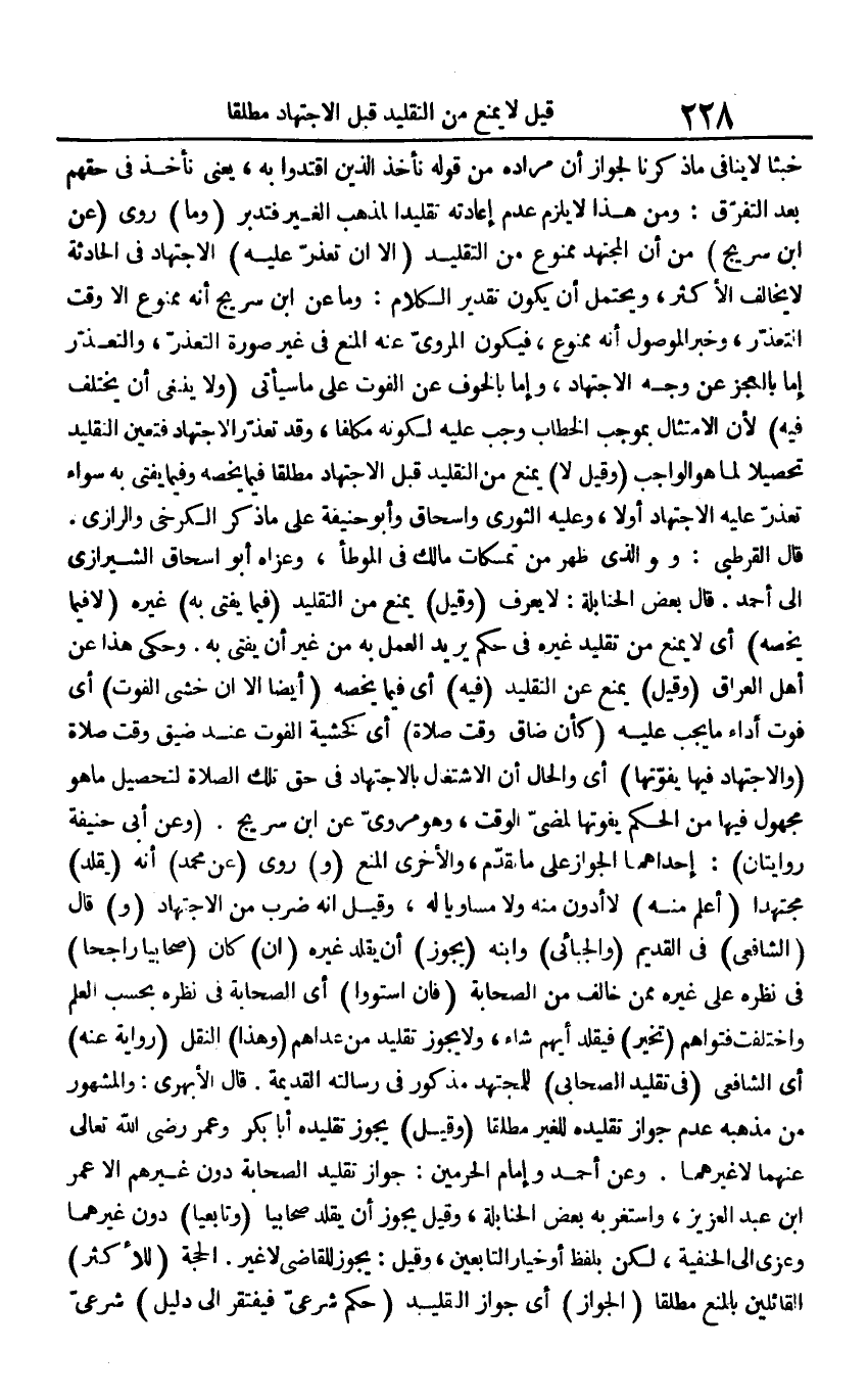 خبثا لَا يُنَافِي مَا ذكرنَا لجَوَاز أَن مُرَاده من قَوْله نَأْخُذ الَّذين اقتدوا بِهِ، يَعْنِي نَأْخُذ فِي حَقهم بعد التَّفَرُّق: وَمن هَذَا لَا يلْزم عدم إِعَادَته تقليدا لمَذْهَب الْغَيْر فَتدبر (وَمَا) روى (عَن ابْن سُرَيج) من أَن الْمُجْتَهد مَمْنُوع من التَّقْلِيد (إِلَّا أَن تعذر عَلَيْهِ) الِاجْتِهَاد فِي الْحَادِثَة لَا يُخَالف الْأَكْثَر، وَيحْتَمل أَن يكون تَقْدِير الْكَلَام: وَمَا عَن ابْن سُرَيج أَنه مَمْنُوع إِلَّا وَقت التَّعَذُّر، وَخبر الْمَوْصُول انه مَمْنُوع، فَيكون الْمَرْوِيّ عَنهُ الْمَنْع فِي غير صُورَة التَّعَذُّر، والتعذر إِمَّا بِالْعَجزِ عَن وَجه الِاجْتِهَاد، وَإِمَّا بالخوف عَن الْفَوْت على مَا سَيَأْتِي (وَلَا يَنْبَغِي أَن يخْتَلف فِيهِ) لِأَن الِامْتِثَال بِمُوجب الْخطاب وَجب عَلَيْهِ لكَونه مُكَلّفا، وَقد تعذر الِاجْتِهَاد فَتعين التَّقْلِيد تحصيلا لما هُوَ الْوَاجِب (وَقيل لَا) يمْنَع من التَّقْلِيد قبل الِاجْتِهَاد مُطلقًا فِيمَا يَخُصُّهُ وَفِيمَا يُفْتِي بِهِ سَوَاء تعذر عَلَيْهِ الِاجْتِهَاد أَو لَا، وَعَلِيهِ الثَّوْريّ وَإِسْحَاق وَأَبُو حنيفَة على مَا ذكر الْكَرْخِي والرازي. قَالَ الْقُرْطُبِيّ: وَهُوَ الَّذِي ظهر من تمسكات مَالك فِي الْمُوَطَّأ، وَعَزاهُ أَبُو إِسْحَاق الشِّيرَازِيّ إِلَى أَحْمد. قَالَ بعض الْحَنَابِلَة: لَا يعرف (وَقيل) يمْنَع من التَّقْلِيد (فِيمَا يُفْتى بِهِ) غَيره (لَا فِيمَا يَخُصُّهُ) أَي لَا يمْنَع من تَقْلِيد غَيره فِي حكم يُرِيد الْعَمَل بِهِ من غير أَن يُفْتى بِهِ. وَحكى هَذَا عَن أهل الْعرَاق (وَقيل) يمْنَع عَن التَّقْلِيد (فِيهِ) أَي فِيمَا يَخُصُّهُ (أَيْضا إِلَّا أَن خشِي الْفَوْت) أَي فَوت أَدَاء مَا يجب عَلَيْهِ (كَأَن ضَاقَ وَقت صَلَاة) أَي كخشية الْفَوْت عِنْد ضيق وَقت صَلَاة (وَالِاجْتِهَاد فِيهَا يفوتها) أَي وَالْحَال أَن الِاشْتِغَال بِالِاجْتِهَادِ فِي حق تِلْكَ الصَّلَاة لتَحْصِيل مَا هُوَ مَجْهُول فِيهَا من الحكم يفوتها لمضي الْوَقْت، وَهُوَ مَرْوِيّ عَن ابْن سُرَيج. (وَعَن أبي حنيفَة رِوَايَتَانِ): إِحْدَاهمَا الْجَوَاز على مَا تقدم، وَالْأُخْرَى الْمَنْع (و) روى (عَن مُحَمَّد) أَنه (يُقَلّد) مُجْتَهدا (أعلم مِنْهُ) لَا أدون مِنْهُ وَلَا مُسَاوِيا لَهُ، وَقيل إِنَّه ضرب من الِاجْتِهَاد (و) قَالَ (الشَّافِعِي) فِي الْقَدِيم (والجبائي) وَابْنه (يجوز) أَن يُقَلّد غَيره (إِن) كَانَ (صحابيا راجحا) فِي نظره على غَيره مِمَّن خَالف من الصَّحَابَة (فَإِن اسْتَووا) أَي الصَّحَابَة فِي نظره بِحَسب الْعلم وَاخْتلفت فتواهم (تخير) فيقلد أَيهمْ شَاءَ، وَلَا يجوز تَقْلِيد من عداهم (وَهَذَا) النَّقْل (رِوَايَة عَنهُ) أَي الشَّافِعِي (فِي تَقْلِيد الصَّحَابِيّ) للمجتهد مَذْكُور فِي رسَالَته الْقَدِيمَة. قَالَ الْأَبْهَرِيّ: وَالْمَشْهُور من مذْهبه عدم جَوَاز تَقْلِيده للْغَيْر مُطلقًا (وَقيل) يجوز تَقْلِيده أَبَا بكر وَعمر رَضِي الله تَعَالَى عَنْهُمَا لَا غَيرهمَا. وَعَن أَحْمد وَإِمَام الْحَرَمَيْنِ: جَوَاز تَقْلِيد الصَّحَابَة دون غَيرهم إِلَّا عمر ابْن عبد الْعَزِيز، وَاسْتَغْرَبَهُ بعض الْحَنَابِلَة، وَقيل يجوز أَن يُقَلّد صحابيا (وتابعيا) دون غَيرهمَا وعزى إِلَى الْحَنَفِيَّة، لَكِن بِلَفْظ أَو خِيَار التَّابِعين، وَقيل: يجوز للْقَاضِي لَا غير. الْحجَّة (للْأَكْثَر) الْقَائِلين بِالْمَنْعِ مُطلقًا (الْجَوَاز) أَي جَوَاز التَّقْلِيد (حكم شَرْعِي فيفتقر إِلَى دَلِيل) شَرْعِي