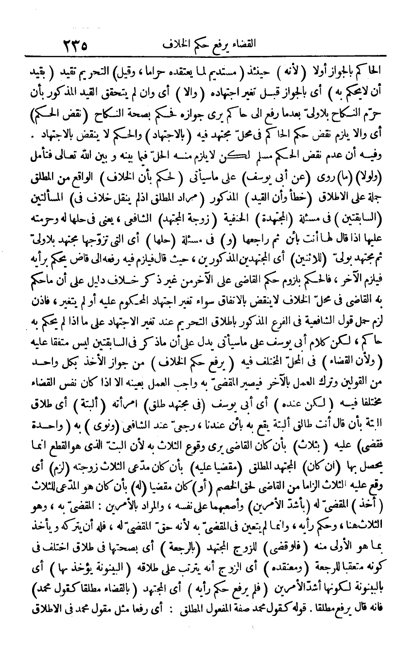 الْحَاكِم بِالْجَوَازِ أَولا (لِأَنَّهُ) حِينَئِذٍ (مستديم لما يَعْتَقِدهُ حَرَامًا، وَقيل) التَّحْرِيم تقيد (بِقَيْد أَن لَا يحكم بِهِ) أَي بِالْجَوَازِ قبل تغير اجْتِهَاده (وَإِلَّا) أَي وَإِن لم يتَحَقَّق الْقَيْد الْمَذْكُور بِأَن حرم النِّكَاح بِلَا ولي بَعْدَمَا رفع إِلَى حَاكم يرى جَوَازه فَحكم بِصِحَّة النِّكَاح (نقض الحكم) أَي وَألا يلْزم نقض حكم الْحَاكِم فِي مَحل مُجْتَهد فِيهِ (بِالِاجْتِهَادِ) وَالْحكم لَا ينْقض بِالِاجْتِهَادِ. وَفِيه أَن عدم نقض الحكم مُسلم لَكِن لَا يلْزم مِنْهُ الْحل فِيمَا بَينه وَبَين الله تَعَالَى فَتَأمل (وَلَوْلَا) (مَا) روى (عَن أبي يُوسُف) على مَا سَيَأْتِي (لحكم بِأَن الْخلاف) الْوَاقِع من الْمُطلق جملَة على الْإِطْلَاق (خطأ وَأَن الْقَيْد) الْمَذْكُور (مُرَاد الْمُطلق إِذْ لم ينْقل خلاف فِي) الْمَسْأَلَتَيْنِ (السابقتين) فِي مسئلة (المجتهدة) الْحَنَفِيَّة (زَوْجَة الْمُجْتَهد) الشَّافِعِي، يَعْنِي فِي حلهَا لَهُ وحرمته عَلَيْهَا إِذا قَالَ لَهَا أَنْت بَائِن ثمَّ رَاجعهَا (و) فِي مسئلة (حلهَا) أَي الَّتِي تزَوجهَا مُجْتَهد بِلَا ولي ثمَّ مُجْتَهد بولِي (للاثنين) أَي الْمُجْتَهدين الْمَذْكُورين، حَيْثُ قَالَ فَيلْزم فِيهِ رَفعه إِلَى قَاض يحكم بِرَأْيهِ فَيلْزم الآخر، فَالْحكم بِلُزُوم حكم القَاضِي على الآخر من غير ذكر خلاف دَلِيل على أَن مَا حكم بِهِ القَاضِي فِي مَحل الْخلاف لَا ينْقض بالِاتِّفَاقِ سَوَاء تغير اجْتِهَاد الْمَحْكُوم عَلَيْهِ أَو لم يتَغَيَّر، فَإِذن لزم حمل قَول الشَّافِعِيَّة فِي الْفَرْع الْمَذْكُور بِإِطْلَاق التَّحْرِيم عِنْد تغير الِاجْتِهَاد على مَا إِذا لم يحكم بِهِ حَاكم، لَكِن كَلَام أبي يُوسُف على مَا سَيَأْتِي يدل على أَن مَا ذكر فِي السابقتين لَيْسَ مُتَّفقا عَلَيْهِ (وَلِأَن الْقَضَاء) فِي الْمحل الْمُخْتَلف فِيهِ (يرفع حكم الْخلاف) من جَوَاز الْأَخْذ بِكُل وَاحِد من الْقَوْلَيْنِ وَترك الْعَمَل بِالْآخرِ فَيصير المقضى بِهِ وَاجِب الْعَمَل بِعَيْنِه إِلَّا إِذا كَانَ نفس الْقَضَاء مُخْتَلفا فِيهِ (لَكِن عِنْده) أَي أبي يُوسُف (فِي مُجْتَهد طلق) امْرَأَته (أَلْبَتَّة) أَي طَلَاق الْبَتَّةَ بِأَن قَالَ أَنْت طَالِق الْبَتَّةَ يَقع بِهِ بَائِن عندنَا، رَجْعِيّ عِنْد الشَّافِعِي (وَنوى) بِهِ (وَاحِدَة فَقضى) عَلَيْهِ (بِثَلَاث) بِأَن كَانَ القَاضِي يرى وُقُوع الثَّلَاث بِهِ لِأَن الْبَتّ الَّذِي هُوَ الْقطع إِنَّمَا يحصل بهَا (إِن كَانَ) الْمُجْتَهد الْمُطلق (مقضيا عَلَيْهِ) بِأَن كَانَ مدعي الثَّلَاث زَوجته (لزم) أَي وَقع عَلَيْهِ الثَّلَاث إلزاما من القَاضِي لحق الْخصم (أَو) كَانَ مقضيا (لَهُ) بِأَن كَانَ هُوَ الْمُدَّعِي للثلاث (أَخذ) الْمقْضِي لَهُ (بأشد الْأَمريْنِ) وأصعبهما على نَفسه، وَالْمرَاد بالأمرين: الْمقْضِي بِهِ، وَهُوَ الثَّلَاث هُنَا، وَحكم رَأْيه، وَإِنَّمَا لم يتَعَيَّن فِي الْمقْضِي بِهِ لِأَنَّهُ حق الْمقْضِي لَهُ، فَلهُ أَن يتْركهُ وَيَأْخُذ بِمَا هُوَ الأولى مِنْهُ (فَلَو قضى) للزَّوْج الْمُجْتَهد (بالرجعة) أَي بِصِحَّتِهَا فِي طَلَاق اخْتلف فِي كَونه متعقبا للرجعة (ومعتقده) أَي الزَّوْج أَنه يَتَرَتَّب على طَلَاقه (الْبَيْنُونَة يُؤْخَذ بهَا) أَي بالبينونة لكَونهَا أَشد الْأَمريْنِ (فَلم يرفع حكم رَأْيه) أَي الْمُجْتَهد (بِالْقضَاءِ مُطلقًا كَقَوْل مُحَمَّد) فَإِنَّهُ قَالَ يرفع مُطلقًا. قَوْله كَقَوْل مُحَمَّد صفة الْمَفْعُول الْمُطلق: أَي رفعا مثل مقول مُحَمَّد فِي الْإِطْلَاق