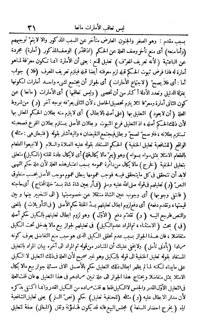 بِسَبَب مقدم: وَهُوَ الصغر وَالْجُنُون الْعَارِض مُتَأَخّر عَن السَّبَب الْمَذْكُور وَإِلَّا لَا يتم توجيههم (وَأما مَنعه) أَي منع تَأَخّر وصف الْعلَّة عَن الحكم (إِذا قدر) الْوَصْف الْمَذْكُور (أَمارَة) مُجَرّدَة عَن الباعثية (لِأَنَّهُ تَعْرِيف الْمُعَرّف) تَعْلِيل للْمَنْع: يَعْنِي أَن الأمارة إِنَّمَا تكون معرفَة لما هُوَ أَمارَة لَهُ فَإِذا فرض ثُبُوت الحكم قبله لزم مَعْرفَته أَيْضا قبله فَيلْزم تَعْرِيف الْمُعَرّف (فَلَا) جَوَاب أما: أَي فَلَا يَصح (لِاجْتِمَاع الأمارات) أَي لجَوَاز أَن يجْتَمع لشَيْء وَاحِد أَمَارَات لكَونهَا بِمَنْزِلَة الدَّلِيل وتعدد الْأَدِلَّة أَكثر من أَن تحصى (وَلَيْسَ تعاقبها) أَي الأمارات (مَانِعا) عَن كَون الثَّانِي أَمارَة ومعرفا لِئَلَّا يلْزم تَحْصِيل الْحَاصِل، لِأَن الثَّانِي يعرفهُ بِوَجْه آخر (و) من شُرُوط الْعلَّة (أَن لَا يعود) التَّعْلِيل بهَا (على أَصله بالإبطال) أَي لَا يلْزم مِنْهُ بطلَان الحكم الْمُعَلل بهَا لِأَن ذَلِك الحكم أَصله، إِذْ التَّعْلِيل فرع الثُّبُوت وَبطلَان الأَصْل يسْتَلْزم بطلَان الْفَرْع فصحبته تَسْتَلْزِم بُطْلَانه، فَلَو صَحَّ لصَحَّ وَبَطل فيجتمع النقيضان، وَإِلَيْهِ أَشَارَ بقوله (فَتبْطل هِيَ: مِثَاله) الْوَاقِع (للشَّافِعِيَّة تَعْلِيل الْحَنَفِيَّة) الحكم الْمُسْتَفَاد بقوله صلى الله عَلَيْهِ وَسلم (لَا تَبِيعُوا الطَّعَام بِالطَّعَامِ إِلَّا مثلا بِمثل سَوَاء بِسَوَاء) وَهُوَ (يعم مَا لَا يُكَال قلَّة) أَي لَا يُكَال عَادَة لقلته (بِالْكَيْلِ) مُتَعَلق بتعليل الْحَنَفِيَّة (فَخرج) مَا لَا يُكَال من دَائِرَة عُمُومه بِسَبَب اعْتِبَار هَذِه الْعلَّة لِأَن عِلّة حكم النَّهْي لَا بُد أَن تتَحَقَّق فِي كل مَا يتَحَقَّق فِيهِ فموجب عمومها يبطل عُمُوم مُوجب الأَصْل بِحَسب مَنْطُوق النَّص (و) تَعْلِيلهم فِي قَوْله صلى الله عَلَيْهِ وَسلم (فِي أَرْبَعِينَ شَاة شَاة بسد خلة الْمُحْتَاج) أَي حَاجته (فَانْتفى وُجُوبهَا) أَي وجوب عين الشَّاة منتقلا عَن خصوصيتها (إِلَى التَّخْيِير بَينهَا وَبَين قيمتهَا، وَتقدم دَفعه) أَي دفع لُزُوم إبِْطَال تَعْلِيلهم بسد الْخلَّة حكم الأَصْل (فِي التأويلات) بِالْمَعْنَى وَالنَّص فَارْجِع إِلَيْهِ (و) تقدم دفع (الأول) وَهُوَ لُزُوم إبِْطَال تَعْلِيلهم بِالْكَيْلِ حكم أَصله (فِي) بحث (الِاسْتِثْنَاء، ثمَّ المُرَاد عدم الْكَيْل) فِي تَعْلِيلهم لجَوَاز بيع مَا لَا يدْخل تَحت الْكَيْل مُتَفَاضلا، فَإِن هَذَا الْجَوَاز بِسَبَب عدم تحقق الْكَيْل الَّذِي هُوَ سَبَب منع التَّفَاضُل يعرف كَونه مرَادا (بِأَدْنَى تَأمل) وَلَا يخفى عَلَيْك أَن الْمُتَبَادر من قَوْله ثمَّ المُرَاد إِلَى آخِره بَيَان المُرَاد بِالتَّعْلِيلِ الْمُسْتَفَاد بقوله تَعْلِيل الْحَنَفِيَّة إِلَى قَوْله بِالْكَيْلِ وَهُوَ غير صَحِيح لِأَن الْعلَّة فِي ذَلِك التَّعْلِيل لَا الْكَيْل على مَا بَيناهُ لكنه لما لم يظْهر إبِْطَال ذَلِك التَّعْلِيل حكم بِالْأَصْلِ إِلَّا فِي مسئلة جَوَاز بيع مَا لَا يُكَال إِلَّا مثلا بِمثل مُتَفَاضلا وَيحْتَاج هَذَا الْجَوَاز إِلَى عِلّة تبين مُرَادهم فِي هَذَا التَّعْلِيل فَإِن قلت الْعلَّة فِي التَّعْلِيل الأول الْقدر وَالْجِنْس لَا الْكَيْل فَقَط قلت مُرَاده من الْكَيْل الْقدر وَإِنَّمَا اكْتفى بِذكرِهِ لِأَن مدَار الْإِبْطَال عَلَيْهِ (و) مِثَاله (للحنفية تَعْلِيل) حكم (نَص السّلم) يَعْنِي تَعْلِيل الشَّافِعِيَّة إِيَّاه (يخرج إِحْضَار السّلْعَة) مجْلِس البيع فَإِنَّهُ قد يكون لَهَا مُؤنَة وَثقل (الْمُبْطل) صفة لتعليل