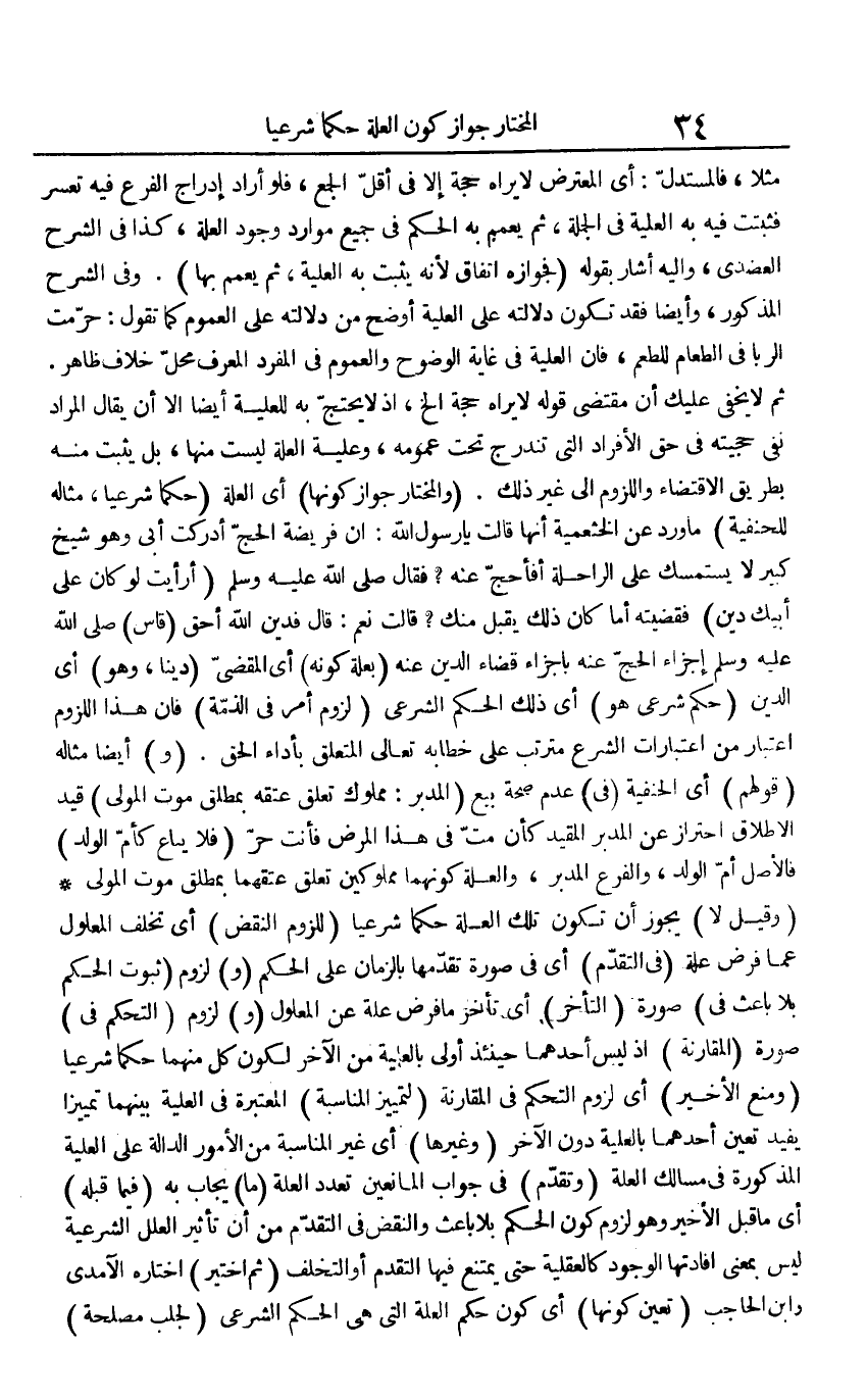 مثلا، فالمستدل: أَي الْمُعْتَرض لَا يرَاهُ حجَّة إِلَّا فِي أقل الْجمع، فَلَو أَرَادَ إدراج الْفَرْع فِيهِ تعسر فثبتت فِيهِ بِهِ الْعلية فِي الْجُمْلَة، ثمَّ يعمم بِهِ الحكم فِي جَمِيع موارد وجود الْعلَّة، كَذَا فِي الشَّرْح العضدي، وَإِلَيْهِ أَشَارَ بقوله (فجوازه اتِّفَاق لِأَنَّهُ يثبت بِهِ الْعلية، ثمَّ يعمم بهَا). وَفِي الشَّرْح الْمَذْكُور، وَأَيْضًا فقد تكون دلَالَته على الْعلية أوضح من دلَالَته على الْعُمُوم كَمَا تَقول: حرمت الرِّبَا فِي الطَّعَام للطعم، فَإِن الْعلية فِي غَايَة الوضوح والعموم فِي الْمُفْرد الْمُعَرّف مَحل خلاف ظَاهر. ثمَّ لَا يخفى عَلَيْك أَن مُقْتَضى قَوْله لَا يرَاهُ حجَّة الخ، إِذْ لَا يحْتَج بِهِ للعلية أَيْضا إِلَّا أَن يُقَال المُرَاد نفي حجيته فِي حق الْأَفْرَاد الَّتِي تندرج تَحت عُمُومه، وَعليَّة الْعلَّة لَيست مِنْهَا، بل يثبت مِنْهُ بطرِيق الِاقْتِضَاء واللزوم إِلَى غير ذَلِك. (وَالْمُخْتَار جَوَاز كَونهَا) أَي الْعلَّة (حكما شَرْعِيًّا، مِثَاله للحنفية) مَا ورد عَن الخثعمية أَنَّهَا قَالَت يَا رَسُول الله: إِن فَرِيضَة الْحَج أدْركْت أبي وَهُوَ شيخ كَبِير لَا يسْتَمْسك على الرَّاحِلَة أفأحج عَنهُ؟ فَقَالَ صلى الله عَلَيْهِ وَسلم (أَرَأَيْت لَو كَانَ على أَبِيك دين) فقضيته أما كَانَ ذَلِك يقبل مِنْك؟ قَالَت نعم: قَالَ فدين الله أَحَق (قَاس) صلى الله عَلَيْهِ وَسلم إِجْزَاء الْحَج عَنهُ بإجزاء قَضَاء الدّين عَنهُ (بعلة كَونه) أَي الْمقْضِي (دينا، وَهُوَ) أَي الدّين (حكم شَرْعِي هُوَ) أَي ذَلِك الحكم الشَّرْعِيّ (لُزُوم أَمر فِي الذِّمَّة) فَإِن هَذَا اللُّزُوم اعْتِبَار من اعتبارات الشَّرْع مترتب على خطابه تَعَالَى الْمُتَعَلّق بأَدَاء الْحق. (و) أَيْضا مِثَاله (قَوْلهم) أَي الْحَنَفِيَّة (فِي) عدم صِحَة بيع (الْمُدبر: مَمْلُوك تعلق عتقه بِمُطلق موت الْمولى) قيد الْإِطْلَاق احْتِرَاز عَن الْمُدبر الْمُقَيد كَأَن مت فِي هَذَا الْمَرَض فَأَنت حر (فَلَا يُبَاع كَأُمّ الْوَلَد) فَالْأَصْل أم الْوَلَد، وَالْفرع الْمُدبر، وَالْعلَّة كَونهمَا مملوكين تعلق عتقهما بِمُطلق موت الْمولى (وَقيل لَا) يجوز أَن تكون تِلْكَ الْعلَّة حكما شَرْعِيًّا (للُزُوم النَّقْض) أَي تخلف الْمَعْلُول عَمَّا فرض عِلّة (فِي التَّقَدُّم) أَي فِي صُورَة تقدمها بِالزَّمَانِ على الحكم (و) لُزُوم (ثُبُوت الحكم بِلَا باعث فِي) صُورَة (التَّأَخُّر) أَي تَأَخّر مَا فرض عِلّة عَن الْمَعْلُول (و) لُزُوم (التحكم فِي) صُورَة (الْمُقَارنَة) إِذْ لَيْسَ أَحدهمَا حِينَئِذٍ أولى بالعلية من الآخر لكَون كل مِنْهُمَا حكما شَرْعِيًّا (وَمنع الْأَخير) أَي لُزُوم التحكم فِي الْمُقَارنَة (لتمييز الْمُنَاسبَة) الْمُعْتَبرَة فِي الْعلية بَينهمَا تمييزا يُفِيد تعين أَحدهمَا بالعلية دون الآخر (وَغَيرهَا) أَي غير الْمُنَاسبَة من الْأُمُور الدَّالَّة على الْعلية الْمَذْكُورَة فِي مسالك الْعلَّة (وَتقدم) فِي جَوَاب المانعين تعدد الْعلَّة (مَا) يُجَاب بِهِ (فِيمَا قبله) أَي مَا قبل الْأَخير وَهُوَ لُزُوم كَون الحكم بِلَا باعث والنقض فِي التَّقَدُّم من أَن تَأْثِير الْعِلَل الشَّرْعِيَّة لَيْسَ بِمَعْنى إفادتها الْوُجُود كالعقلية حَتَّى يمْتَنع فِيهَا التَّقَدُّم أَو التَّخَلُّف (ثمَّ اختير) اخْتَارَهُ الْآمِدِيّ وَابْن الْحَاجِب (تعين كَونهَا) أَي كَون حكم الْعلَّة الَّتِي هِيَ الحكم الشَّرْعِيّ (لجلب مصلحَة)