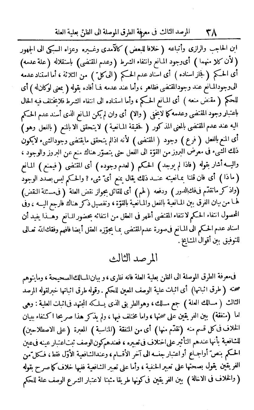 فِي معرفَة الطّرق الموصلة إِلَى الظَّن بعلية الْعلَّة فَإِنَّهُ نَظَرِي، وَبَيَان المسالك الصَّحِيحَة، وَمَا يتَوَهَّم صِحَّته (طرق إِثْبَاتهَا) أَي إِثْبَات علية الْوَصْف الْمعِين للْحكم. وَقَوله طرق إِثْبَاتهَا خبر لقَوْله المرصد الثَّالِث (مسالك الْعلَّة) جمع مَسْلَك، وَهُوَ الطَّرِيق الَّذِي يسلكه الْمُجْتَهد فِي إِثْبَات الْعلية: وَهِي إِمَّا (متفقة) بَين الْفَرِيقَيْنِ على صِحَّتهَا، وَإِمَّا مُخْتَلف فِيهَا، وَلم يذكر هَذَا صَرِيحًا اكْتِفَاء بِبَيَان الْخلاف فِي كل قسم مِنْهُ (تقدم مِنْهَا) أَي من المتفقة (الْمُنَاسبَة) المعبرة (على الاصطلاحين) للشَّافِعِيَّة بِأَنَّهَا عِنْدهم التَّأْثِير على اخْتِلَاف فِي تَعْبِيره، فعندهم كَون الْوَصْف ثَبت اعْتِبَار عينه فِي عين الحكم بِنَصّ أَو إِجْمَاع أَو اعْتِبَار جنسه إِلَى آخر الْأَقْسَام، وَعند الشَّافِعِيَّة الأول فَقَط، فَكل من الْفَرِيقَيْنِ يَقُول بِصِحَّتِهَا على تَعْبِير الْحَنَفِيَّة، وَأما على تَعْبِير الشَّافِعِيَّة فَفِيهَا خلاف كَمَا صرح بقوله (وَالْخلاف فِي الإخالة) بَين الْفَرِيقَيْنِ فِي كَونهَا طَرِيقا مثبتا لاعْتِبَار الشَّرْع الْوَصْف عِلّة للْحكم