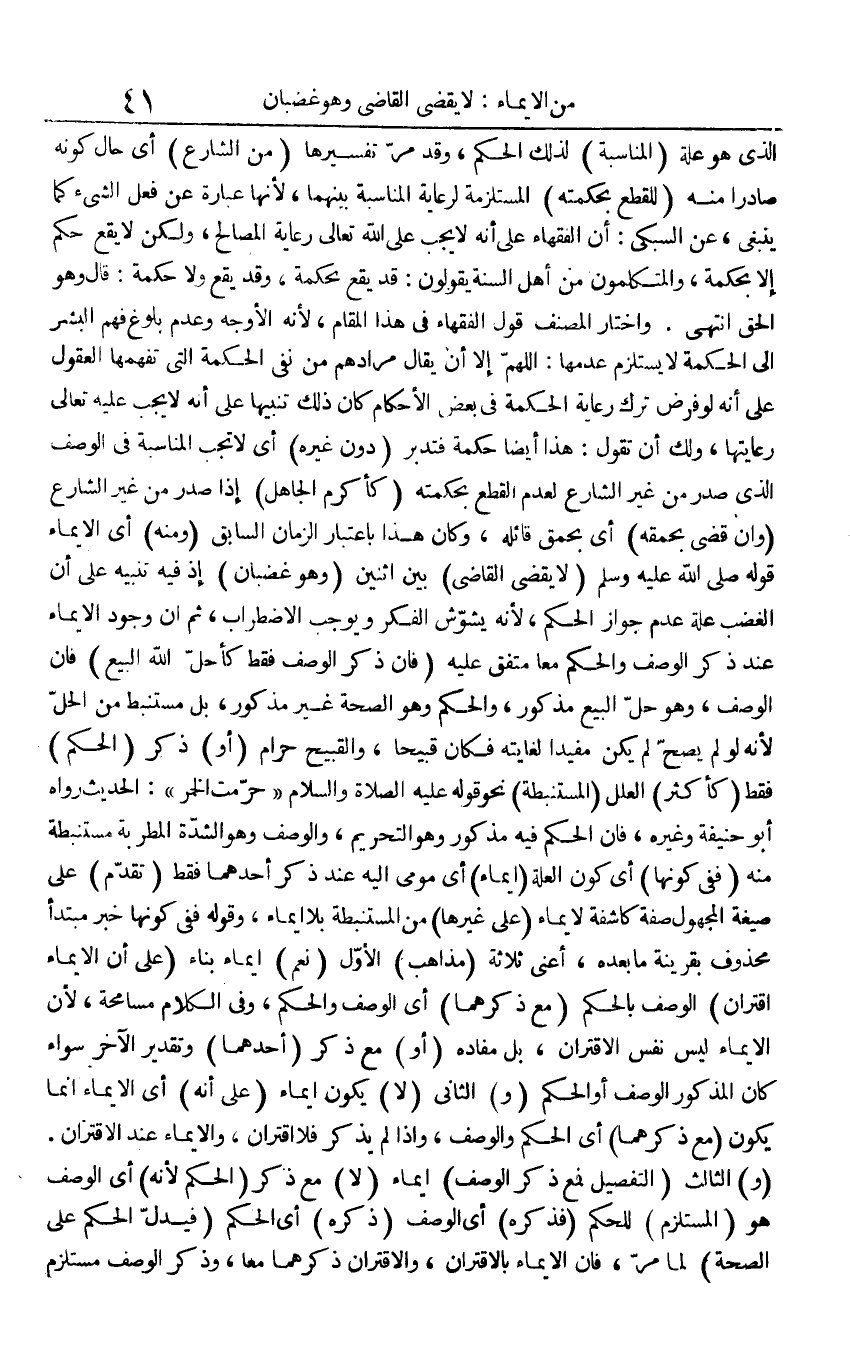 الَّذِي هُوَ عِلّة (الْمُنَاسبَة) لذَلِك الحكم، وَقد مر تَفْسِيرهَا (من الشَّارِع) أَي حَال كَونه صادرا مِنْهُ (للْقطع بِحِكْمَتِهِ) المستلزمة لرعاية الْمُنَاسبَة بَينهمَا، لِأَنَّهَا عبارَة عَن فعل الشَّيْء كَمَا يَنْبَغِي، عَن السُّبْكِيّ: أَن الْفُقَهَاء على أَنه لَا يجب على الله تَعَالَى رِعَايَة الْمصَالح، وَلَكِن لَا يَقع حكم إِلَّا بحكمة، والمتكلمون من أهل السّنة يَقُولُونَ: قد يَقع بحكمة، وَقد يَقع وَلَا حِكْمَة: قَالَ وَهُوَ الْحق انْتهى. وَاخْتَارَ المُصَنّف قَول الْفُقَهَاء فِي هَذَا الْمقَام، لِأَنَّهُ الْأَوْجه وَعدم بُلُوغ فهم الْبشر إِلَى الْحِكْمَة لَا يسْتَلْزم عدمهَا: اللَّهُمَّ إِلَّا أَن يُقَال مُرَادهم من نفي الْحِكْمَة الَّتِي تفهمها الْعُقُول على أَنه لَو فرض ترك رِعَايَة الْحِكْمَة فِي بعض الْأَحْكَام كَانَ ذَلِك تَنْبِيها على أَنه لَا يجب عَلَيْهِ تَعَالَى رعايتها، وَلَك أَن تَقول: هَذَا أَيْضا حِكْمَة فَتدبر (دون غَيره) أَي لَا تجب الْمُنَاسبَة فِي الْوَصْف الَّذِي صدر من غير الشَّارِع لعدم الْقطع بِحِكْمَتِهِ (كأكرم الْجَاهِل) إِذا صدر من غير الشَّارِع (وَإِن قضى بحمقه) أَي بحمق قَائِله، وَكَانَ هَذَا بِاعْتِبَار الزَّمَان السَّابِق (وَمِنْه) أَي الْإِيمَاء قَوْله صلى الله عَلَيْهِ وَسلم (لَا يقْضى القَاضِي) بَين اثْنَيْنِ (وَهُوَ غَضْبَان) إِذْ فِيهِ تَنْبِيه على أَن الْغَضَب عِلّة عدم جَوَاز الحكم، لِأَنَّهُ يشوش الْفِكر وَيُوجب الِاضْطِرَاب ثمَّ إِن وجود الْإِيمَاء عِنْد ذكر الْوَصْف وَالْحكم مَعًا مُتَّفق عَلَيْهِ (فَإِن ذكر الْوَصْف فَقَط كأحل الله البيع) فَإِن الْوَصْف، وَهُوَ حل البيع مَذْكُور، وَالْحكم وَهُوَ الصِّحَّة غير مَذْكُور، بل مستنبط من الْحل لِأَنَّهُ لَو لم يَصح لم يكن مُفِيدا لغايته فَكَانَ قبيحا، والقبيح حرَام (أَو) ذكر (الحكم) فَقَط (كأكثر) الْعِلَل (المستنبطة) نَحْو قَوْله صلى الله عَلَيْهِ وَسلم " حرمت الْخمر ": الحَدِيث رَوَاهُ أَبُو حنيفَة وَغَيره، فَإِن الحكم فِيهِ مَذْكُور وَهُوَ التَّحْرِيم، وَالْوَصْف وَهُوَ الشدَّة المطربة مستنبطة مِنْهُ (فَفِي كَونهَا) أَي كَون الْعلَّة (إِيمَاء) أَي مومى إِلَيْهِ عِنْد ذكر أَحدهمَا فَقَط (تقدم) على صِيغَة الْمَجْهُول صفة كاشفة لإيماء (على غَيرهَا) من المستنبطة بِلَا إِيمَاء، وَقَوله فَفِي كَونهَا خبر مُبْتَدأ مَحْذُوف بِقَرِينَة مَا بعده، أَعنِي ثَلَاثَة (مَذَاهِب) الأول (نعم) إِيمَاء بِنَاء (على أَن الْإِيمَاء اقتران) الْوَصْف بالحكم (مَعَ ذكرهمَا) أَي الْوَصْف وَالْحكم، وَفِي الْكَلَام مُسَامَحَة، لِأَن الْإِيمَاء لَيْسَ نفس الاقتران، بل مفاده (أَو) مَعَ ذكر (أَحدهمَا) وَتَقْدِير الآخر سَوَاء كَانَ الْمَذْكُور الْوَصْف أَو الحكم (و) الثَّانِي (لَا) يكون إِيمَاء (على أَنه) أَي الْإِيمَاء إِنَّمَا يكون (مَعَ ذكرهمَا) أَي الحكم وَالْوَصْف، وَإِذا لم يذكر فَلَا اقتران، والإيماء عِنْد الاقتران. (و) الثَّالِث (التَّفْصِيل فَمَعَ ذكر الْوَصْف) إِيمَاء (لَا) مَعَ ذكر (الحكم لِأَنَّهُ) أَي الْوَصْف هُوَ (المستلزم) للْحكم (فَذكره) أَي الْوَصْف (ذكره) أَي الحكم (فَيدل الحكم على الصِّحَّة) لما مر، فَإِن الْإِيمَاء بالاقتران، والاقتران ذكرهمَا مَعًا، وَذكر الْوَصْف مُسْتَلْزم
