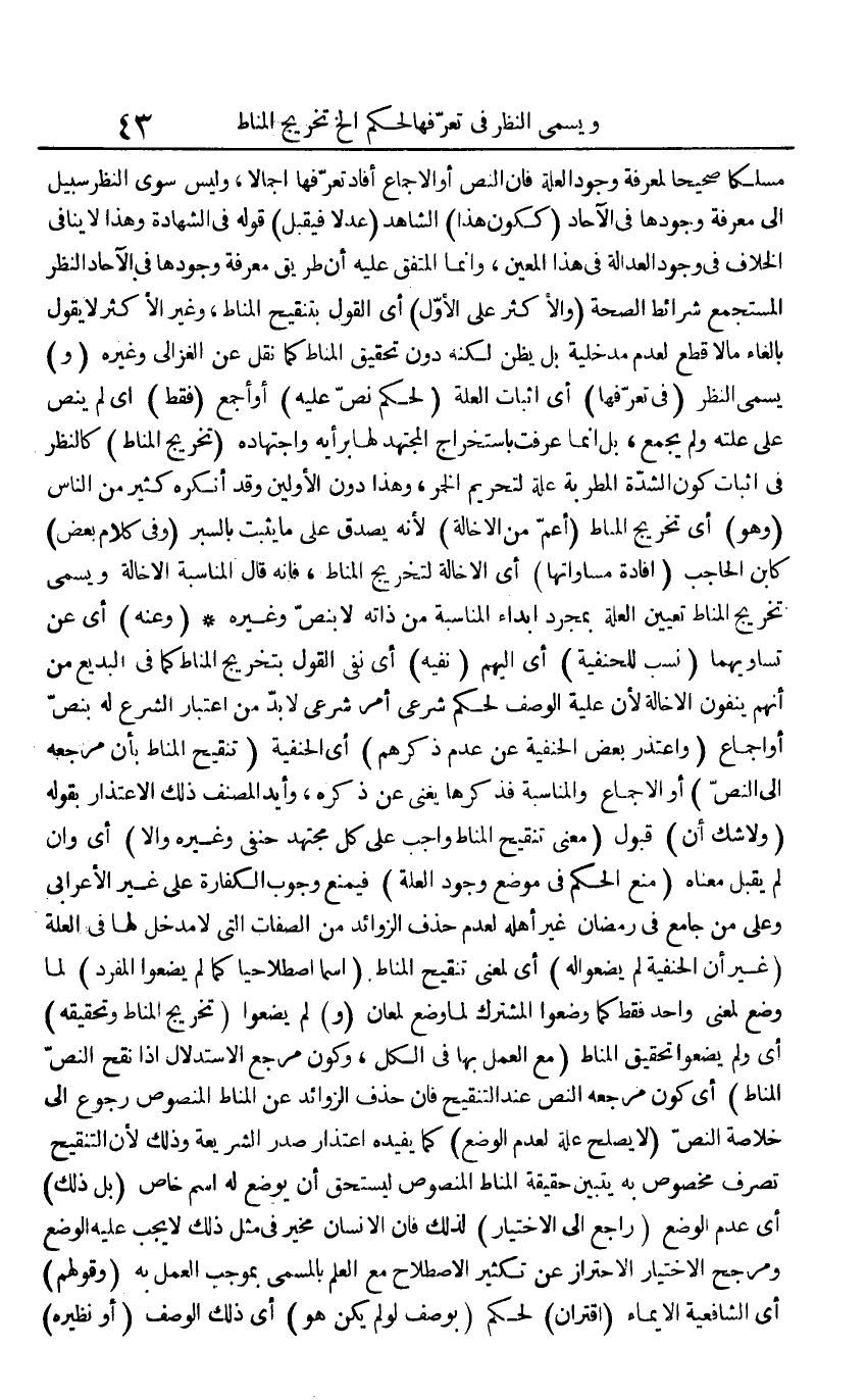 مسلكا صَحِيحا لمعْرِفَة وجود الْعلَّة فَإِن النَّص أَو الْإِجْمَاع أَفَادَ تعرفها إِجْمَالا، وَلَيْسَ سوى النّظر سَبِيل إِلَى معرفَة وجودهَا فِي الْآحَاد (ككون هَذَا) الشَّاهِد (عدلا فَيقبل) قَوْله فِي الشَّهَادَة وَهَذَا لَا يُنَافِي الْخلاف فِي وجود الْعَدَالَة فِي هَذَا الْمعِين، وَإِنَّمَا الْمُتَّفق عَلَيْهِ أَن طَرِيق معرفَة وجودهَا فِي الْآحَاد النّظر المستجمع شَرَائِط الصِّحَّة (وَالْأَكْثَر على الأول) أَي القَوْل بتنقيح المناط، وَغير الْأَكْثَر لَا يَقُول بإلغاء مَا لَا قطع لعدم مدخلية بل يظنّ لكنه دون تَحْقِيق المناط كَمَا نقل عَن الْغَزالِيّ وَغَيره (و) يُسمى النّظر (فِي تعرفها) أَي إِثْبَات الْعلَّة (لحكم نَص عَلَيْهِ) أَو أجمع (فَقَط) أَي لم ينص على علته وَلم يجمع، بل إِنَّمَا عرفت باستخراج الْمُجْتَهد لَهَا بِرَأْيهِ واجتهاده (تَخْرِيج المناط) كالنظر فِي إِثْبَات كَون الشدَّة المطربة عِلّة لتَحْرِيم الْخمر، وَهَذَا دون الْأَوَّلين وَقد أنكرهُ كثير من النَّاس (وَهُوَ) أَي تَخْرِيج المناط (أَعم من الأخالة) لِأَنَّهُ يصدق على مَا يثبت بالسبر (وَفِي كَلَام بعض) كَابْن الْحَاجِب (إِفَادَة مساواتها) أَي الإخالة لتخريج المناط، فَإِنَّهُ قَالَ الْمُنَاسبَة الإخالة وَيُسمى تَخْرِيج المناط تعْيين الْعلَّة بِمُجَرَّد إبداء الْمُنَاسبَة من ذَاته لَا بِنَصّ وَغَيره (وَعنهُ) أَي عَن تساويهما (نسب للحنفية) أَي إِلَيْهِم (نَفْيه) أَي نفي القَوْل بتخريج المناط كَمَا فِي البديع من أَنهم ينفون الإخالة لِأَن علية الْوَصْف لحكم شَرْعِي أَمر شَرْعِي لَا بُد من اعْتِبَار الشَّرْع لَهُ بِنَصّ أَو إِجْمَاع (وَاعْتذر بعض الْحَنَفِيَّة عَن عدم ذكرهم) أَي الْحَنَفِيَّة (تَنْقِيح المناط بِأَن مرجعه إِلَى النَّص) أَو الْإِجْمَاع والمناسبة فَذكرهَا يُغني عَن ذكره، وأيد المُصَنّف ذَلِك الِاعْتِذَار بقوله (وَلَا شكّ أَن) قبُول (معنى تَنْقِيح المناط وَاجِب على كل مُجْتَهد حَنَفِيّ وَغَيره وَإِلَّا) أَي وَإِن لم يقبل مَعْنَاهُ (منع الحكم فِي مَوضِع وجود الْعلَّة) فَيمْنَع وجوب الْكَفَّارَة على غير الْأَعرَابِي وعَلى من جَامع فِي رَمَضَان غير أَهله لعدم حذف الزَّوَائِد من الصِّفَات الَّتِي لَا مدْخل لَهَا فِي الْعلَّة (غير أَن الْحَنَفِيَّة لم يضعوا لَهُ) أَي لِمَعْنى تَنْقِيح المناط (اسْما اصطلاحيا كَمَا لم يضعوا الْمُفْرد) لما وضع لِمَعْنى وَاحِد فَقَط كَمَا وضعُوا الْمُشْتَرك لما وضع لمعان (و) لم يضعوا (تَخْرِيج المناط وتحقيقه) أَي وَلم يضعوا تَحْقِيق المناط (مَعَ الْعَمَل بهَا فِي الْكل، وَكَون مرجع الِاسْتِدْلَال إِذا نقح النَّص المناط) أَي كَون مرجعه النَّص عِنْد التَّنْقِيح فَإِن حذف الزَّوَائِد عَن المناط الْمَنْصُوص رُجُوع إِلَى خُلَاصَة النَّص (لَا يصلح عِلّة لعدم الْوَضع) كَمَا يفِيدهُ اعتذار صدر الشَّرِيعَة وَذَلِكَ لِأَن التَّنْقِيح تصرف مَخْصُوص بِهِ يتَبَيَّن حَقِيقَة المناط الْمَنْصُوص ليستحق أَن يوضع لَهُ اسْم خَاص (بل ذَلِك) أَي عدم الْوَضع (رَاجع إِلَى الِاخْتِيَار) لذَلِك فَإِن الْإِنْسَان مُخَيّر فِي مثل ذَلِك لَا يجب عَلَيْهِ الْوَضع ومرجح الِاخْتِيَار الِاحْتِرَاز عَن تَكْثِير الِاصْطِلَاح مَعَ الْعلم بِالْمُسَمّى بِمُوجب الْعَمَل بِهِ (وَقَوْلهمْ) أَي الشَّافِعِيَّة الْإِيمَاء (اقتران) لحكم (بِوَصْف لَو لم يكن هُوَ) أَي ذَلِك الْوَصْف (أَو نَظِيره)