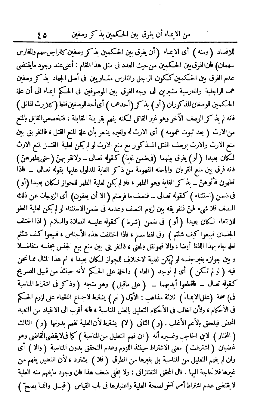 للإفساد (وَمِنْه) أَي الْإِيمَاء (أَن يفرق بَين الْحكمَيْنِ بِذكر وصفين كللراجل سهم وللفارس سَهْمَان) فَإِن الْفرق بَين الْحكمَيْنِ من حَيْثُ الْعدَد فِي مثل هَذَا الْمقَام: أَعنِي عِنْد وجود مَا يَقْتَضِي عدم الْفرق بَين الْحكمَيْنِ ككون الراجل والفارس متساويين فِي أصل الْجِهَاد بِذكر وصفين هما الراجلية والفارسية مشيرين إِلَى وَجه الْفرق بَين الموصوفين فِي الحكم إِيمَاء إِلَى أَن عِلّة الْحكمَيْنِ الوصفان الْمَذْكُورَان (أَو) يذكر (أَحدهمَا) أَي أحد الوصفين فَقَط (كلا يَرث الْقَاتِل) فَإِنَّهُ لم يذكر الْوَصْف الآخر وَهُوَ غير الْقَاتِل لكنه يفهم بِقَرِينَة الْمُقَابلَة، فتخصص الْقَاتِل بِالْمَنْعِ من الْإِرْث (بعد ثُبُوت عُمُومه) أَي الْإِرْث لَهُ وَلغيره يشْعر بِأَن عِلّة الْمَنْع الْقَتْل، فالتفريق بَين منع الْإِرْث وَالْإِرْث بِوَصْف الْقَتْل الْمَذْكُور مَعَ منع الْإِرْث لَو لم يكن لعلية الْقَتْل لمنع الْإِرْث لَكَانَ بَعيدا (أَو) يفرق بَينهمَا (فِي ضمن غَايَة) كَقَوْلِه تَعَالَى - {وَلَا تقربهن (حَتَّى يطهرهن}} فَإِنَّهُ فرق بَين منع القربان وإباحته المفهومة من ذكر الْغَايَة الْمَدْلُول عَلَيْهَا بقوله تَعَالَى - {فَإِذا تطهرن فأتوهن} - بِذكر الْغَايَة وَهُوَ الطُّهْر، فَلَو لم يكن لعلية الطُّهْر للْجُوَاز لَكَانَ بَعيدا (أَو) فِي ضمن (اسْتثِْنَاء) كَقَوْلِه تَعَالَى - {فَنصف مَا فرضتم إِلَّا أَن يعفون} أَي الزَّوْجَات عَن ذَلِك النّصْف فَلَا شَيْء لَهُنَّ فتفريقه بَين لُزُوم النّصْف وَعَدَمه فِي ضمن الِاسْتِثْنَاء لَو لم يكن لعلية الْعَفو للانتفاء لَكَانَ بَعيدا (أَو) فِي ضمن (شَرط) كَقَوْلِه صلى الله عَلَيْهِ وَسلم (إِذا اخْتلف الجنسان فبيعوا كَيفَ شِئْتُم) وَفِي لفظ مُسلم، فَإِذا اخْتلفت هَذِه الْأَجْنَاس، فبيعوا كَيفَ شِئْتُم لَعَلَّه جَاءَ بِهَذَا اللَّفْظ أَيْضا، وَإِلَّا فَهُوَ نقل بِالْمَعْنَى، فالتفريق بَين منع بيع الْجِنْس بِجِنْسِهِ مُتَفَاضلا وَبَين جَوَازه بِغَيْر جنسه لَو لم يكن لعلية الِاخْتِلَاف للْجُوَاز لَكَانَ بَعيدا، ثمَّ هَذَا الْمِثَال مِمَّا نَحن فِيهِ (لَو لم تكن) أَي لم تُوجد (الْفَاء) دَاخِلَة على الحكم لِأَنَّهُ حِينَئِذٍ من قبيل الصَّرِيح كَقَوْلِه تَعَالَى - {فَاقْطَعُوا أَيْدِيهِمَا} - (على مَا قيل) وَهُوَ مُتَّجه (وَذكر فِي اشْتِرَاط الْمُنَاسبَة فِي) صِحَة (علل الْإِيمَاء) ثَلَاثَة مَذَاهِب: الأول (نعم) يشْتَرط لإِجْمَاع الْفُقَهَاء على لُزُوم الحكم فِي الْأَحْكَام، وَلِأَن الْغَالِب فِي الْأَحْكَام التَّعْلِيل بالعلل الْمُنَاسبَة، فَإِنَّهُ أقرب إِلَى الانقياد من التَّعَبُّد الْمَحْض فَيلْحق بالأعم الْأَغْلَب. (و) الثَّانِي (لَا) يشْتَرط لِأَن الْعلية تفهم بِدُونِهَا (و) الثَّالِث (الْمُخْتَار) لِابْنِ الْحَاجِب وَغَيره أَنه (إِن فهم التَّعْلِيل من الْمُنَاسبَة) كَمَا فِي لَا يقْضِي القَاضِي وَهُوَ غَضْبَان (اشْترطت) معنى الِاشْتِرَاط حِينَئِذٍ اللُّزُوم وَعدم التحقق بِدُونِ الْمُنَاسبَة (وَإِلَّا) أَي وَإِن لم يفهم التَّعْلِيل من الْمُنَاسبَة بل بغَيْرهَا من الطّرق (فَلَا) يشْتَرط، لِأَن التَّعْلِيل يفهم من غَيرهَا فَلَا حَاجَة إِلَيْهَا. قَالَ الْمُحَقق التَّفْتَازَانِيّ: وَلَا يخفى ضعف هَذَا فَإِن وجود مَا يفهم مِنْهُ الْعلية لَا يَقْتَضِي عدم اشْتِرَاط أَمر آخر لصِحَّة الْعلية واعتبارها فِي بَاب الْقيَاس (قيل وَإِنَّمَا يَصح)