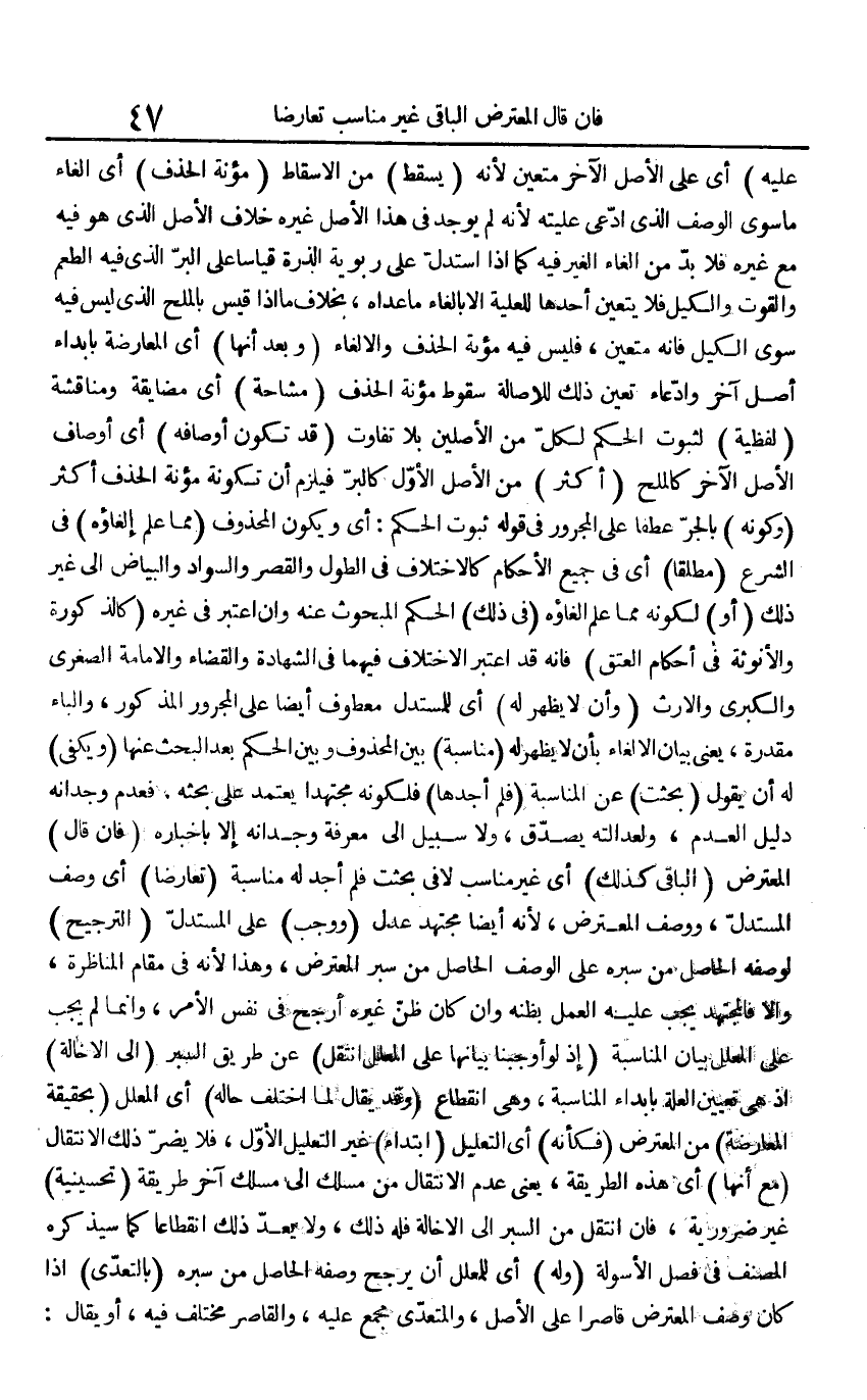 عَلَيْهِ) أَي على الأَصْل الآخر مُتَعَيّن لِأَنَّهُ (يسْقط) من الْإِسْقَاط (مُؤنَة الْحَذف) أَي إِلْغَاء مَا سوى الْوَصْف الَّذِي ادّعى عليته لِأَنَّهُ لم يُوجد فِي هَذَا الأَصْل غَيره خلاف الأَصْل الَّذِي هُوَ فِيهِ مَعَ غَيره فَلَا بُد من إِلْغَاء الْغَيْر فِيهِ كَمَا إِذا اسْتدلَّ على ربوية الذّرة قِيَاسا على الْبر الَّذِي فِيهِ الطّعْم والقوت والكيل فَلَا يتَعَيَّن أَحدهَا للعلية إِلَّا بإلغاء مَا عداهُ، بِخِلَاف مَا إِذا قيس بالملح الَّذِي لَيْسَ فِيهِ سوى الْكَيْل فَإِنَّهُ مُتَعَيّن، فَلَيْسَ فِيهِ مُؤنَة الْحَذف والالغاء (وَبعد أَنَّهَا) أَي الْمُعَارضَة بابداء أصل آخر وادعاء تعين ذَلِك للأصالة سُقُوط مُؤنَة الْحَذف (مشاحة) أَي مضايقة ومناقشة (لفظية) لثُبُوت الحكم لكل من الْأَصْلَيْنِ بِلَا تفَاوت (قد تكون أَوْصَافه) أَي أَوْصَاف الأَصْل الآخر كالملح (أَكثر) من الأَصْل الأول كالبر فَيلْزم أَن تكونة مُؤنَة الْحَذف أَكثر (وَكَونه) بِالْجَرِّ عطفا على الْمَجْرُور فِي قَوْله ثُبُوت الحكم: أَي وَيكون الْمَحْذُوف (مِمَّا علم إلغاؤه) فِي الشَّرْع (مُطلقًا) أَي فِي جَمِيع الْأَحْكَام كالاختلاف فِي الطول وَالْقصر والسواد وَالْبَيَاض إِلَى غير ذَلِك (أَو) لكَونه مِمَّا علم إلغاؤه (فِي ذَلِك) الحكم المبحوث عَنهُ وَإِن اعْتبر فِي غَيره (كالذكورة وَالْأُنُوثَة فِي أَحْكَام الْعتْق) فَإِنَّهُ قد اعْتبر الِاخْتِلَاف فيهمَا فِي الشَّهَادَة وَالْقَضَاء والإمامة الصُّغْرَى والكبرى وَالْإِرْث (وَأَن لَا يظْهر لَهُ) أَي للمستدل مَعْطُوف أَيْضا على الْمَجْرُور الْمَذْكُور، وَالْبَاء مقدرَة، يَعْنِي بَيَان الإلغاء بِأَن لَا يظْهر لَهُ (مُنَاسبَة) بَين الْمَحْذُوف وَبَين الحكم بعد الْبَحْث عَنْهَا (وَيَكْفِي) لَهُ أَن يَقُول (بحثت) عَن الْمُنَاسبَة (فَلم أَجدهَا) فلكونه مُجْتَهدا يعْتَمد على بَحثه. فَعدم وجدانه دَلِيل الْعَدَم، ولعدالته يصدق، وَلَا سَبِيل إِلَى معرفَة وجدانه إِلَّا بإخباره (فَإِن قَالَ) الْمُعْتَرض (الْبَاقِي كَذَلِك) أَي غير مُنَاسِب لَا فِي بحثت فَلم أجد لَهُ مُنَاسبَة (تَعَارضا) أَي وصف الْمُسْتَدلّ، وَوصف الْمُعْتَرض، لِأَنَّهُ أَيْضا مُجْتَهد عدل (وَوَجَب) على الْمُسْتَدلّ (التَّرْجِيح) لوصفه الْحَاصِل من سبره على الْوَصْف الْحَاصِل من سبر الْمُعْتَرض، وَهَذَا لِأَنَّهُ فِي مقَام المناظرة، وَإِلَّا فالمجتهد يجب عَلَيْهِ الْعَمَل بظنه وَإِن كَانَ ظن غَيره أرجح فِي نفس الْأَمر، وَإِنَّمَا لم يجب على الْمُعَلل بَيَان الْمُنَاسبَة (إِذْ لَو أَوجَبْنَا بَيَانهَا على الْمُعَلل انْتقل) عَن طَرِيق السبر (إِلَى الإخالة) إِذْ هِيَ تعْيين الْعلَّة بإبداء الْمُنَاسبَة، وَهِي انْقِطَاع (وَقد يُقَال لما اخْتلف حَاله) أَي الْمُعَلل (بِحَقِيقَة الْمُعَارضَة) من الْمُعْتَرض (فَكَأَنَّهُ) أَي التَّعْلِيل (ابْتِدَاء) غير التَّعْلِيل الأول، فَلَا يضر ذَلِك الِانْتِقَال (مَعَ أَنَّهَا) أَي هَذِه الطَّرِيقَة، يَعْنِي عدم الِانْتِقَال من مَسْلَك إِلَى مَسْلَك آخر طَريقَة (تحسينية) غير ضَرُورِيَّة، فَإِن انْتقل من السبر إِلَى الإخالة فَلهُ ذَلِك، وَلَا يعد ذَلِك انْقِطَاعًا كَمَا سَيذكرُهُ المُصَنّف فِي فصل الأسولة (وَله) أَي للمعلل أَن يرجح وَصفه الْحَاصِل من سبره (بِالتَّعَدِّي) إِذا كَانَ وصف الْمُعْتَرض قاصرا على الأَصْل، والمتعدي مجمع عَلَيْهِ، والقاصر مُخْتَلف فِيهِ، أَو يُقَال: