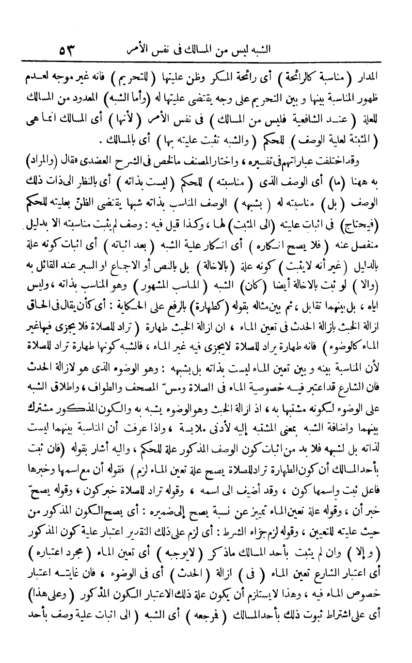 وَقد اخْتلفت عباراتهم فِي تَفْسِيره، وَاخْتَارَ المُصَنّف مَا لخص فِي الشَّرْح العضدي فَقَالَ (وَالْمرَاد) بِهِ هَهُنَا (مَا) أَي الْوَصْف الَّذِي (مناسبته) للْحكم (لَيست بِذَاتِهِ) أَي بِالنّظرِ إِلَى ذَات ذَلِك الْوَصْف (بل) مناسبته لَهُ (بشبهه) الْوَصْف الْمُنَاسب بِذَاتِهِ شبها يَقْتَضِي الظَّن بعليته للْحكم (فَيحْتَاج) فِي إِثْبَات عليته (إِلَى الْمُثبت) لَهَا، وَكَذَا قيل فِيهِ: وصف لم يثبت مناسبته إِلَّا بِدَلِيل مُنْفَصِل عَنهُ (فَلَا يَصح إِنْكَاره) أَي إِنْكَار علية الشّبَه (بعد إثْبَاته) أَي إِثْبَات كَونه عِلّة بِالدَّلِيلِ (غير أَنه لَا يثبت) كَونه عِلّة (بالإخالة) بل بِالنَّصِّ أَو الْإِجْمَاع أَو السبر عِنْد الْقَائِل بِهِ (وَإِلَّا) لَو ثَبت بالإخالة أَيْضا (كَانَ) الشّبَه (الْمُنَاسب الْمَشْهُور) وَهُوَ الْمُنَاسب بِذَاتِهِ، وَلَيْسَ إِيَّاه، بل بَينهمَا تقَابل، ثمَّ بَين مِثَاله بقوله (كطهارة) بِالرَّفْع على الْحِكَايَة: أَي كَأَن يُقَال فِي إِلْحَاق إِزَالَة الْخبث بِإِزَالَة الْحَدث فِي تعين المَاء، إِن إِزَالَة الْخبث طَهَارَة (ترَاد للصَّلَاة فَلَا يجزى فِيهَا غير المَاء كَالْوضُوءِ) فَإِنَّهُ طَهَارَة يُرَاد للصَّلَاة لَا يَجْزِي فِيهِ غير المَاء، فالشبه كَونهَا طَهَارَة ترَاد للصَّلَاة لِأَن الْمُنَاسبَة بَينه وَبَين تعين المَاء لَيست بِذَاتِهِ بل بشبهه: وَهُوَ الْوضُوء الَّذِي هُوَ لإِزَالَة الْحَدث فَإِن الشَّارِع قد اعْتبر فِيهِ خُصُوصِيَّة المَاء فِي الصَّلَاة وَمَسّ الْمُصحف وَالطّواف، وَإِطْلَاق الشّبَه على الْوضُوء لكَونه مشتبها بِهِ، إِذْ إِزَالَة الْخبث وَهُوَ الْوضُوء يشبه بِهِ والكون الْمَذْكُور مُشْتَرك بَينهمَا وَإِضَافَة الشّبَه بِمَعْنى المشتبه إِلَيْهِ لأدنى مُلَابسَة، وَإِذا عرفت أَن الْمُنَاسبَة بَينهمَا لَيست لذاته بل لشبهه فَلَا بُد من إِثْبَات كَون الْوَصْف الْمَذْكُور عِلّة للْحكم، وَإِلَيْهِ أَشَارَ بقوله (فَإِن ثَبت بِأحد المسالك أَن كَون الطَّهَارَة ترَاد للصَّلَاة يَصح عِلّة تعين المَاء لزم) فَقَوله أَن مَعَ اسْمهَا وخبرها فَاعل ثَبت وَاسْمهَا كَون، وَقد أضيف إِلَى اسْمه، وَقَوله ترَاد للصَّلَاة خبر كَون، وَقَوله يَصح خبر أَن، وَقَوله عِلّة تعين المَاء تَمْيِيز عَن نِسْبَة يَصح إِلَى ضَمِيره: أَي يَصح الْكَوْن الْمَذْكُور من حَيْثُ عليته للتعيين، وَقَوله لزم جَزَاء الشَّرْط: أَي لزم على ذَلِك التَّقْدِير اعْتِبَار علية كَون الْمَذْكُور (وَإِلَّا) وَإِن لم يثبت بِأحد المسالك مَا ذكر (لَا يُوجِبهُ) أَي تعين المَاء (مُجَرّد اعْتِبَاره) أَي اعْتِبَار الشَّارِع تعين المَاء (فِي) إِزَالَة (الْحَدث) أَي فِي الْوضُوء، فَإِن غَايَته اعْتِبَار خُصُوص المَاء فِيهِ، وَهَذَا لَا يسْتَلْزم أَن يكون عِلّة ذَلِك الِاعْتِبَار الْكَوْن الْمَذْكُور (وعَلى هَذَا أَي على اشْتِرَاط ثُبُوت ذَلِك بِأحد المسالك (فمرجعه) أَي الشّبَه (إِلَى إِثْبَات علية وصف بِأحد