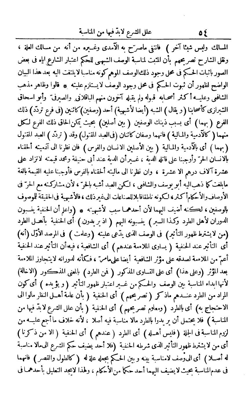 المسالك وَلَيْسَ شَيْئا آخر) فَانْتفى مَا صرح بِهِ الْآمِدِيّ وَغَيره من أَنه من مسالك الْعلَّة، وَنقل الشَّارِح تصريحهم بِأَن الْمُثبت لمناسبة الْوَصْف الشبهي للْحكم اعْتِبَار الشَّارِع إِيَّاه فِي بعض الصُّور بِإِثْبَات الحكم فِي مَحل وجود ذَلِك الْوَصْف الموهم كَونه مناسبا لَا يلْتَفت إِلَيْهِ بعد هَذَا الْبَيَان الْوَاضِح لظُهُور أَن ثُبُوت الحكم فِي مَحل وجود الْوَصْف لَا يسْتَلْزم عليته قَالُوا وَظَاهر مَذْهَب الشَّافِعِي وَعَلِيهِ أَكثر أَصْحَابه قبُوله وَلم يقبله آخَرُونَ مِنْهُم الباقلاني والصيرفي وَأَبُو إِسْحَاق الشِّيرَازِيّ كأصحابنا (وَيُقَال) الشّبَه (أَيْضا لأشبهية) أحد (وصفين) كائنين (فِي فرع تردد) ذَلِك الْفَرْع (بهما) أَي بِسَبَب ذَيْنك الوصفين (بَين أصلين) بِحَيْثُ يُمكن إِلْحَاق ذَلِك الْفَرْع لكل مِنْهُمَا (كالآدمية والمالية) فَإِنَّهُمَا وصفان كائنان (فِي العَبْد الْمَقْتُول) وَقد (تردد) العَبْد الْمَقْتُول (بهما) أَي بالآدمية والمالية (بَين الْأَصْلَيْنِ الْإِنْسَان وَالْفرس) فَإِن نَظرنَا إِلَى آدميته ألحقناه بالإنسان الْحر وأوجبنا على قَاتله الدِّيَة، غير أَن الدِّيَة عِنْد أبي حنيفَة وَمُحَمّد قِيمَته لَا تزاد على عشرَة آلَاف دِرْهَم إِلَّا عشرَة، وان نَظرنَا إِلَى مَالِيَّته ألحقناه بالفرس فأوجبنا عَلَيْهِ الْقيمَة بَالِغَة مَا بلغت كَمَا ذهب إِلَيْهِ أَبُو يُوسُف وَالشَّافِعِيّ، لَكِن العَبْد أشبه بِالْحرِّ، لِأَن مشاركته مَعَ الْحر فِي الْأَوْصَاف وَالْأَحْكَام أَكثر، لكَونه ناطقا قَابلا للصناعات إِلَى غير ذَلِك، فالأشبهية فِي الْحَقِيقَة للموصوف بالوصفين، لكنه أضيف إِلَيْهِمَا لِأَن أَحدهمَا سَبَب لأشبهيته (وَاعْلَم أَن الْحَنَفِيَّة ينسبون الدوران لأهل الطَّرْد وَكَذَا السبر) ينسبونه إِلَيْهِم (إِذْ يُرِيدُونَ) أَي الْحَنَفِيَّة بِأَهْل الطَّرْد (من لَا يشْتَرط ظُهُور التَّأْثِير) فِي الْوَصْف الَّذِي يَدعِي عليته (وَعلمت) فِي المرصد الأول (أَنه) أَي التَّأْثِير عِنْد الْحَنَفِيَّة (يُسَاوِي الملاءمة عِنْدهم) أَي الشَّافِعِيَّة، فِيهِ أَن التَّأْثِير عِنْد الْحَنَفِيَّة أَعم من الملاءمة لصدقه على مُؤثر الشَّافِعِيَّة أَيْضا على مَا مر، فَكَأَنَّهُ لدورانه لَا يتَجَاوَز الملاءمة بعد الْمُؤثر (وعَلى هَذَا) أَي على التَّسَاوِي الْمَذْكُور (فَمن الطَّرْد) بِالْمَعْنَى الْمَذْكُور (الإخالة) لِأَنَّهَا إبداء الْمُنَاسبَة بَين الْوَصْف وَالْحكم من غير اعْتِبَار ظُهُور التَّأْثِير (وَيُؤَيِّدهُ) أَي كَون المُرَاد من الطَّرْد عِنْدهم مَا ذكر (تصريحهم) أَي الْحَنَفِيَّة (بِأَن عَامَّة أهل النّظر مالوا إِلَى الِاحْتِجَاج بِهِ) أَي بالطرد (وَمَعْلُوم تصريحهم) أَي الْحَنَفِيَّة (بِأَن علل الشَّرْع لَا بُد فِيهَا من الْمُنَاسبَة) فَلَا يحْتَمل أَن يُرِيدُوا بالطرد مَالا مُنَاسبَة فِيهِ أصلا، لِأَنَّهُ خلاف مَا أجمع عَلَيْهِ من لُزُوم الْمُنَاسبَة فِي الْجُمْلَة (فَلَيْسَ أَهله) أَي الطَّرْد (عِنْدهم) أَي الْحَنَفِيَّة (إِلَّا من ذكرنَا) أَي من لَا يشْتَرط ظُهُور التَّأْثِير الَّذِي شَرطه الْحَنَفِيَّة (فَلَا أحد يضيف حكم الشَّرْع إِلَى مَالا مُنَاسبَة لَهُ أصلا) أَي إِلَى وصف لَا مُنَاسبَة بَينه وَبَين الحكم بجعله عِلّة لَهُ (كالطول وَالْقصر) فَإِنَّهُمَا فِي عدم الْمُنَاسبَة بِحَيْثُ لَا يضيف إِلَيْهِمَا أحد حكما من الْأَحْكَام، وَلِهَذَا لَا يجد التَّعْلِيل بِأَحَدِهِمَا فِي