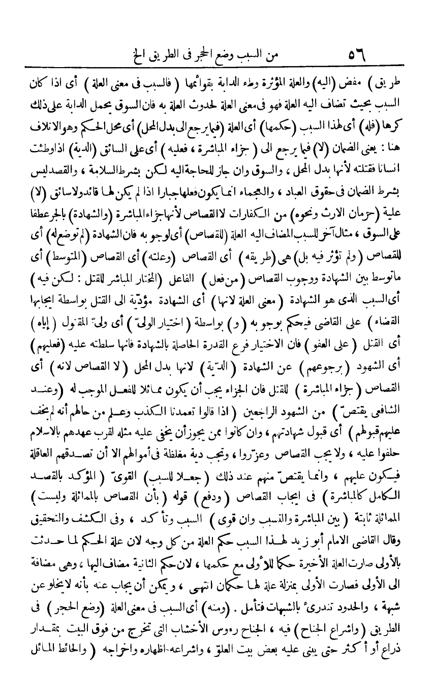 طَرِيق) مفض (إِلَيْهِ) وَالْعلَّة المؤثرة وَطْء الدَّابَّة بقوائمها (فالسبب فِي معنى الْعلَّة) أَي إِذا كَانَ السَّبَب بِحَيْثُ تُضَاف إِلَيْهِ الْعلَّة فَهُوَ فِي معنى الْعلَّة لحدوث الْعلَّة بِهِ فَإِن السُّوق يحمل الدَّابَّة على ذَلِك كرها (فَلهُ) أَي لهَذَا السَّبَب (حكمهَا) أَي الْعلَّة (فِيمَا يرجع إِلَى بدل الْمحل) أَي مَحل الحكم وَهُوَ الْإِتْلَاف هُنَا: يَعْنِي الضَّمَان (لَا) فِيمَا يرجع إِلَى (جَزَاء الْمُبَاشرَة، فَعَلَيهِ) أَي على السَّائِق (الدِّيَة) إِذا وطِئت إنْسَانا فَقتلته لِأَنَّهَا بدل الْمحل، والسوق وَإِن جَازَ للْحَاجة إِلَيْهِ لَكِن بِشَرْط السَّلامَة، وَالْقَصْد لَيْسَ بِشَرْط الضَّمَان فِي حُقُوق الْعباد، والعجماء إِنَّمَا يكون فعلهَا جبارا إِذا لم يكن لَهَا قَائِد وَلَا سائق (لَا) علية (حرمَان الْإِرْث وَنَحْوه) من الْكَفَّارَات لَا الْقصاص لِأَنَّهَا جَزَاء الْمُبَاشرَة (وَالشَّهَادَة) بِالْجَرِّ عطفا على السُّوق، مِثَال آخر للسبب الْمُضَاف إِلَيْهِ الْعلَّة (للْقصَاص) أَي لوُجُوبه فَإِن الشَّهَادَة (لم تُوضَع لَهُ) أَي للْقصَاص (وَلم تُؤثر فِيهِ بل) هِيَ (طَرِيقه) أَي الْقصاص (وعلته) أَي الْقصاص (الْمُتَوَسّط) أَي مَا توَسط بَين الشَّهَادَة وَوُجُوب الْقصاص (من فعل) الْفَاعِل (الْمُخْتَار الْمُبَاشر للْقَتْل: لَكِن فِيهِ) أَي السَّبَب الَّذِي هُوَ الشَّهَادَة (معنى الْعلَّة لِأَنَّهَا) أَي الشَّهَادَة مؤدية إِلَى الْقَتْل بِوَاسِطَة إِيجَابهَا الْقَضَاء) على القَاضِي فَيحكم بِوُجُوبِهِ (و) بِوَاسِطَة (اخْتِيَار الْوَلِيّ) أَي ولي الْمَقْتُول (إِيَّاه) أَي الْقَتْل (على الْعَفو) فَإِن الِاخْتِيَار فرع الْقُدْرَة الْحَاصِلَة بِالشَّهَادَةِ فَإِنَّهَا سلطته عَلَيْهِ (فَعَلَيْهِم) أَي الشُّهُود (برجوعهم) عَن الشَّهَادَة (الدِّيَة) لِأَنَّهَا بدل الْمحل (لَا الْقصاص لِأَنَّهُ) أَي الْقصاص (جَزَاء الْمُبَاشرَة) للْقَتْل فَإِن الْجَزَاء يجب أَن يكون مماثلا للْفِعْل الْمُوجب لَهُ (وَعند الشَّافِعِي يقْتَصّ) من الشُّهُود الراجعين (إِذا قَالُوا تعمدنا الْكَذِب وَعلم من حَالهم أَنه لم يخف عَلَيْهِم قبولهم) أَي قبُول شَهَادَتهم، وَإِن كَانُوا مِمَّن يجوز أَن يخفى عَلَيْهِ مثله لقرب عَهدهم بِالْإِسْلَامِ حلفوا عَلَيْهِ، وَلَا يجب الْقصاص وعزروا، وَتجب دِيَة مُغَلّظَة فِي أَمْوَالهم إِلَّا أَن تصدقهم الْعَاقِلَة فَيكون عَلَيْهِم، وَإِنَّمَا يقْتَصّ مِنْهُم عِنْد ذَلِك (جعلا للسبب) الْقوي (الْمُؤَكّد بِالْقَصْدِ الْكَامِل كالمباشرة) فِي إِيجَاب الْقصاص (وَدفع) قَوْله (بِأَن الْقصاص بالمماثلة وَلَيْسَت) الْمُمَاثلَة ثَابِتَة (بَين الْمُبَاشرَة والتسبب وَإِن قوي) السَّبَب وتأكد، وَفِي الْكَشْف وَالتَّحْقِيق وَقَالَ القَاضِي الإِمَام أَبُو زيد لهَذَا السَّبَب حكم الْعلَّة من كل وَجه لِأَن عِلّة الحكم لما حدثت بِالْأولَى صَارَت الْعلَّة الْأَخِيرَة حكما للأولى مَعَ حكمهَا، لِأَن حكم الثَّانِيَة مُضَاف إِلَيْهَا، وَهِي مُضَافَة إِلَى الأولى فَصَارَت الأولى بِمَنْزِلَة عِلّة لَهَا حكمان انْتهى، وَيُمكن أَن يُجَاب عَنهُ بِأَنَّهُ لَا يَخْلُو عَن شُبْهَة، وَالْحُدُود تندرئ بِالشُّبُهَاتِ فَتَأمل. (وَمِنْه) أَي السَّبَب فِي معنى الْعلَّة (وضع الْحجر) فِي الطَّرِيق (وإشراع الْجنَاح) فِيهِ، الْجنَاح رُءُوس الأخشاب الَّتِي تخرج من فَوق الْبَيْت. بِمِقْدَار ذِرَاع أَو أَكثر حَتَّى يَبْنِي عَلَيْهِ بعض بَيت الْعُلُوّ، وإشراعه إِظْهَاره وإخراجه (والحائط المائل