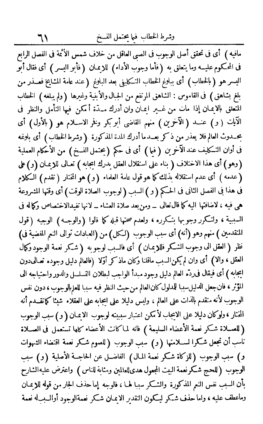 مَا فِيهِ) أَي فِي تحقق أصل الْوُجُوب فِي الصَّبِي الْعَاقِل من خلاف شمس الْأَئِمَّة فِي الْفَصْل الرَّابِع فِي الْمَحْكُوم عَلَيْهِ وَمَا يتَعَلَّق بِهِ (فَأَما وجوب الْأَدَاء) للْإيمَان (فَأَبُو الْيُسْر) أَي فَقَالَ أَبُو الْيُسْر هُوَ (بِالْخِطَابِ) أَي ببلوغ الْخطاب التكليفي بعد الْبلُوغ (عِنْد عَامَّة الْمَشَايِخ فعذر من بلغ بشاهق) فِي الْقَامُوس: الشاهق الْمُرْتَفع من الْجبَال والأبنية وَغَيرهَا (وَلم يبلغهُ) الْخطاب الْمُتَعَلّق بِالْإِيمَان إِذا مَاتَ من غير إِيمَان وَإِن أدْرك مُدَّة أمكن فِيهَا التَّأَمُّل وَالنَّظَر فِي الْآيَات (و) عِنْد (الآخرين) مِنْهُم القَاضِي أَبُو بكر وفخر الْإِسْلَام هُوَ (بِالْأولِ) أَي بحدوث الْعَالم فَلَا يعْذر من ذكر بَعْدَمَا أدْرك الْمدَّة الْمَذْكُورَة (وَشرط الْخطاب) أَي بُلُوغه فِي أَوَان التَّكْلِيف عِنْد الآخرين (فِيمَا) أَي فِي حكم (يحْتَمل النّسخ) من الْأَحْكَام العملية (وَهُوَ) أَي هَذَا الِاخْتِلَاف (بِنَاء على اسْتِقْلَال الْعقل يدْرك إِيجَابه) تَعَالَى للْإيمَان (و) على (عَدمه) أَي عدم استقلاله بذلك كَمَا هُوَ قَول عَامَّة الْعلمَاء (و) هُوَ الْمُخْتَار (تقدم) الْكَلَام فِي هَذَا فِي الْفَصْل الثَّانِي فِي الحكم (و) السَّبَب (لوُجُوب الصَّلَاة الْوَقْت) أَي وَقتهَا الْمَشْرُوعَة هِيَ فِيهِ، لإضافتها إِلَيْهِ كَمَا قَالَ تَعَالَى - {وَمن بعد صَلَاة الْعشَاء} - لِأَنَّهَا تفِيد الِاخْتِصَاص وكماله فِي السَّبَبِيَّة، ولتكرر وُجُوبهَا بتكرره، وَلعدم صِحَّتهَا قبله كَمَا قَالُوا (وَالْوَجْه) الْوَجِيه (قَول الْمُتَقَدِّمين) مِنْهُم وَهُوَ (أَنه) أَي سَبَب الْوُجُوب (لكل) من (الْعِبَادَات توالي النعم المفضية فِي) نظر (الْعقل إِلَى وجوب الشُّكْر فللإيمان) أَي فالسبب لوُجُوبه (شكر نعْمَة الْوُجُود وَكَمَال الْعقل، وَإِلَّا) أَي وَإِن لم يكن السَّبَب مَا قُلْنَا وَكَانَ مَا ذكر أَولا (فالعالم دَلِيل وجوده تَعَالَى دون إِيجَابه) أَي فَيُقَال فِي رده الْعَالم دَلِيل وجود مبدأ الْوَاجِب لبُطْلَان التسلسل والدور واحتياجه إِلَى الْمُؤثر، فَإِن جعل الدَّلِيل سَببا للمدلول كَانَ الْعَالم من حَيْثُ النّظر فِيهِ سَببا للْعلم بِالْوُجُوب، دون نفس الْوُجُوب لِأَنَّهُ مُتَقَدم بِالذَّاتِ على الْعَالم، وَلَيْسَ دَلِيلا على إِيجَابه على الْعُقَلَاء شَيْئا كَمَا تقدم أَنه الْمُخْتَار، وَلَو كَانَ دَلِيلا على الْإِيجَاب لأمكن اعْتِبَار سببيته لوُجُوب الْإِيمَان (و) سَبَب الْوُجُوب (للصَّلَاة شكر نعْمَة الْأَعْضَاء السليمة) فَإِنَّهُ لما كَانَت الْأَعْضَاء كلهَا تسْتَعْمل فِي الصَّلَاة ناسب أَن تجْعَل شكرا لسلامتها (و) سَبَب الْوُجُوب (للصَّوْم شكر نعْمَة اقْتِضَاء الشَّهَوَات و) سَبَب الْوُجُوب (لِلزَّكَاةِ شكر نعْمَة المَال) الْفَاضِل عَن الْحَاجة الْأَصْلِيَّة (و) سَبَب الْوُجُوب (لِلْحَجِّ شكر نعْمَة الْبَيْت المجعول هدى للْعَالمين ومثابة للنَّاس) وَاعْترض عَلَيْهِ الشَّارِح بِأَن السَّبَب نفس النعم الْمَذْكُورَة وَالشُّكْر سَببا لَهَا، فَالْوَجْه إِمَّا حذف الْجَار من قَوْله للْإيمَان وَمَا عطف عَلَيْهِ، وَإِمَّا حذف شكر ليَكُون التَّقْدِير الْإِيمَان شكر نعْمَة الْوُجُود أَو السَّبَب لَهُ نعْمَة