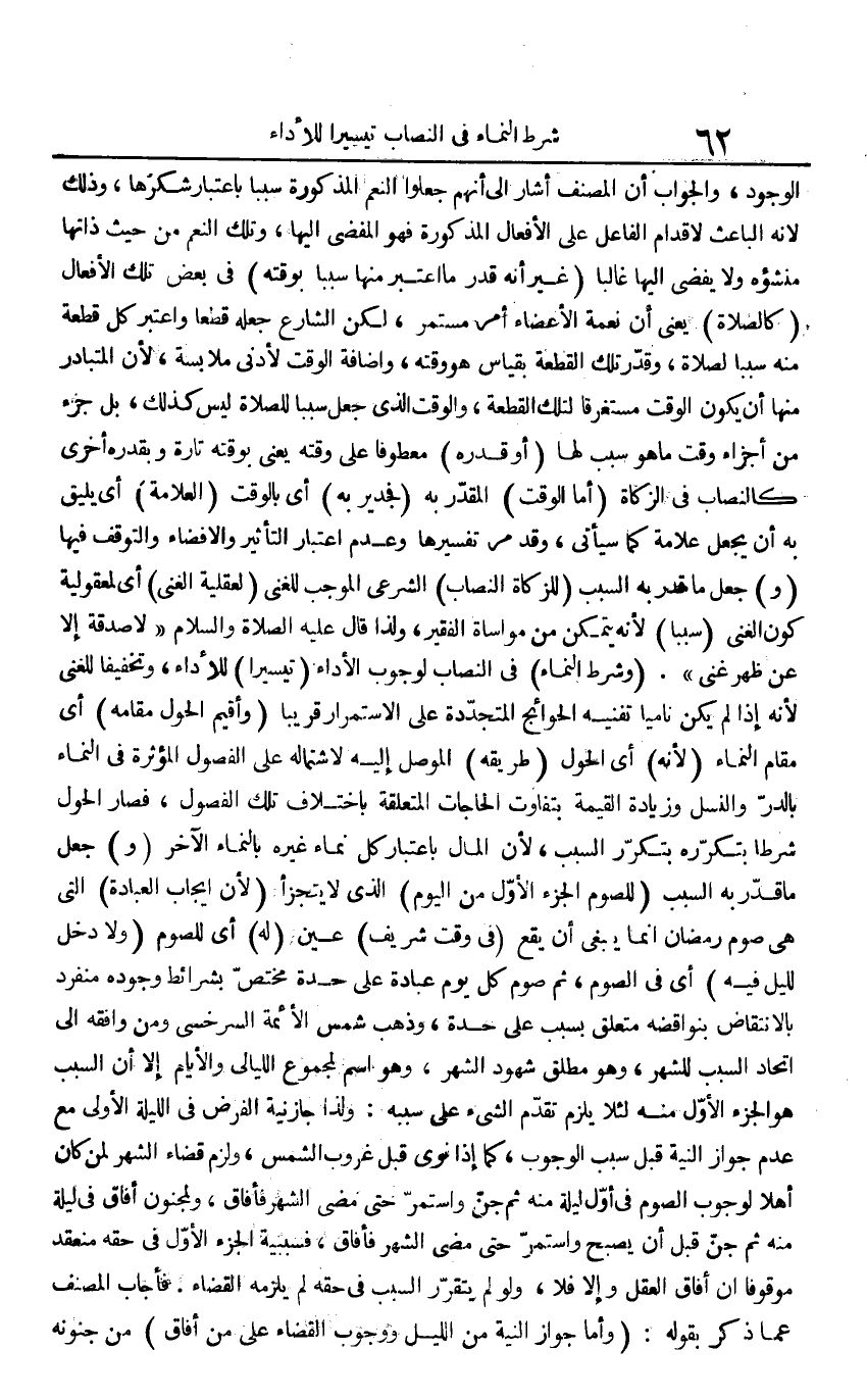 الْوُجُود، وَالْجَوَاب أَن المُصَنّف أَشَارَ إِلَى أَنهم جعلُوا النعم الْمَذْكُورَة سَببا بِاعْتِبَار شكرها، وَذَلِكَ لِأَنَّهُ الْبَاعِث لاقدام الْفَاعِل على الْأَفْعَال الْمَذْكُورَة فَهُوَ المفضي إِلَيْهَا، وَتلك النعم من حَيْثُ ذَاتهَا منشؤه وَلَا يُفْضِي إِلَيْهَا غَالِبا (غير أَنه قدر مَا اعْتبر مِنْهَا سَببا بوقته) فِي بعض تِلْكَ الْأَفْعَال (كَالصَّلَاةِ) يَعْنِي أَن نعْمَة الْأَعْضَاء أَمر مُسْتَمر، لَكِن الشَّارِع جعله قطعا وَاعْتبر كل قِطْعَة مِنْهُ سَببا لصَلَاة، وَقدر تِلْكَ الْقطعَة بِقِيَاس هُوَ وقته، وَإِضَافَة الْوَقْت لأدنى مُلَابسَة، لِأَن الْمُتَبَادر مِنْهَا أَن يكون الْوَقْت مُسْتَغْرقا لتِلْك الْقطعَة، وَالْوَقْت الَّذِي جعل سَببا للصَّلَاة لَيْسَ كَذَلِك، بل جُزْء من أَجزَاء وَقت مَا هُوَ سَبَب لَهَا (أَو قدره) مَعْطُوفًا على وقته يَعْنِي بوقته تَارَة وبقدره أُخْرَى كالنصاب فِي الزَّكَاة (أما الْوَقْت) الْمُقدر بِهِ (فجدير بِهِ) أَي بِالْوَقْتِ (الْعَلامَة) أَي يَلِيق بِهِ أَن يَجْعَل عَلامَة كَمَا سَيَأْتِي، وَقد مر تَفْسِيرهَا وَعدم اعْتِبَار التَّأْثِير والإفضاء والتوقف فِيهَا (و) جعل مَا قدر بِهِ السَّبَب (لِلزَّكَاةِ النّصاب) الشَّرْعِيّ الْمُوجب للغني (لعقلية الْغَنِيّ) أَي لمعقولية كَون الْغَنِيّ (سَببا) لِأَنَّهُ يتَمَكَّن من مواساة الْفَقِير، وَلذَا قَالَ صلى الله عَلَيْهِ وَسلم " لَا صَدَقَة إِلَّا عَن ظهر غنى ". (وَشرط النَّمَاء) فِي النّصاب لوُجُوب الْأَدَاء (تيسيرا) للْأَدَاء وتخفيفا للغني لِأَنَّهُ إِذا لم يكن ناميا تفنيه الْحَوَائِج المتجددة على الِاسْتِمْرَار قَرِيبا (وأقيم الْحول مقَامه) أَي مقَام النَّمَاء (لِأَنَّهُ) أَي الْحول (طَرِيقه) الْموصل إِلَيْهِ لاشْتِمَاله على الْفُصُول المؤثرة فِي النَّمَاء بالدر والنسل وَزِيَادَة الْقيمَة بتفاوت الْحَاجَات الْمُتَعَلّقَة باخْتلَاف تِلْكَ الْفُصُول، فَصَارَ الْحول شرطا بتكرره بِتَكَرُّر السَّبَب، لِأَن المَال بِاعْتِبَار كل نَمَاء غَيره بالنماء الآخر (و) جعل مَا قدر بِهِ السَّبَب (للصَّوْم الْجُزْء الأول من الْيَوْم) الَّذِي لَا يتَجَزَّأ (لِأَن إِيجَاب الْعِبَادَة) الَّتِي هِيَ صَوْم رَمَضَان إِنَّمَا يَبْغِي أَن يَقع (فِي وَقت شرِيف) عين (لَهُ) أَي للصَّوْم (وَلَا دخل لِليْل فِيهِ) أَي فِي الصَّوْم، ثمَّ صَوْم كل يَوْم عبَادَة على حِدة مُخْتَصّ بشرائط وجوده مُنْفَرد الانتقاض بنواقضه مُتَعَلق بِسَبَب على حِدة، وَذهب شمس الْأَئِمَّة السَّرخسِيّ وَمن وَافقه إِلَى اتِّحَاد السَّبَب للشهر، وَهُوَ مُطلق شُهُود الشَّهْر، وَهُوَ اسْم لمجموع اللَّيَالِي وَالْأَيَّام إِلَى أَن السَّبَب هُوَ الْجُزْء الأول مِنْهُ لِئَلَّا يلْزم تقدم الشَّيْء على سَببه: وَلذَا جَازَ نيه الْفَرْض فِي اللَّيْلَة الأولى مَعَ عدم جَوَاز النِّيَّة قبل سَبَب الْوُجُوب، كَمَا إِذا نوى قبل غرُوب الشَّمْس، وَلزِمَ قَضَاء الشَّهْر لمن كَانَ أَهلا لوُجُوب الصَّوْم فِي أول لَيْلَة مِنْهُ ثمَّ جن وَاسْتمرّ حَتَّى مضى الشَّهْر فأفاق، ولمجنون أَفَاق فِي لَيْلَة مِنْهُ ثمَّ جن قبل أَن يصبح وَاسْتمرّ حَتَّى مضى الشَّهْر فأفاق، فسببية الْجُزْء الأول فِي حَقه مُنْعَقد مَوْقُوفا أَن أَفَاق الْعقل وَإِلَّا فَلَا، وَلَو لم يَتَقَرَّر السَّبَب فِي حَقه لم يلْزمه الْقَضَاء. فَأجَاب المُصَنّف عَمَّا ذكر بقوله: (وَأما جَوَاز النِّيَّة من اللَّيْل وَوُجُوب الْقَضَاء على من أَفَاق) من جُنُونه
