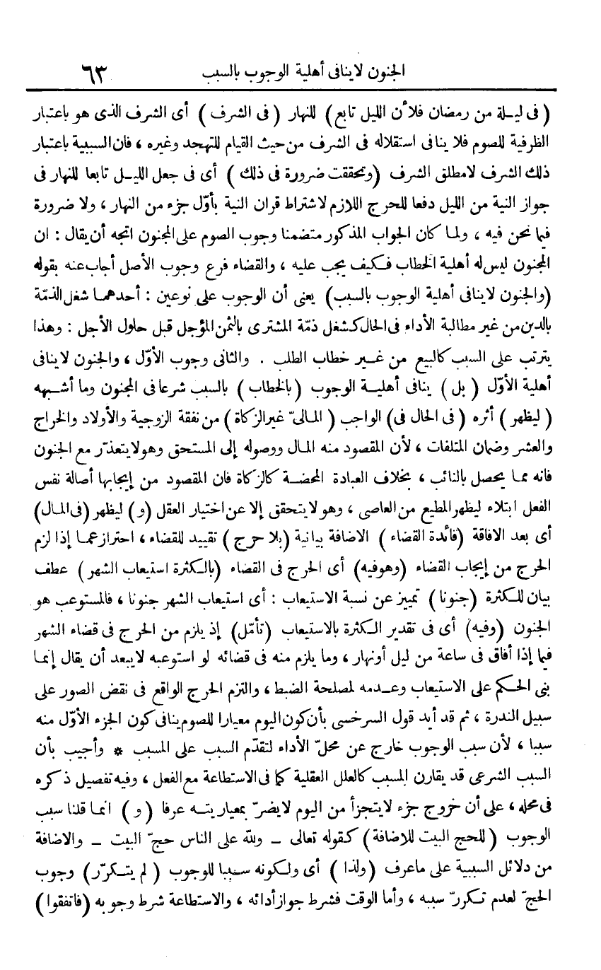 (فِي لَيْلَة من رَمَضَان فَلِأَن اللَّيْل تَابع) للنهار (فِي الشّرف) أَي الشّرف الَّذِي هُوَ بِاعْتِبَار الظَّرْفِيَّة للصَّوْم فَلَا يُنَافِي استقلاله فِي الشّرف من حَيْثُ الْقيام للتهجد وَغَيره، فَإِن السَّبَبِيَّة بِاعْتِبَار ذَلِك الشّرف لَا مُطلق الشّرف (وتحققت ضَرُورَة فِي ذَلِك) أَي فِي جعل اللَّيْل تَابعا للنهار فِي جَوَاز النِّيَّة من اللَّيْل دفعا للْحَرج اللَّازِم لاشْتِرَاط قرَان النِّيَّة بِأول جُزْء من النَّهَار، وَلَا ضَرُورَة فِيمَا نَحن فِيهِ، وَلما كَانَ الْجَواب الْمَذْكُور متضمنا وجوب الصَّوْم على الْمَجْنُون اتجه أَن يُقَال إِن الْمَجْنُون لَيْسَ لَهُ أَهْلِيَّة الْخطاب فَكيف يجب عَلَيْهِ، وَالْقَضَاء فرع وجوب الأَصْل أجَاب عَنهُ بقوله (وَالْجُنُون لَا يُنَافِي أَهْلِيَّة الْوُجُوب بِالسَّبَبِ) يَعْنِي أَن الْوُجُوب على نَوْعَيْنِ: أَحدهمَا شغل الذِّمَّة بِالدّينِ من غير مُطَالبَة الْأَدَاء فِي الْحَال كشغل ذمَّة المُشْتَرِي بِالثّمن الْمُؤَجل قبل حُلُول الْأَجَل: وَهَذَا يَتَرَتَّب على السَّبَب كَالْبيع من غير خطاب الطّلب. وَالثَّانِي وجوب الأول، وَالْجُنُون لَا يُنَافِي أَهْلِيَّة الأول (بل) يُنَافِي أَهْلِيَّة الْوُجُوب (بِالْخِطَابِ) بِالسَّبَبِ شرعا فِي الْمَجْنُون وَمَا أشبهه (ليظْهر) أَثَره (فِي الْحَال فِي) الْوَاجِب (المالي غير الزَّكَاة) من نَفَقَة الزَّوْجِيَّة وَالْأَوْلَاد وَالْخَرَاج وَالْعشر وَضَمان الْمُتْلفَات، لِأَن الْمَقْصُود مِنْهُ المَال ووصوله إِلَى الْمُسْتَحق وَهُوَ لَا يتَعَذَّر مَعَ الْجُنُون فَإِنَّهُ مِمَّا يحصل بالنائب، بِخِلَاف الْعِبَادَة الْمَحْضَة كَالزَّكَاةِ فَإِن الْمَقْصُود من إِيجَابهَا أَصَالَة نفس الْفِعْل ابتلاء ليظْهر الْمُطِيع من العَاصِي، وَهُوَ لَا يتَحَقَّق إِلَّا عَن اخْتِيَار الْعقل (و) ليظْهر (فِي المَال) أَي بعد الْإِفَاقَة (فَائِدَة الْقَضَاء) الْإِضَافَة بَيَانِيَّة (بِلَا حرج) تَقْيِيد للْقَضَاء، احْتِرَاز عَمَّا إِذا لزم الْحَرج من إِيجَاب الْقَضَاء (وَهُوَ فِيهِ) أَي الْحَرج فِي الْقَضَاء (بِالْكَثْرَةِ اسْتِيعَاب الشَّهْر) عطف بَيَان للكثرة (جنونا) تَمْيِيز عَن نِسْبَة الِاسْتِيعَاب: أَي اسْتِيعَاب الشَّهْر جنونا، فالمستوعب هُوَ الْجُنُون (وَفِيه) أَي فِي تَقْدِير الْكَثْرَة بالاستيعاب (تَأمل) إِذْ يلْزم من الْحَرج فِي قَضَاء الشَّهْر فِيمَا إِذا أَفَاق فِي سَاعَة من ليل أَو نَهَار، وَمَا يلْزم مِنْهُ فِي قَضَائِهِ لَو استوعبه لَا يبعد أَن يُقَال إِنَّمَا بنى الحكم على الِاسْتِيعَاب وَعَدَمه لمصْلحَة الضَّبْط، وَالْتزم الْحَرج الْوَاقِع فِي نقض الصُّور على سَبِيل الندرة، ثمَّ قد أيد قَول السَّرخسِيّ بِأَن كَون الْيَوْم معيارا للصَّوْم يُنَافِي كَون الْجُزْء الأول مِنْهُ سَببا، لِأَن سَبَب الْوُجُوب خَارج عَن مَحل الْأَدَاء لتقدم السَّبَب على الْمُسَبّب وَأجِيب بِأَن السَّبَب الشَّرْعِيّ قد يقارن الْمُسَبّب كالعلل الْعَقْلِيَّة كَمَا فِي الِاسْتِطَاعَة مَعَ الْفِعْل، وَفِيه تَفْصِيل ذكره فِي مَحَله، على أَن خُرُوج جُزْء لَا يتَجَزَّأ من الْيَوْم لَا يضر بمعياريته عرفا (و) إِنَّمَا قُلْنَا سَبَب الْوُجُوب (لِلْحَجِّ الْبَيْت للإضافة) كَقَوْلِه تَعَالَى - {وَللَّه على النَّاس حج الْبَيْت} - وَالْإِضَافَة من دَلَائِل السَّبَبِيَّة على مَا عرف (وَلذَا) أَي ولكونه سَببا للْوُجُوب (لم يتَكَرَّر) وجوب الْحَج لعدم تكَرر سَببه، وَأما الْوَقْت فَشرط جَوَاز أَدَائِهِ، والاستطاعة شَرط وُجُوبه (فاتفقوا)