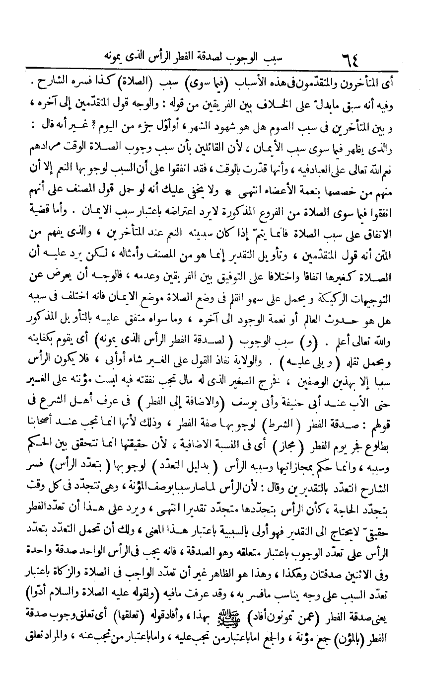 أَي الْمُتَأَخّرُونَ والمتقدمون فِي هَذِه الْأَسْبَاب (فِيمَا سوى) سَبَب (الصَّلَاة) كَذَا فسره الشَّارِح. وَفِيه أَنه سبق مَا يدل على الْخلاف بَين الْفَرِيقَيْنِ من قَوْله: وَالْوَجْه قَول الْمُتَقَدِّمين إِلَى آخِره، وَبَين الْمُتَأَخِّرين فِي سَبَب الصَّوْم هَل هُوَ شُهُود الشَّهْر، أَو أول جُزْء من الْيَوْم؟ غير أَنه قَالَ: وَالَّذِي يظْهر فِيمَا سوى سَبَب الْأَيْمَان، لِأَن الْقَائِلين بِأَن سَبَب وجوب الصَّلَاة الْوَقْت مُرَادهم نعم الله تَعَالَى على الْعباد فِيهِ، وَأَنَّهَا قدرت بِالْوَقْتِ، فقد اتَّفقُوا على أَن السَّبَب لوُجُوبهَا النعم إِلَّا أَن مِنْهُم من خصصها بِنِعْمَة الْأَعْضَاء انْتهى وَلَا يخفى عَلَيْك أَنه لَو حمل قَول المُصَنّف على أَنهم اتَّفقُوا فِيمَا سوى الصَّلَاة من الْفُرُوع الْمَذْكُورَة لَا يرد اعتراضه بِاعْتِبَار سَبَب الْإِيمَان. وَأما قَضِيَّة الِاتِّفَاق على سَبَب الصَّلَاة فَإِنَّمَا يتم إِذا كَانَ سببيته النعم عِنْد الْمُتَأَخِّرين، وَالَّذِي يفهم من الْمَتْن أَنه قَول الْمُتَقَدِّمين، وَتَأْويل التَّقْدِير إِنَّمَا هُوَ من المُصَنّف وَأَمْثَاله، لَكِن يرد عَلَيْهِ أَن الصَّلَاة كَغَيْرِهَا اتِّفَاقًا واختلافا على التَّوْفِيق بَين الْفَرِيقَيْنِ وَعَدَمه، فَالْوَجْه أَن يعرض عَن التوجيهات الرَّكِيكَة وَيحمل على سَهْو الْقَلَم فِي وضع الصَّلَاة مَوضِع الْإِيمَان، فَإِنَّهُ اخْتلف فِي سَببه هَل هُوَ حُدُوث الْعَالم أَو نعْمَة الْوُجُود إِلَى آخِره، وَمَا سواهُ مُتَّفق عَلَيْهِ بالتأويل الْمَذْكُور وَالله تَعَالَى أعلم. (و) سَبَب الْوُجُوب (لصدقة الْفطر الرَّأْس الَّذِي يمونه) أَي يقوم بكفايته وَيحمل ثقله (ويلي عَلَيْهِ). وَالْولَايَة نَفاذ القَوْل على الْغَيْر شَاءَ أَو أَبى، فَلَا يكون الرَّأْس سَببا إِلَّا بِهَذَيْنِ الوصفين، فَخرج الصَّغِير الَّذِي لَهُ مَال تجب نَفَقَته فِيهِ لَيست مُؤْنَته على الْغَيْر حَتَّى الْأَب عِنْد أبي حنيفَة وَأبي يُوسُف (وَالْإِضَافَة إِلَى الْفطر) فِي عرف أهل الشَّرْع فِي قَوْلهم: صَدَقَة الْفطر (الشَّرْط) لوُجُوبهَا صفة الْفطر، وَذَلِكَ لِأَنَّهَا إِنَّمَا تجب عِنْد أَصْحَابنَا بِطُلُوع فجر يَوْم الْفطر (مجَاز) أَي فِي النِّسْبَة الإضافية، لِأَن حَقِيقَتهَا إِنَّمَا تتَحَقَّق بَين الحكم وَسَببه، وَإِنَّمَا حكم بمجازاتيها وَسَببه الرَّأْس (بِدَلِيل التَّعَدُّد) لوُجُوبهَا (بِتَعَدُّد الرَّأْس) فسر الشَّارِح التَّعَدُّد بالتقديرين وَقَالَ: لِأَن الرَّأْس لما صَار سَببا بِوَصْف الْمُؤْنَة، وَهِي تتجدد فِي كل وَقت بتجدد الْحَاجة، كَأَن الرَّأْس بتجددها متجدد تَقْديرا انْتهى، وَيرد على هَذَا أَن تعدد الْفطر حَقِيقِيّ لَا يحْتَاج إِلَى التَّقْدِير فَهُوَ أولى بالسببية بِاعْتِبَار هَذَا الْمَعْنى، وَلَك أَن تحمل التَّعَدُّد بِتَعَدُّد الرَّأْس على تعدد الْوُجُوب بِاعْتِبَار مُتَعَلّقه وَهُوَ الصَّدَقَة، فَإِنَّهُ يجب فِي الرَّأْس الْوَاحِد صَدَقَة وَاحِدَة وَفِي الِاثْنَيْنِ صدقتان وَهَكَذَا، وَهَذَا هُوَ الظَّاهِر غير أَن تعدد الْوَاجِب فِي الصَّلَاة وَالزَّكَاة بِاعْتِبَار تعدد السَّبَب على وَجه يُنَاسب مَا فسر بِهِ، وَقد عرفت مَا فِيهِ (وَلقَوْله صلى الله عَلَيْهِ وَسلم أَدّوا) يَعْنِي صَدَقَة الْفطر (عَمَّن تمونون أَفَادَ) صلى الله عَلَيْهِ وَسلم بِهَذَا، وَأفَاد قَوْله (تعلقهَا) أَي تعلق وجوب صَدَقَة الْفطر (بالمؤن) جمع مُؤنَة، وَالْجمع إِمَّا بِاعْتِبَار من تجب عَلَيْهِ، وَإِمَّا بِاعْتِبَار من تجب عَنهُ، وَالْمرَاد تعلق