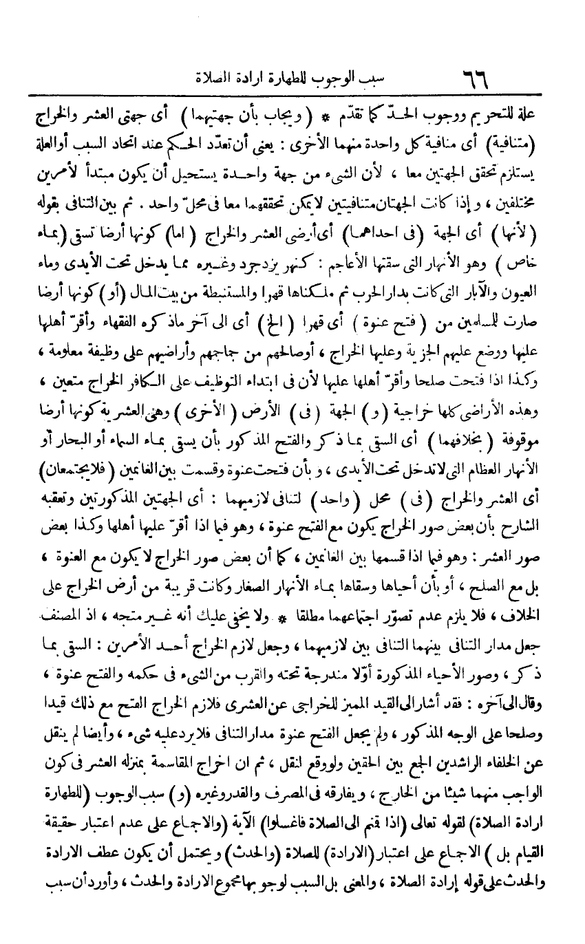 عِلّة للتَّحْرِيم وَوُجُوب الْجد كَمَا تقدم (وَيُجَاب بِأَن جهتيهما) أَي جهتي الْعشْر وَالْخَرَاج (متنافية) أَي مُنَافِيَة كل وَاحِدَة مِنْهُمَا الْأُخْرَى: يَعْنِي أَن تعدد الحكم عِنْد اتِّحَاد السَّبَب أَو الْعلَّة يسْتَلْزم تحقق الْجِهَتَيْنِ، مَعًا، لِأَن الشَّيْء من جِهَة وَاحِدَة يَسْتَحِيل أَن يكون مُبْتَدأ لأمرين مُخْتَلفين، وَإِذا كَانَت الجهتان متنافيتين لَا يُمكن تحققهما مَعًا فِي مَحل وَاحِد. ثمَّ بَين التَّنَافِي بقوله (لِأَنَّهَا) أَي الْجِهَة (فِي إِحْدَاهمَا) أَي أرضي الْعشْر وَالْخَرَاج (أما) كَونهَا أَرضًا تسقى (بِمَاء خَاص) وَهُوَ الْأَنْهَار الَّتِي سقتها الْأَعَاجِم: كنهر يزدجرد وَغَيره مِمَّا يدْخل تَحت الْأَيْدِي وَمَاء الْعُيُون والآبار الَّتِي كَانَت بدار الْحَرْب ثمَّ ملكناها قهرا والمستنبطة من بَيت المَال (أَو) كَونهَا أَرضًا صَارَت للْمُسلمين من (فتح عنْوَة) أَي قهرا (الخ) أَي إِلَى آخر مَا ذكره الْفُقَهَاء وَأقر أَهلهَا عَلَيْهَا وَوضع عَلَيْهِم الْجِزْيَة وَعَلَيْهَا الْخراج، أَو صَالحهمْ من جماجمهم وأراضيهم على وَظِيفَة مَعْلُومَة، وَكَذَا إِذا فتحت صلحا وَأقر أَهلهَا عَلَيْهَا لِأَن فِي ابْتِدَاء التوظيف على الْكَافِر الْخراج مُتَعَيّن، وَهَذِه الْأَرَاضِي كلهَا خَرَاجِيَّة (و) الْجِهَة (فِي) الأَرْض (الْأُخْرَى) وَهِي العشرية كَونهَا أَرضًا مَوْقُوفَة (بخلافهما) أَي السَّقْي بِمَا ذكر وَالْفَتْح الْمَذْكُور بِأَن يسقى بِمَاء السَّمَاء أَو الْبحار أَو الْأَنْهَار الْعِظَام الَّتِي لَا تدخل تَحت الْأَيْدِي، وَبِأَن فتحت عنْوَة وَقسمت بَين الْغَانِمين (فَلَا يَجْتَمِعَانِ) أَي الْعشْر وَالْخَرَاج (فِي) مَحل (وَاحِد) لتنافي لازميهما: أَي الْجِهَتَيْنِ المذكورتين وَتعقبه الشَّارِح بِأَن بعض صور الْخراج يكون مَعَ الْفَتْح عنْوَة، وَهُوَ فِيمَا إِذا أقرّ عَلَيْهَا أَهلهَا وَكَذَا بعض صور الْعشْر: وَهُوَ فِيمَا إِذا قسمهَا بَين الْغَانِمين، كَمَا أَن بعض صور الْخراج لَا يكون مَعَ العنوة، بل مَعَ الصُّلْح، أَو بِأَن أَحْيَاهَا وسقاها بِمَاء الْأَنْهَار الصغار وَكَانَت قريبَة من أَرض الْخراج على الْخلاف، فَلَا يلْزم عدم تصور اجْتِمَاعهمَا مُطلقًا وَلَا يخفى عَلَيْك أَنه غير مُتَّجه، إِذْ المُصَنّف جعل مدَار التَّنَافِي بَينهمَا التَّنَافِي بَين لازميهما، وَجعل لَازم الْخراج أحد الْأَمريْنِ: السَّقْي بِمَا ذكر، وصور الْأَحْيَاء الْمَذْكُورَة أَولا مندرجة تَحْتَهُ والقرب من الشَّيْء فِي حكمه وَالْفَتْح عنْوَة، وَقَالَ إِلَى آخِره: فقد أَشَارَ إِلَى الْقَيْد الْمُمَيز للخراجي عَن العشري فلازم الْخراج الْفَتْح مَعَ ذَلِك قيدا وصلحا على الْوَجْه الْمَذْكُور، وَلم يَجْعَل الْفَتْح عنْوَة مدَار التَّنَافِي فَلَا يرد عَلَيْهِ شَيْء، وَأَيْضًا لم ينْقل عَن الْخُلَفَاء الرَّاشِدين الْجمع بَين الْحَقَّيْنِ وَلَو وَقع لنقل، ثمَّ إِن إِخْرَاج الْمُقَاسَمَة بِمَنْزِلَة الْعشْر فِي كَون الْوَاجِب مِنْهُمَا شَيْئا من الْخَارِج، ويفارقه فِي الْمصرف وَالْقدر وَغَيره (و) سَبَب الْوُجُوب (للطَّهَارَة إِرَادَة الصَّلَاة) لقَوْله تَعَالَى {إِذا قُمْتُم إِلَى الصَّلَاة فَاغْسِلُوا} الْآيَة (وَالْإِجْمَاع على عدم اعْتِبَار حَقِيقَة الْقيام بل) الْإِجْمَاع على اعْتِبَار (الْإِرَادَة) للصَّلَاة (وَالْحَدَث) وَيحْتَمل أَن يكون عطف الْإِرَادَة وَالْحَدَث على قَوْله إِرَادَة الصَّلَاة، وَالْمعْنَى بل السَّبَب لوُجُوبهَا مَجْمُوع الْإِرَادَة وَالْحَدَث، وَأورد أَن سَبَب