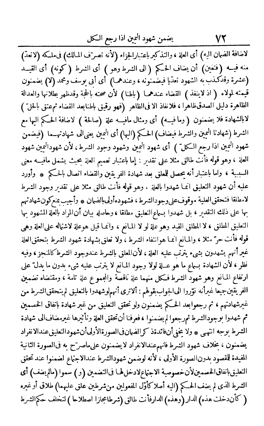 لإضافة الضَّمَان إِلَيْهِ) أَي الْعلَّة، والتذكير بِاعْتِبَار الْجَزَاء (لِأَنَّهُ تصرف الْمَالِك) فِي ملكه (لَا تعد) مِنْهُ فِيهِ (فَتعين) أَن يُضَاف الحكم (إِلَى الشَّرْط وَهُوَ) أَي الشَّرْط (كَونه) أَي الْقَيْد (عشرَة وَقد كذب بِهِ الشُّهُود تَعَديا فيضمنونه، وَعِنْدَهُمَا) أَي أبي يُوسُف وَمُحَمّد (لَا) يضمنُون قِيمَته لمَوْلَاهُ (إِذْ لَا ينفذ) الْقَضَاء عِنْدهمَا (بَاطِنا) لِأَن صِحَّته بِالْحجَّةِ وَقد ظهر بُطْلَانهَا وَالْعَدَالَة الظَّاهِرَة دَلِيل الصدْق ظَاهرا، فَلَا نَفاذ إِلَّا فِي الظَّاهِر (فَهُوَ رَقِيق بَاطِنا بعد الْقَضَاء ثمَّ عتق بِالْحلِّ) لَا بِالشَّهَادَةِ فَلَا يضمنُون (وَمَا فِيهِ) أَي وَمِثَال مَا فِيهِ عِلّة (صَالِحَة) لإضافة الحكم إِلَيْهَا مَعَ الشَّرْط (شهادتا الْيَمين وَالشّرط فيضاف) الحكم (إِلَيْهَا) أَي الْيَمين يَعْنِي إِلَى شَهَادَتهمَا (فَيضمن شُهُود الْيَمين إِذا رَجَعَ الْكل) أَي شُهُود الْيَمين وشهود وجود الشَّرْط، لِأَن شُهُود الْيَمين شُهُود الْعلَّة، وَهُوَ قَوْله فَأَنت طَالِق مثلا على تَقْدِير: إِمَّا بِاعْتِبَار تَعْمِيم الْعلَّة بِحَيْثُ يَشْمَل مَا فِيهِ معنى السَّبَبِيَّة، وَإِمَّا بِاعْتِبَار أَنه يحصل للمعلق بعد شَهَادَة الْفَرِيقَيْنِ وَالْقَضَاء اتِّصَال بالحكم وَأورد عَلَيْهِ أَن شُهُود التَّعْلِيق إِنَّمَا شهدُوا بِالْعِلَّةِ. وَهُوَ قَوْله فَأَنت طَالِق مثلا على تَقْدِير وجود الشَّرْط لَا مُطلقًا فتحقق الْعلية مَوْقُوف على وجود الشَّرْط، فشهوده أولى بِالضَّمَانِ وَأجِيب بِمَنْع كَون شَهَادَتهم بهَا على ذَلِك التَّقْدِير، بل شهدُوا بِسَمَاع التَّعْلِيق مُطلقًا، وَحَاصِله بَيَان أَن المُرَاد بِالْعِلَّةِ الْمَشْهُود بهَا التَّعْلِيق الْمُطلق، لَا الْمُطلق الْقَيْد وَهُوَ عِلّة لَوْلَا الْمَانِع، وَإِنَّمَا قيل هُوَ عِلّة لاشْتِمَاله على الْعلَّة وَهِي قَوْله فَأَنت حر مثلا، وَالْمَانِع إِنَّمَا هُوَ انْتِفَاء الشَّرْط، وَلَا تعلق بِشَهَادَة شُهُود الشَّرْط بتحقق الْعلَّة غير أَنهم يشْهدُونَ بِشَيْء يَتَرَتَّب عَلَيْهِ الْعلَّة، لِأَن الْمُعَلق بِالشّرطِ عِنْد وجود الشَّرْط كالمنجز، وَفِيه نظر، لِأَن الشَّهَادَة بِسَمَاع مَا هُوَ عِلّة لَوْلَا وجود الْمَانِع لَا يَتَرَتَّب عَلَيْهِ شَيْء بِدُونِ مَا يدل على ارْتِفَاع الْمَانِع وَهُوَ شُهُود الشَّرْط فَكل مِنْهُمَا عِلّة نَاقِصَة وَالْمَجْمُوع عِلّة تَامَّة، وَمُقْتَضَاهُ تضمين الْفَرِيقَيْنِ جَمِيعًا غير أَنه نوروا إِلَى الْجَواب بقَوْلهمْ: أَلا ترى أَنهم لَو شهدُوا بِالتَّعْلِيقِ لم يتَحَقَّق الشَّرْط من غير شَهَادَتهم، ثمَّ رجعُوا بعد الحكم يضمنُون وَلَو تحقق التَّعْلِيق من غير شَهَادَة بِاتِّفَاق الْخَصْمَيْنِ ثمَّ شهدُوا بِوُجُود الشَّرْط ثمَّ رجعُوا لم يضمنوا، فَعرفنَا أَن تحقق الْعلَّة وتأثيرها غير مُضَاف إِلَى شَهَادَة الشَّرْط بِوَجْه انْتهى وَلَا يخفى أَن فَائِدَة ذكر الضَّمَان فِي الصُّورَة الأولى أَن شُهُود التَّعْلِيق عِنْد الِانْفِرَاد يضمنُون، بِخِلَاف شُهُود الشَّرْط فَإِنَّهُم عِنْد الِانْفِرَاد لَا يضمنُون على مَا صرح بِهِ فِي الصُّورَة الثَّانِيَة المفيدة للمقصود بِدُونِ الصُّورَة الأولى، لِأَنَّهُ لَو ضمن شُهُود الشَّرْط عِنْد الِاجْتِمَاع لضمنوا عِنْد تحقق التَّعْلِيق بِاتِّفَاق الْخَصْمَيْنِ لِأَن خُصُوصِيَّة الِاجْتِمَاع لَا دخل لَهَا فِي التَّضْمِين (و) سموا (مَا لم يضف) أَي الشَّرْط الَّذِي لم يضف الحكم (إِلَيْهِ أصلا كأول المفعولين من شرطين علق عَلَيْهِمَا) طَلَاق أَو غَيره (كَأَن دخلت هَذِه) الدَّار (وَهَذِه) الدَّار فَأَنت طَالِق (شرطا مجَازًا اصْطِلَاحا) لتخلف حكم الشَّرْط