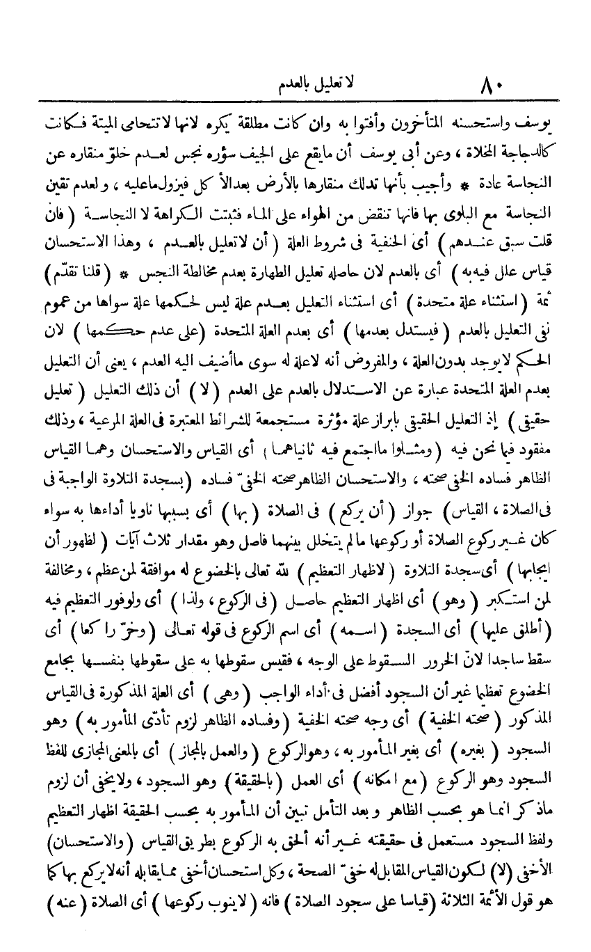 يُوسُف وَاسْتَحْسنهُ الْمُتَأَخّرُونَ وأفتوا بِهِ وَإِن كَانَت مُطلقَة يكره لِأَنَّهَا لَا تتحامى الْميتَة فَكَانَت كالدجاجة المخلاة، وَعَن أبي يُوسُف أَن مَا يَقع على الْجِيَف سؤره نجس لعدم خلو منقاره عَن النَّجَاسَة عَادَة وَأجِيب بِأَنَّهَا تدلك منقارها بِالْأَرْضِ بعد الْأكل فيزول مَا عَلَيْهِ، وَلعدم تقين النَّجَاسَة مَعَ الْبلوى بهَا فَإِنَّهَا تنقض من الْهَوَاء على المَاء فثبتت الْكَرَاهَة لَا النَّجَاسَة (فَإِن قلت سبق عِنْدهم) أَي الْحَنَفِيَّة فِي شُرُوط الْعلَّة (أَن لَا تَعْلِيل بِالْعدمِ، وَهَذَا الِاسْتِحْسَان قِيَاس علل فِيهِ بِهِ) أَي بِالْعدمِ لِأَن حَاصله تَعْلِيل الطَّهَارَة بِعَدَمِ مُخَالطَة النَّجس (قُلْنَا تقدم) ثمَّة (اسْتثِْنَاء عِلّة متحدة) أَي اسْتثِْنَاء التَّعْلِيل بِعَدَمِ عِلّة لَيْسَ لحكمها عِلّة سواهَا من عُمُوم نفي التَّعْلِيل بِالْعدمِ (فيستدل بعدمها) أَي بِعَدَمِ الْعلَّة المتحدة (على عدم حكمهَا) لِأَن الحكم لَا يُوجد بِدُونِ الْعلَّة، والمفروض أَنه لَا عِلّة لَهُ سوى مَا أضيف إِلَيْهِ الْعَدَم، يَعْنِي أَن التَّعْلِيل بِعَدَمِ الْعلَّة المتحدة عبارَة عَن الِاسْتِدْلَال بِالْعدمِ على الْعَدَم (لَا) أَن ذَلِك التَّعْلِيل (تَعْلِيل حَقِيقِيّ) إِذْ التَّعْلِيل الْحَقِيقِيّ بإبراز عِلّة مُؤثرَة مستجمعة للشرائط الْمُعْتَبرَة فِي الْعلَّة المرعية، وَذَلِكَ مَفْقُود فِيمَا نَحن فِيهِ (ومثلوا مَا اجْتمع فِيهِ ثانياهما) أَي الْقيَاس وَالِاسْتِحْسَان وهما الْقيَاس الظَّاهِر فَسَاده الْخَفي صِحَّته، وَالِاسْتِحْسَان الظَّاهِر صِحَّته الْخَفي فَسَاده (بِسَجْدَة التِّلَاوَة الْوَاجِبَة فِي فِي الصَّلَاة، الْقيَاس) جَوَاز (أَن يرْكَع) فِي الصَّلَاة (بهَا) أَي بِسَبَبِهَا نَاوِيا أداءها بِهِ سَوَاء كَانَ غير رُكُوع الصَّلَاة أَو ركوعها مَا لم يَتَخَلَّل بَينهمَا فاصل وَهُوَ مِقْدَار ثَلَاث آيَات (لظُهُور أَن إِيجَابهَا) أَي سَجْدَة التِّلَاوَة (لإِظْهَار التَّعْظِيم) لله تَعَالَى بالخضوع لَهُ مُوَافقَة لمن عظم، وَمُخَالفَة لمن استكبر (وَهُوَ) أَي إِظْهَار التَّعْظِيم حَاصِل (فِي الرُّكُوع، وَلذَا) أَي ولوفور التَّعْظِيم فِيهِ (أطلق عَلَيْهَا) أَي السَّجْدَة (اسْمه) أَي اسْم الرُّكُوع فِي قَوْله تَعَالَى (وخر رَاكِعا) أَي سقط سَاجِدا لِأَن الخرور السُّقُوط على الْوَجْه، فقيس سُقُوطهَا بِهِ على سُقُوطهَا بِنَفسِهَا بِجَامِع الخضوع تَعْظِيمًا غير أَن السُّجُود أفضل فِي أَدَاء الْوَاجِب (وَهِي) أَي الْعلَّة الْمَذْكُورَة فِي الْقيَاس الْمَذْكُور (صِحَّته الْخفية) أَي وَجه صِحَّته الْخفية (وفساده الظَّاهِر لُزُوم تأدي الْمَأْمُور بِهِ) وَهُوَ السُّجُود (بِغَيْرِهِ) أَي بِغَيْر الْمَأْمُور بِهِ، وَهُوَ الرُّكُوع (وَالْعَمَل بالمجاز) أَي بِالْمَعْنَى الْمجَازِي للفظ السُّجُود وَهُوَ الرُّكُوع (مَعَ إِمْكَانه) أَي الْعَمَل (بِالْحَقِيقَةِ) وَهُوَ السُّجُود، وَلَا يخفى أَن لُزُوم مَا ذكر إِنَّمَا هُوَ بِحَسب الظَّاهِر وَبعد التَّأَمُّل تبين أَن الْمَأْمُور بِهِ بِحَسب الْحَقِيقَة إِظْهَار التَّعْظِيم وَلَفظ السُّجُود مُسْتَعْمل فِي حَقِيقَته غير أَنه ألحق بِهِ الرُّكُوع بطرِيق الْقيَاس (وَالِاسْتِحْسَان) الأخفى (لَا) لكَون الْقيَاس الْمُقَابل لَهُ خَفِي الصِّحَّة، وكل اسْتِحْسَان أخْفى مِمَّا يُقَابله أَنه لَا يرْكَع بهَا كَمَا هُوَ قَول الْأَئِمَّة الثَّلَاثَة (قِيَاسا على سُجُود الصَّلَاة) فَإِنَّهُ (لَا يَنُوب ركوعها) أَي الصَّلَاة (عَنهُ)