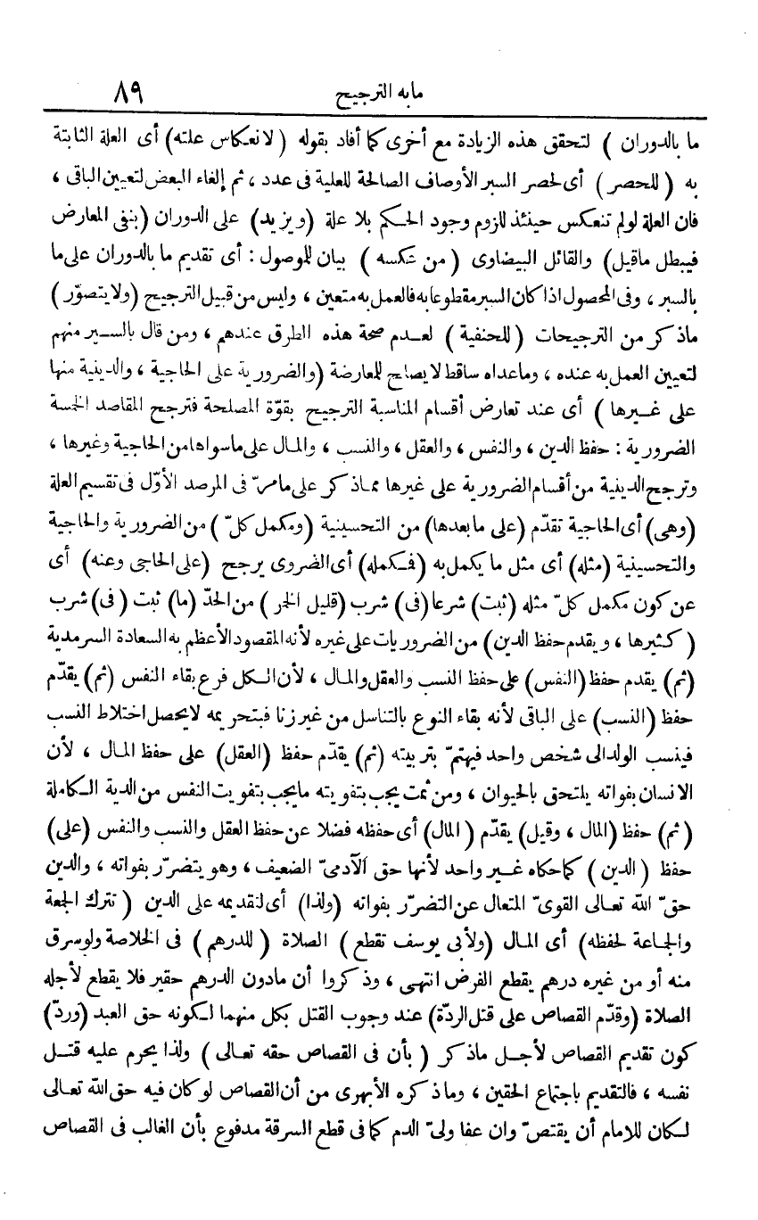 مَا بالدوران) لتحَقّق هَذِه الزِّيَادَة مَعَ أُخْرَى كَمَا أَفَادَ بقوله (لانعكاس علته) أَي الْعلَّة الثَّابِتَة بِهِ (للحصر) أَي لحصر السبر الْأَوْصَاف الصَّالِحَة للعلية فِي عدد، ثمَّ إِلْغَاء الْبَعْض لتعيين الْبَاقِي، فَإِن الْعلَّة لَو لم تنعكس حِينَئِذٍ للُزُوم وجود الحكم بِلَا عِلّة (وَيزِيد) على الدوران (بِنَفْي الْمعَارض فَيبْطل مَا قيل) وَالْقَائِل الْبَيْضَاوِيّ (من عَكسه) بَيَان للموصول: أَي تَقْدِيم مَا بالدوران على مَا بالسبر، وَفِي الْمَحْصُول إِذا كَانَ السبر مَقْطُوعًا بِهِ فَالْعَمَل بِهِ مُتَعَيّن، وَلَيْسَ من قبيل التَّرْجِيح (وَلَا يتَصَوَّر) مَا ذكر من الترجيحات (للحنفية) لعدم صِحَة هَذِه الطّرق عِنْدهم، وَمن قَالَ بالسير مِنْهُم لتعيين الْعَمَل بِهِ عِنْده، وَمَا عداهُ سَاقِط لَا يصلح للمعارضة (والضرورية على الحاجية، والدينية مِنْهَا على غَيرهَا) أَي عِنْد تعَارض أَقسَام الْمُنَاسبَة التَّرْجِيح بِقُوَّة الْمصلحَة فترجح الْمَقَاصِد الْخَمْسَة الضرورية: حفظ الدّين، وَالنَّفس، وَالْعقل، وَالنّسب، وَالْمَال على مَا سواهَا من الحاجية وَغَيرهَا، وترجح الدِّينِيَّة من أَقسَام الضرورية على غَيرهَا مِمَّا ذكر على مَا مر فِي المرصد الأول فِي تَقْسِيم الْعلَّة (وَهِي) أَي الحاجية تقدم (على مَا بعْدهَا) من التحسينية (ومكمل كل) من الضرورية والحاجية والتحسينية (مثله) أَي مثل مَا يكمل بِهِ (فمكمله) أَي الضَّرُورِيّ يرجح (على الحاجي وَعنهُ) أَي عَن كَون مكمل كل مثله (ثَبت) شرعا (فِي) شرب (قَلِيل الْخمر) من الْحَد (مَا) ثَبت (فِي) شرب (كثيرها، وَيقدم حفظ الدّين) من الضروريات على غَيره لِأَنَّهُ الْمَقْصُود والأعظم بِهِ السَّعَادَة السرمدية (ثمَّ) يقدم حفظ (النَّفس) على حفظ النّسَب وَالْعقل وَالْمَال، لِأَن الْكل فرع بَقَاء النَّفس (ثمَّ) يقدم حفظ (النّسَب) على الْبَاقِي لِأَنَّهُ بَقَاء النَّوْع بالتناسل من غير زنا فبتحريمه لَا يحصل اخْتِلَاط النّسَب فينسب الْوَلَد إِلَى شخص وَاحِد فيهتم بتربيته (ثمَّ) يقدم حفظ (الْعقل) على حفظ المَال، لِأَن الْإِنْسَان بفواته يلْتَحق بِالْحَيَوَانِ، وَمن ثمت يجب بتفويته مَا يجب بتفويت النَّفس من الدِّيَة الْكَامِلَة (ثمَّ) حفظ (المَال، وَقيل) يقدم (المَال) أَي حفظه فضلا عَن حفظ الْعقل وَالنّسب وَالنَّفس (على) حفظ (الدّين) كَمَا حَكَاهُ غير وَاحِد لِأَنَّهَا حق الْآدَمِيّ الضَّعِيف، وَهُوَ يتَضَرَّر بفواته، وَالدّين حق الله تَعَالَى الْقوي المتعال عَن التضرر بفواته (وَلذَا) أَي لتقديمه على الدّين (تتْرك الْجُمُعَة وَالْجَمَاعَة لحفظه) أَي المَال (وَلأبي يُوسُف تقطع) الصَّلَاة (للدرهم) فِي الْخُلَاصَة وَلَو سرق مِنْهُ أَو من غَيره دِرْهَم يقطع الْفَرْض انْتهى، وَذكروا أَن مَا دون الدِّرْهَم حقير فَلَا يقطع لأَجله الصَّلَاة (وَقدم الْقصاص على قتل الرِّدَّة) عِنْد وجوب الْقَتْل بِكُل مِنْهُمَا لكَونه حق العَبْد (ورد) كَون تَقْدِيم الْقصاص لأجل مَا ذكر (بِأَن فِي الْقصاص حَقه تَعَالَى) وَلذَا يحرم عَلَيْهِ قتل نَفسه، فالتقديم باجتماع الْحَقَّيْنِ، وَمَا ذكره الْأَبْهَرِيّ من أَن الْقصاص لَو كَانَ فِيهِ حق الله تَعَالَى لَكَانَ للْإِمَام أَن يقْتَصّ وَإِن عَفا ولي الدَّم كَمَا فِي قطع السّرقَة مَدْفُوع بِأَن الْغَالِب فِي الْقصاص