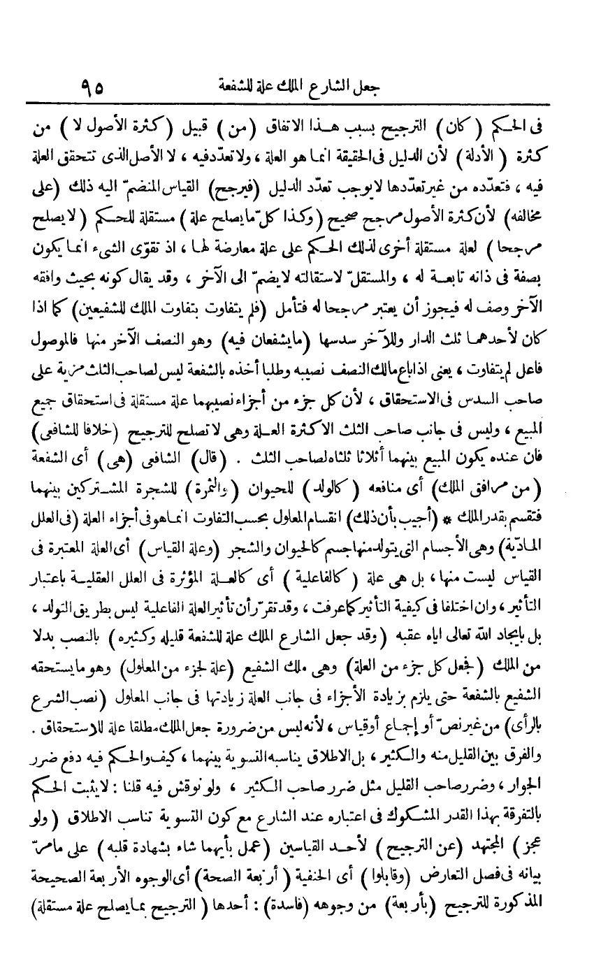 فِي الحكم (كَانَ) التَّرْجِيح بِسَبَب هَذَا الِاتِّفَاق (من) قبيل (كَثْرَة الْأُصُول لَا) من كَثْرَة (الْأَدِلَّة) لِأَن الدَّلِيل فِي الْحَقِيقَة إِنَّمَا هُوَ الْعلَّة، وَلَا تعدد فِيهِ، لَا الأَصْل الَّذِي تتَحَقَّق الْعلَّة فِيهِ، فتعدده من غير تعددها لَا يُوجب تعدد الدَّلِيل (فيرجح) الْقيَاس المنضم إِلَيْهِ ذَلِك (على مخالفه) لِأَن كَثْرَة الْأُصُول مُرَجّح صَحِيح (وَكَذَا كل مَا يصلح عِلّة) مُسْتَقلَّة للْحكم (لَا يصلح مرجحا) لعِلَّة مُسْتَقلَّة أُخْرَى لذَلِك الحكم على عِلّة مُعَارضَة لَهَا، إِذْ تقوى الشَّيْء إِنَّمَا يكون بِصفة فِي ذَاته تَابِعَة لَهُ، والمستقل لاستقالته لَا يضم إِلَى الآخر، وَقد يُقَال كَونه بِحَيْثُ وَافقه الآخر وصف لَهُ فَيجوز أَن يعْتَبر مرجحا لَهُ فَتَأمل (فَلم يتَفَاوَت بتفاوت الْملك للشفيعين) كَمَا إِذا كَانَ لأَحَدهمَا ثلث الدَّار وَللْآخر سدسها (مَا يشفعان فِيهِ) وَهُوَ النّصْف الآخر مِنْهَا فالموصول فَاعل لم يتَفَاوَت يَعْنِي إِذا بَاعَ مَالك النّصْف نصِيبه وطلبا أَخذه بِالشُّفْعَة لَيْسَ لصَاحب الثُّلُث مزية على صَاحب السُّدس فِي الِاسْتِحْقَاق، لِأَن كل جُزْء من أَجزَاء نصيبهما عِلّة مُسْتَقلَّة فِي اسْتِحْقَاق جَمِيع الْمَبِيع، وَلَيْسَ فِي جَانب صَاحب الثُّلُث إِلَّا كَثْرَة الْعلَّة وَهِي لَا تصلح للترجيح (خلافًا للشَّافِعِيّ) فَإِن عِنْده يكون الْمَبِيع بَينهمَا أَثلَاثًا ثُلُثَاهُ لصَاحب الثُّلُث. (قَالَ) الشَّافِعِي (هِيَ) أَي الشُّفْعَة (من مرافق الْملك) أَي مَنَافِعه (كَالْوَلَدِ) للحيوان (وَالثَّمَرَة) للشجرة المشتركين بَينهمَا فتقسم بِقدر الْملك (أُجِيب بِأَن ذَلِك) انقسام الْمَعْلُول بِحَسب التَّفَاوُت إِنَّمَا هُوَ فِي أَجزَاء الْعلَّة (فِي الْعِلَل المادية) وَهِي الْأَجْسَام الَّتِي يتَوَلَّد مِنْهَا جسم كالحيوان وَالشَّجر (وَعلة الْقيَاس) أَي الْعلَّة الْمُعْتَبرَة فِي الْقيَاس لَيست مِنْهَا، بل هِيَ عِلّة (كالفاعلية) أَي كالعلة المؤثرة فِي الْعِلَل الْعَقْلِيَّة بِاعْتِبَار التَّأْثِير، وَإِن اخْتلفَا فِي كَيْفيَّة التَّأْثِير كَمَا عرفت، وَقد تقرر أَن تَأْثِير الْعلَّة الفاعلية لَيْسَ بطرِيق التولد، بل بإيجاد الله تَعَالَى إِيَّاه عقبه (وَقد جعل الشَّارِع الْملك عِلّة للشفعة قَلِيله وَكَثِيره) بِالنّصب بَدَلا من الْملك (فَجعل كل جُزْء من الْعلَّة) وَهِي ملك الشَّفِيع (عِلّة لجزء من الْمَعْلُول) وَهُوَ مَا يسْتَحقّهُ الشَّفِيع بِالشُّفْعَة حَتَّى يلْزم بِزِيَادَة الْأَجْزَاء فِي جَانب الْعلَّة زيادتها فِي جَانب الْمَعْلُول (نصب الشَّرْع بِالرَّأْيِ) من غير نَص أَو إِجْمَاع أَو قِيَاس، لِأَنَّهُ لَيْسَ من ضَرُورَة جعل الْملك مُطلقًا عِلّة للاستحقاق. وَالْفرق بَين الْقَلِيل مِنْهُ وَالْكثير، بل الْإِطْلَاق يُنَاسِبه التَّسْوِيَة بَينهمَا، كَيفَ وَالْحكم فِيهِ دفع ضَرَر الْجوَار، وضرر صَاحب الْقَلِيل مثل ضَرَر صَاحب الْكثير، وَلَو نوقشي فِيهِ قُلْنَا: لَا يثبت الحكم بالتفرقة بِهَذَا الْقدر الْمَشْكُوك فِي اعْتِبَاره عِنْد الشَّارِع مَعَ كَون التَّسْوِيَة تناسب الْإِطْلَاق (وَلَو عجز) الْمُجْتَهد (عَن التَّرْجِيح) لأحد القياسين (عمل بِأَيِّهِمَا شَاءَ بِشَهَادَة قلبه) على مَا مر بَيَانه فِي فصل التَّعَارُض (وَقَابَلُوا) أَي الْحَنَفِيَّة (أَرْبَعَة الصِّحَّة) أَي الْوُجُوه الْأَرْبَعَة الصَّحِيحَة الْمَذْكُورَة للترجيح (بأَرْبعَة) من وجوهه (فَاسِدَة): أَحدهَا (التَّرْجِيح بِمَا يصلح عِلّة مُسْتَقلَّة)