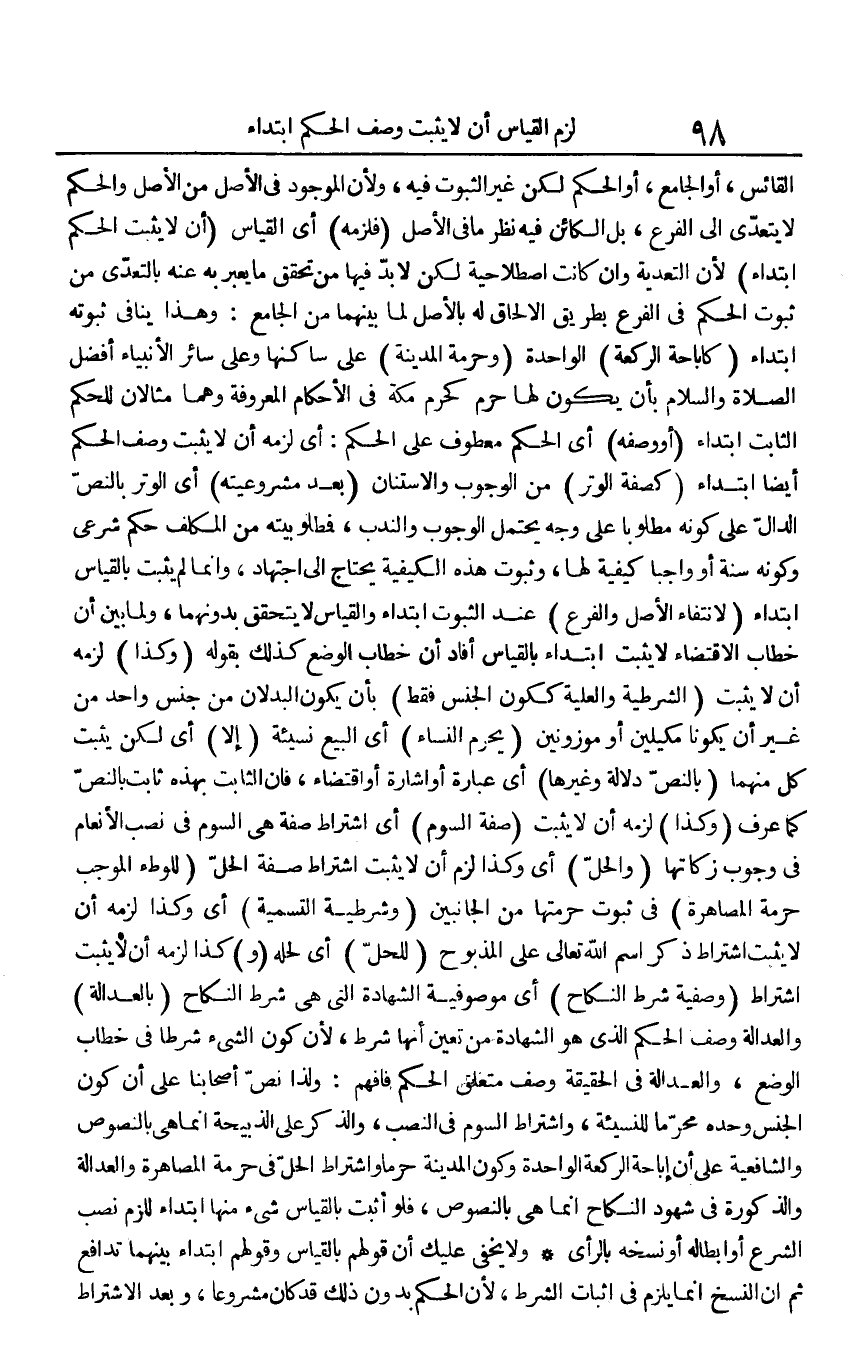 القائس، أَو الْجَامِع، أَو الحكم لَكِن غير الثُّبُوت فِيهِ، وَلِأَن الْمَوْجُود فِي الأَصْل من الأَصْل وَالْحكم لَا يتَعَدَّى إِلَى الْفَرْع، بل الْكَائِن فِيهِ نظر مَا فِي الأَصْل (فَلَزِمَهُ) أَي الْقيَاس (أَن لَا يثبت الحكم ابْتِدَاء) لِأَن التَّعْدِيَة وَإِن كَانَت اصطلاحية لَكِن لَا بُد فِيهَا من تحقق مَا يعبر بِهِ عَنهُ بِالتَّعَدِّي من ثُبُوت الحكم فِي الْفَرْع بطرِيق الْإِلْحَاق لَهُ بِالْأَصْلِ لما بَينهمَا من الْجَامِع: وَهَذَا يُنَافِي ثُبُوته ابْتِدَاء (كإباحة الرَّكْعَة) الْوَاحِدَة (وَحُرْمَة الْمَدِينَة) على ساكنها وعَلى سَائِر الْأَنْبِيَاء أفضل الصَّلَاة وَالسَّلَام بِأَن يكون لَهَا حرم كحرم مَكَّة فِي الْأَحْكَام الْمَعْرُوفَة وهما مثالان للْحكم الثَّابِت ابْتِدَاء (أَو وَصفه) أَي الحكم مَعْطُوف على الحكم: أَي لزمَه أَن لَا يثبت وصف الحكم أَيْضا ابْتِدَاء (كصفة الْوتر) من الْوُجُوب والاستنان (بعد مشروعيته) أَي الْوتر بِالنَّصِّ الدَّال على كَونه مَطْلُوبا على وَجه يحْتَمل الْوُجُوب وَالنَّدْب، فمطلوبيته من الْمُكَلف حكم شَرْعِي وَكَونه سنة أَو وَاجِبا كَيْفيَّة لَهَا، وَثُبُوت هَذِه الْكَيْفِيَّة يحْتَاج إِلَى اجْتِهَاد، وَإِنَّمَا لم يثبت بِالْقِيَاسِ ابْتِدَاء (لانْتِفَاء الأَصْل وَالْفرع) عِنْد الثُّبُوت ابْتِدَاء وَالْقِيَاس لَا يتَحَقَّق بدونهما، وَلما بَين أَن خطاب الِاقْتِضَاء لَا يثبت ابْتِدَاء بِالْقِيَاسِ أَفَادَ أَن خطاب الْوَضع كَذَلِك بقوله (وَكَذَا) لزمَه أَن لَا يثبت (الشّرطِيَّة والعلية ككون الْجِنْس فَقَط) بِأَن يكون البدلان من جنس وَاحِد من غير أَن يَكُونَا مكيلين أَو موزونين (يحرم النِّسَاء) أَي البيع نَسِيئَة (إِلَّا) أَي لَكِن يثبت كل مِنْهُمَا (بِالنَّصِّ دلَالَة وَغَيرهَا) أَي عبارَة أَو إِشَارَة أَو اقْتِضَاء، فَإِن الثَّابِت بِهَذِهِ ثَابت بِالنَّصِّ كَمَا عرف (وَكَذَا) لزمَه أَن لَا يثبت (صفة السّوم) أَي اشْتِرَاط صفة هِيَ السّوم فِي نصب الْأَنْعَام فِي وجوب زَكَاتهَا (والحل) أَي وَكَذَا لزم أَن لَا يثبت اشْتِرَاط صفة الْحل (للْوَطْء الْمُوجب حُرْمَة الْمُصَاهَرَة) فِي ثُبُوت حرمتهَا من الْجَانِبَيْنِ (وشرطية التَّسْمِيَة) أَي وَكَذَا لزمَه أَن لَا يثبت اشْتِرَاط ذكر اسْم الله تَعَالَى على الْمَذْبُوح (للْحلّ) أَي لِحلِّهِ (و) كَذَا لزمَه أَن لَا يثبت اشْتِرَاط (وَصفِيَّة شَرط النِّكَاح) أَي موصوفية الشَّهَادَة الَّتِي هِيَ شَرط النِّكَاح (بِالْعَدَالَةِ) وَالْعَدَالَة وصف الحكم الَّذِي هُوَ الشَّهَادَة من تعين أَنَّهَا شَرط، لِأَن كَون الشَّيْء شرطا فِي خطاب الْوَضع، وَالْعَدَالَة فِي الْحَقِيقَة وصف مُتَعَلق الحكم فَافْهَم: وَلذَا نَص أَصْحَابنَا على أَن كَون الْجِنْس وَحده محرما للنسيئة، وَاشْتِرَاط السّوم فِي النصب، وَالذكر على الذَّبِيحَة إِنَّمَا هِيَ بالنصوص وَالشَّافِعِيَّة على أَن إِبَاحَة الرَّكْعَة الْوَاحِدَة وَكَون الْمَدِينَة حرما وَاشْتِرَاط الْحل فِي حُرْمَة الْمُصَاهَرَة وَالْعَدَالَة والذكورة فِي شُهُود النِّكَاح إِنَّمَا هِيَ بالنصوص، فَلَو أثبت بِالْقِيَاسِ شَيْء مِنْهَا ابْتِدَاء للَزِمَ نصب الشَّرْع أَو إِبْطَاله أَو نسخه بِالرَّأْيِ وَلَا يخفى عَلَيْك أَن قَوْلهم بِالْقِيَاسِ وَقَوْلهمْ ابْتِدَاء بَينهمَا تدافع ثمَّ أَن النّسخ إِنَّمَا يلْزم فِي إِثْبَات الشَّرْط، لِأَن الحكم بِدُونِ ذَلِك قد كَانَ شروعا، وَبعد الِاشْتِرَاط