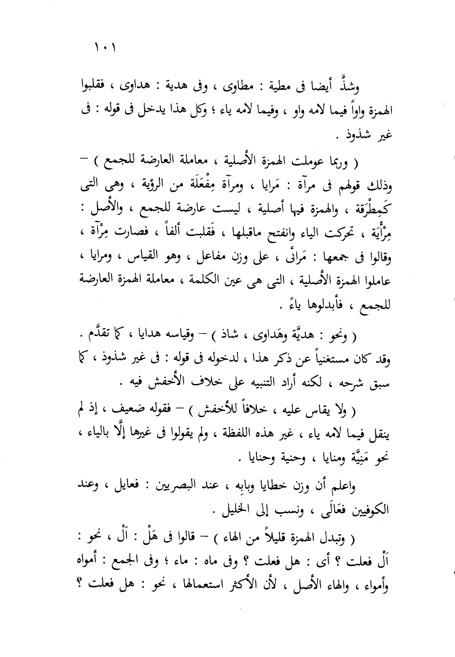 وشذ أيضاً في مطية: مطاوي، وفي هدية: هداوي، فقلبوا الهمزة واواً فيما لامه واو، وفيما لامه ياء؛ وكل هذا يدخل في قوله: في غير شذوذ.