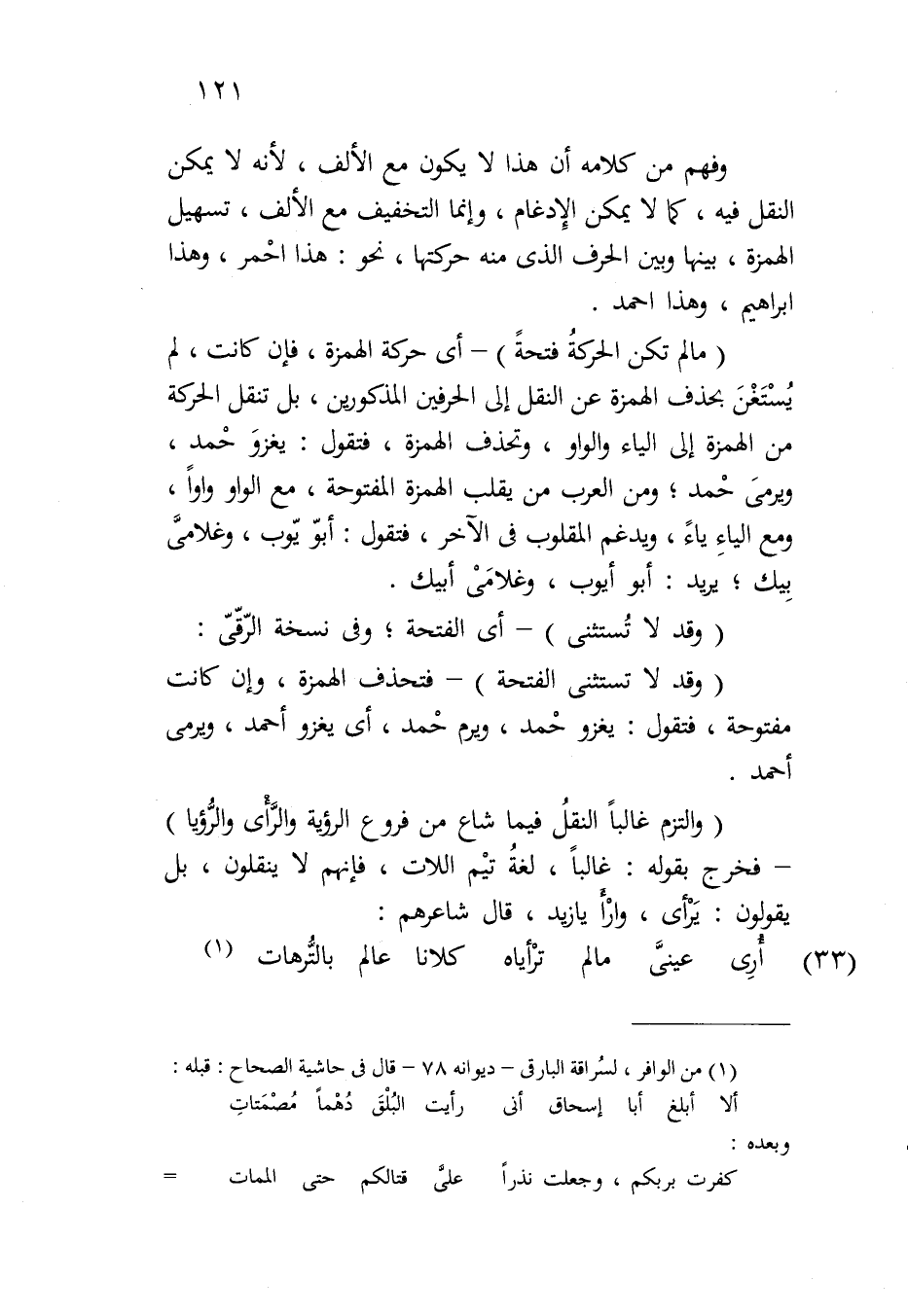 وفهم من كلامه أن هذا لا يكون مع الألف، لأنه لا يمكن النقل فيه، كما لا يمكن الإدغام، وإنما التخفيف مع الألف، تسهيل الهمزة، بينها وبين الحرف الذي منه حركتها، نحو: هذا احمر، وهذا ابراهيم، وهذا احمد.