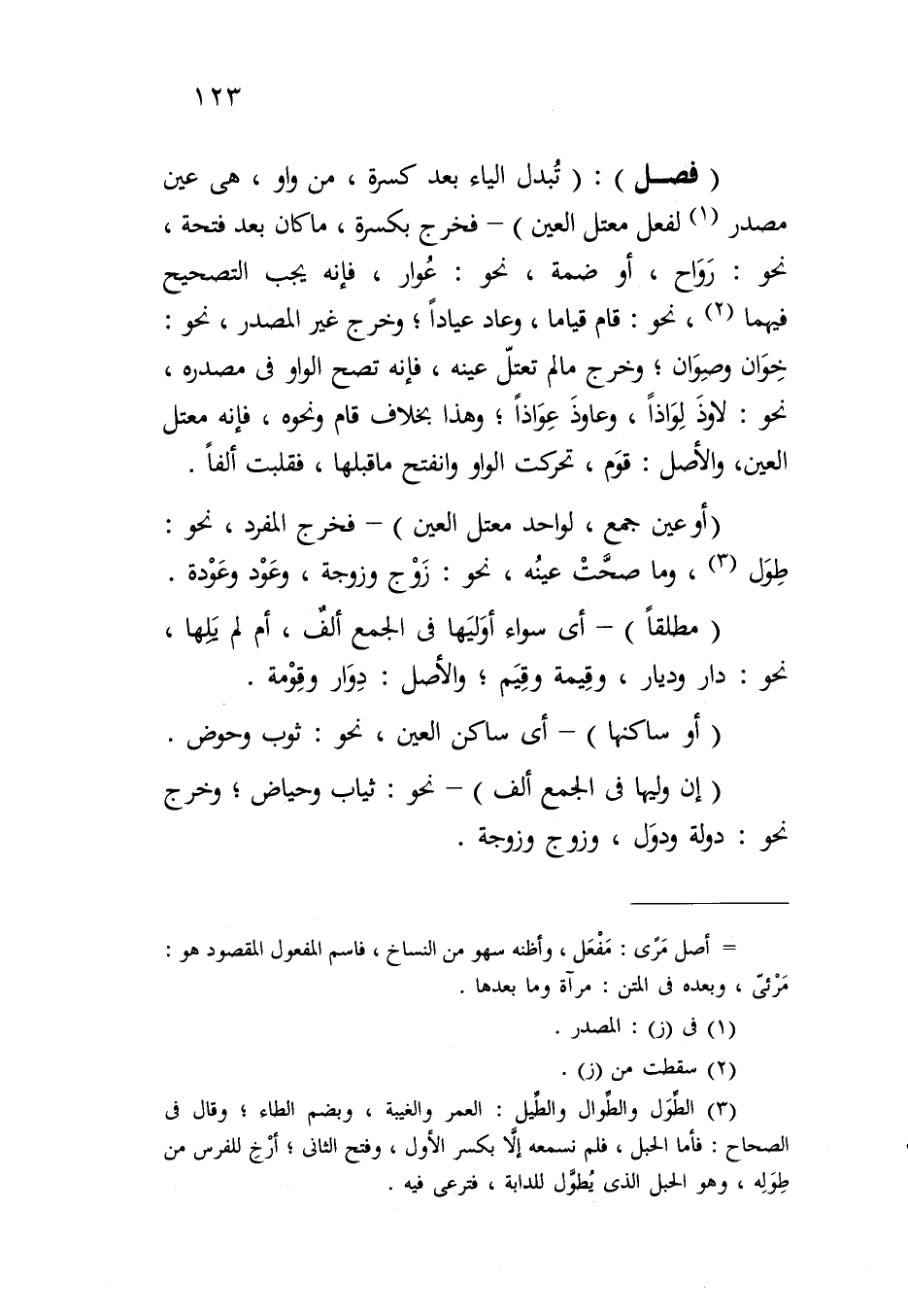 (فصل): (تبدل الياء بعد كسرة، من واو، هي عين مصدر لفعل معتل العين) - فخرج بكسرة، ما كان بعد فتحة، نحو: رواح، أو ضمة، نحو: عوار، فإنه يجب التصحيح فيهما، نحو: قام قياما، وعاد عياداً؛ وخرج غير المصدر، نحو: خوان وصوان؛ وخرج ما لم تعتل عينه، فإنه تصح الواو في مصدره، نحو: لاوذ لواذاً، وعاوذ عواذاً؛ وهذا بخلاق قام ونحوه، فإنه معتل العين، والأصل: قوم، تحركت الواو وانفتح ما قبلها، فقلبت ألفاً.