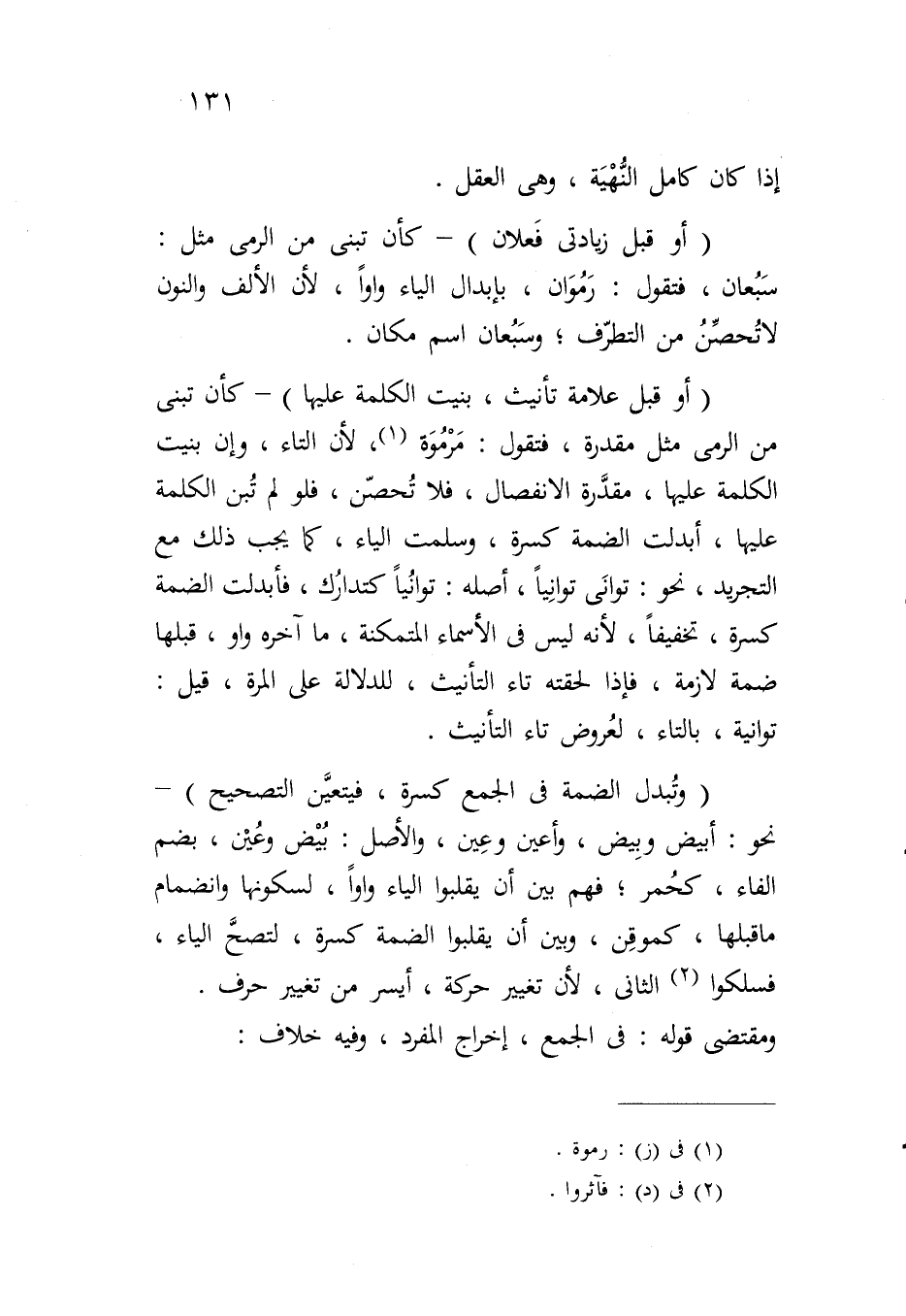 (أو قبل علامة تأنيث، بنيت الكلمة عليها) - كأن تبنى من الرمي مثل مقدرة، فتقول: مرموة، لأن التاء، وإن بنيت الكلمة عليها، مقدرة الانفصال، فلا تحصن، فلو لم تبن الكلمة عليها، أبدلت الضمة كسرة، وسلمت الياء، كما يجب ذلك مع التجريد، نحو: توانى توانياً، أصله: توانياً كتدارك، فأبدلت الضمة كسرة، تخفيفاً، لأنه ليس في الأسماء المتمكنة، ما آخره واو، قبلها ضمة لازمة، فإذا لحقته تاء التأنيث، للدلالة على المرة، قيل: توانية، بالتاء، لعروض تاء التأنيث.