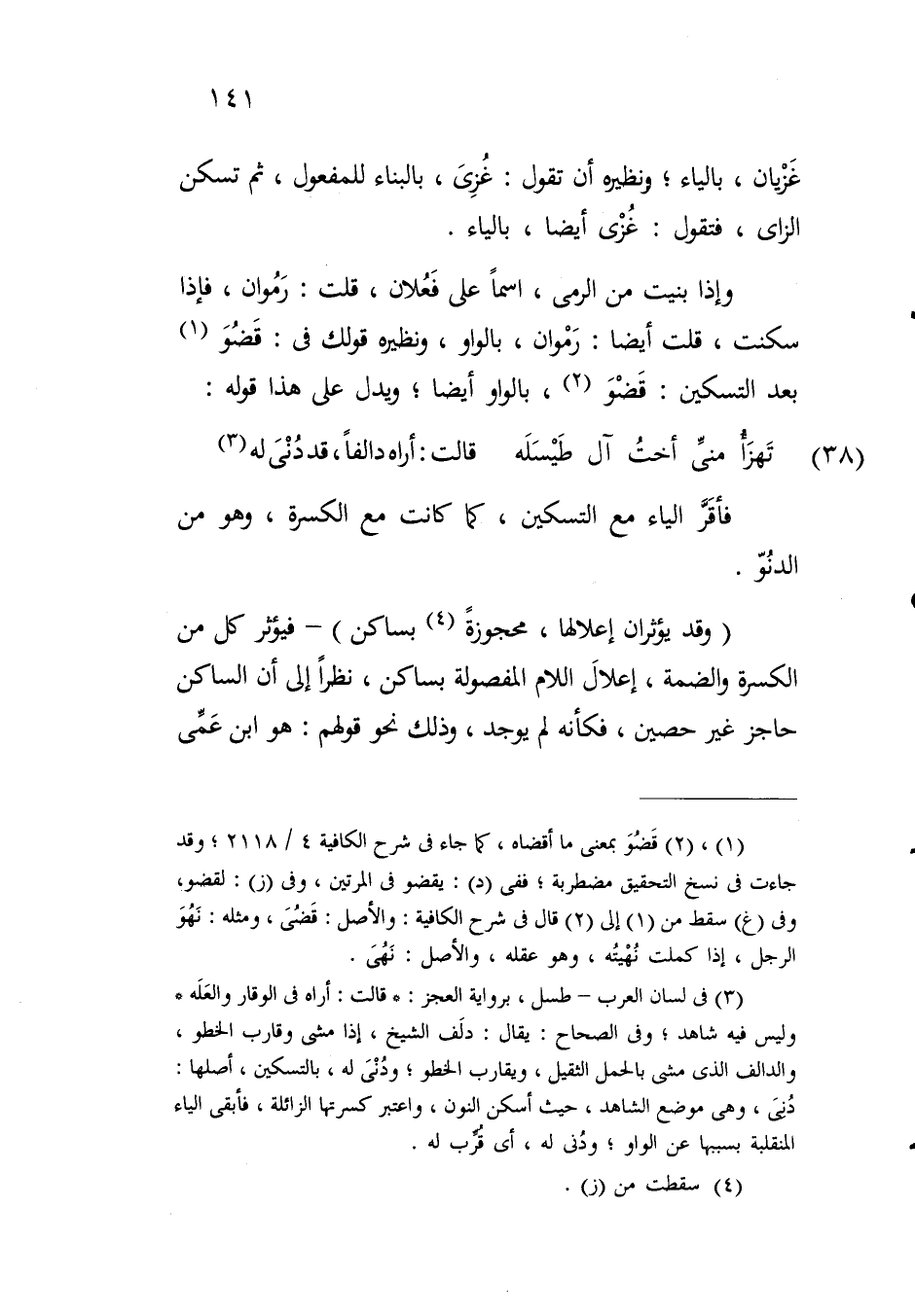 وإذا بنيت من الرمي، اسماً على فعلان، قلت: رموان، فإذا سكنت، قلت أيضاً: رموان، بالواو، ونظيره قولك في: قضو بعد التسكين: قضو، بالواو أيضاً؛ ويدل على هذا قوله: