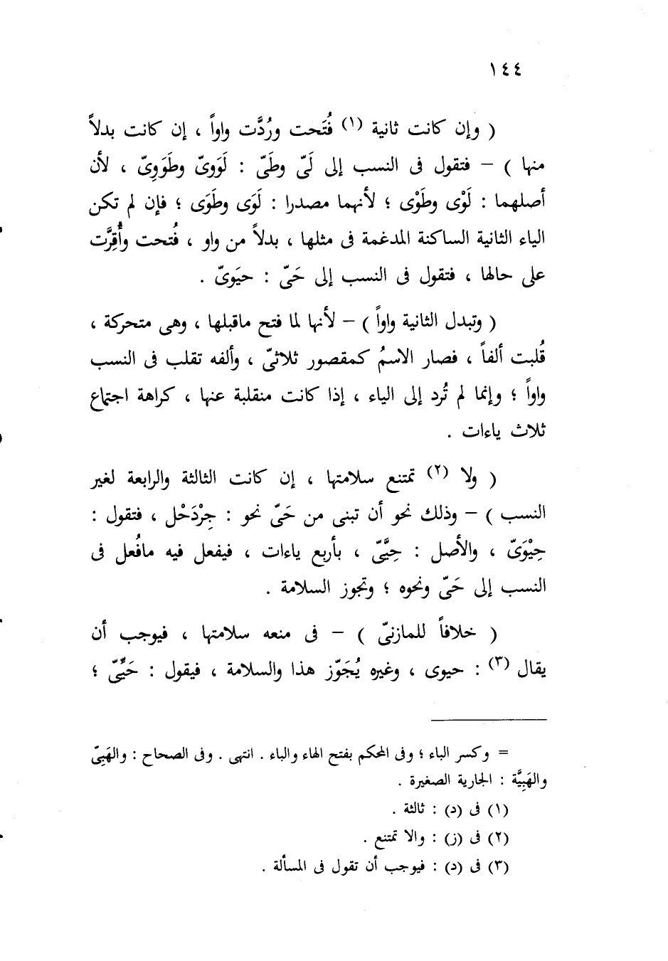 (وإن كانت ثانية فتحت وردت واواً، إن كانت بدلاً منها) - فتقول في النسب إلى لي وطي: لووي وطووي، لأن أصلهما: لوي وطوي؛ لأنهما مصدرا: لوى وطوى؛ فإن لم تكن الياء الثانية الساكنة المدغمة في مثلها، بدلاً من واو، فتحت وأقرت على حالها، فتقول في النسب إلى حي: حيوي.