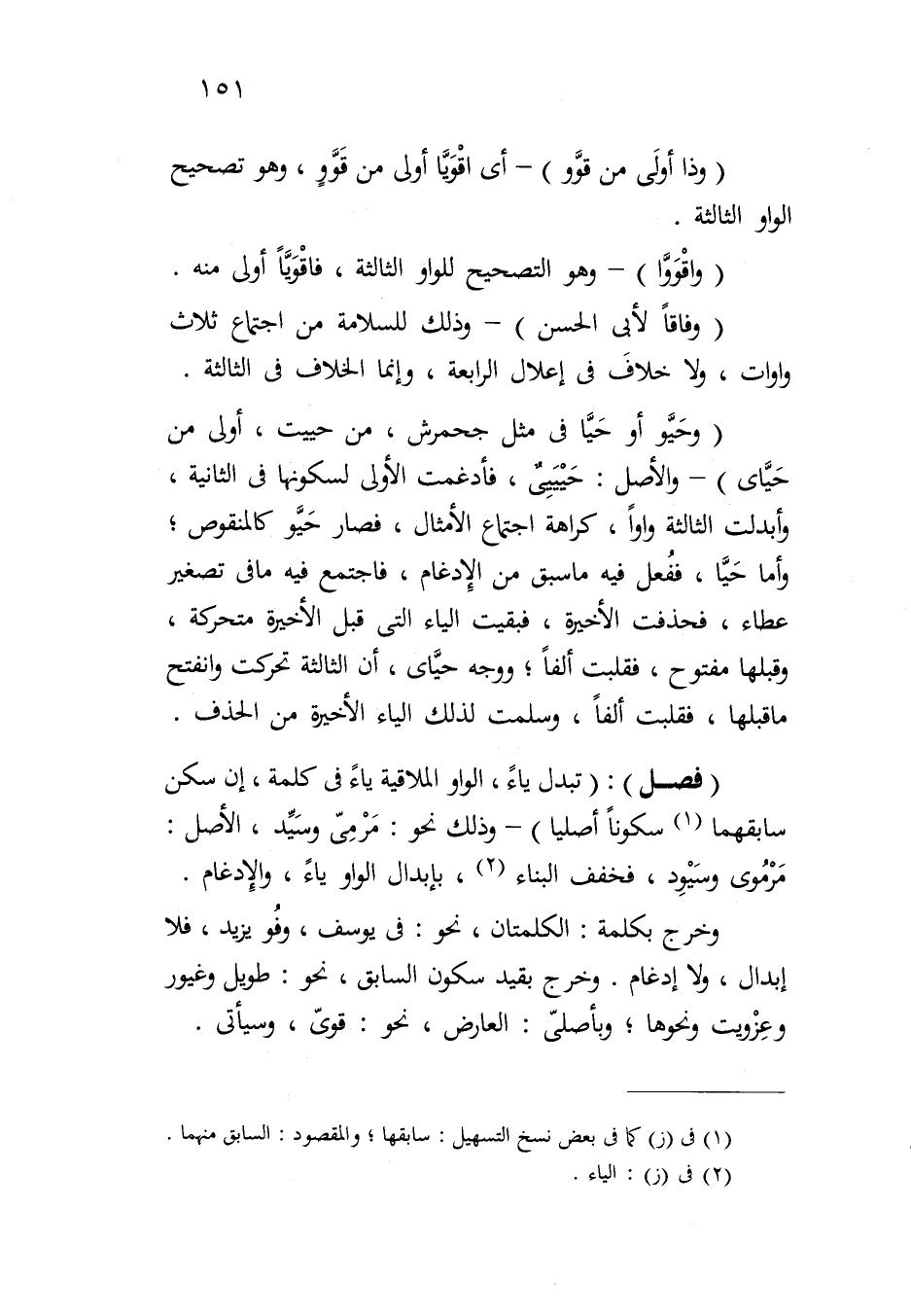 (فصل): (تبدل ياء، الواو الملاقية ياء في كلمة، إن سكن سابقهما سكوناً أصلياً) - وذلك نحو: مرمي وسيد، الأصل: مرموي وسيود، فخفف البناء، بإبدال الواو ياء، والإدغام.