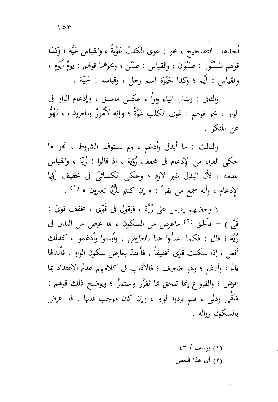 والثالث: ما أبدل وأدغم، ولم يستوف الشروط، نحو ما حكى الفراء من الإدغام في مخفف رؤية، إذ قالوا: رية، والقياس عدمه، لأن البدل غير لازم؛ وحكى الكسائي في تخفيف رؤيا الإدغام، وأنه سمع من يقرأ: "إن كنتم للريا تعبرون".