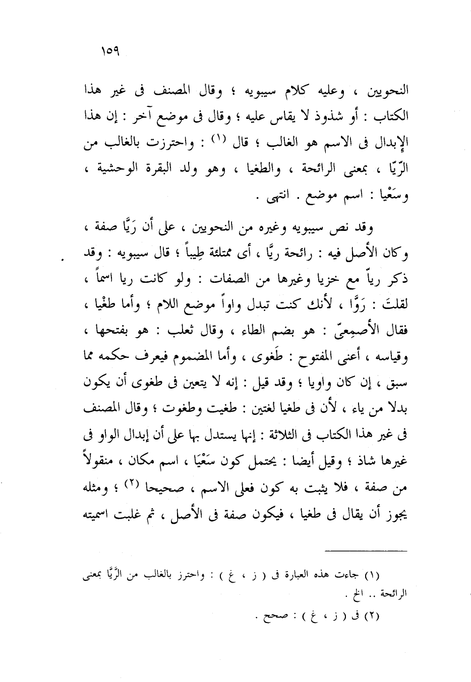 وقد نص سيبويه وغيره من النحويين، على أن ريا صفة، وكان الأصل فيه: رائحة ريا، أي ممتلئة طيباً؛ قال سيبويه: وقد ذكر ريا مع خزيا وغيرها من الصفات: ولو كانت ريا اسماً، لقلت: روا، لأنك كنت تبدل واواً موضع اللام؛ وأما طغيا، فقال الأصمعي: هو بضم الطاء، وقال ثعلب: هو بفتحها، وقياسه، أعني المفتوح: طغوى، وأما المضموم فيعرف حكمه مما سبق، إن كان واوياً؛ وقد قيل: إنه لا يتعين في طغوى أن يكون بدلاً من ياء، لأن في طغيا لغتين: طغيت وطغوت؛ وقال المصنف في غير هذا الكتاب في الثلاثة: إنها يستدل بها على أن إبدال الواو في غيرها شاذ؛ وقيل أيضاً: يحتمل كون سعيا، اسم مكان، منقولاً من صفة، فلا يثبت به كون فعلى الاسم، صحيحاً؛ ومثله يجوز أن يقال في طغيا، فيكون صفة في الأصل، ثم غلبت اسميته