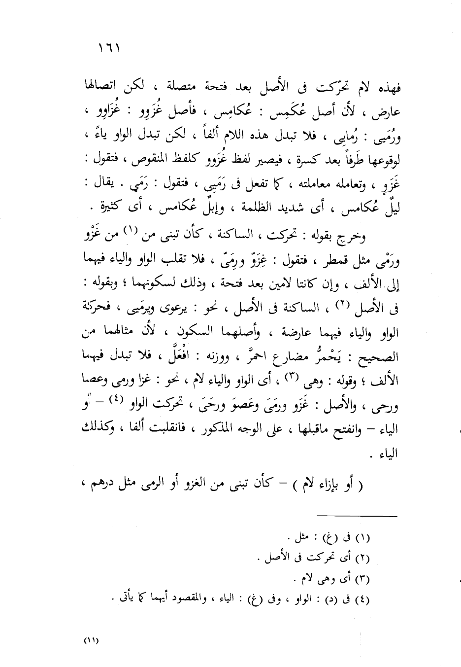 فهذه لام تحركت في الأصل بعد فتحة متصلة، لكن اتصالها عارض، لأن أصل عكمس: عكامس، فأصل غُزَوِو: غُزَاوِو، ورُمَيى: رُمايِى، فلا تبدل هذه اللام ألفاً، لكن تبدل الواو ياءً، لوقوعها طرفاً بعد كسرة، فيصير لفظ غُزَوو كلفظ المنقوص، فتقول: غزو، وتعامله معاملته، كما تفعل في رَمَيِى، فتقول: رَمَي. يقال: ليل عكامس، أي شديد الظلمة، وإبل عكامس، أي كثيرة.