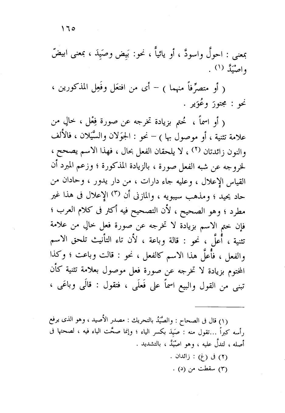 (أو اسماً، ختم بزيادة تخرجه عن صورة فعل، خال من علامة تثنية، أو موصول بها) - نحو: الجولان والسيلان، فالألف والنون زائدتان، لا يلحقان الفعل بحال، فهذا الاسم يصحح، لخروجه عن شبه الفعل صورة، بالزيادة المذكورة؛ وزعم المبرد أن القياس الإعلال، وعليه جاء دارات، من دار يدور، وحادان من حاد يحيد؛ ومذهب سيبويه، والمازني أن الإعلال في هذا غير مطرد؛ وهو الصحيح، لأن التصحيح فيه أكثر في كلام العرب؛ فإن ختم الاسم بزيادة لا تخرجه عن صورة فعل خال من علامة تثنية، أعل، نحو: قالة وباعة، لأن تاء التأنيث تلحق الاسم والفعل، فأعل هذا الاسم كالفعل، نحو: قالت وباعت؛ وكذا المختوم بزيادة لا تخرجه عن صورة فعل موصول بعلامة تثنية كأن تبنى من القول والبيع اسماً على فعلى، فتقول: قالى وباعى،
