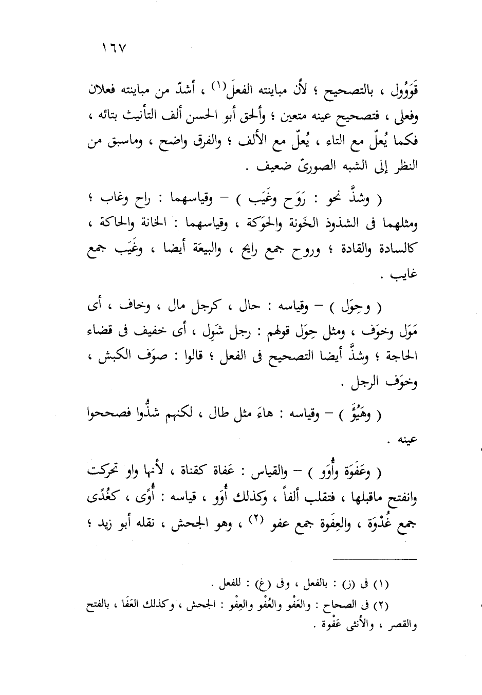 (وحول) - وقياسه: حال، كرجل مال، وخاف، أي مول وخوف، ومثل حول قولهم: رجل شول، أي خفيف في قضاء الحاجة؛ وشذ أيضاً التصحيح في الفعل؛ قالوا: صوف الكبش، وخوف الرجل.