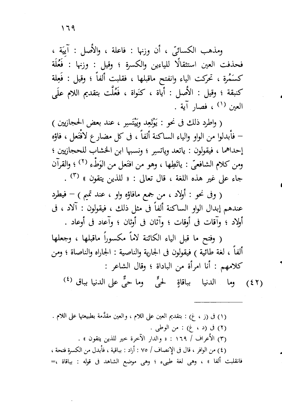 (واطرد ذلك في نحو: يوتعد وييتسر، عند بعض الحجازيين) - فأبدلوا من الواو والياء الساكنة ألفاً، في كل مضارع لافتعل، فاؤه إحداهما، فيقولون: ياتعد وياتسر؛ ونسبها ابن الخشاب للحجازيين؛ ومن كلام الشافعي: ياتطها، وهو من افتعل من الوطء؛ والقرآن جاء على غير هذه اللغة، قال تعالى: "للذين يتقون".