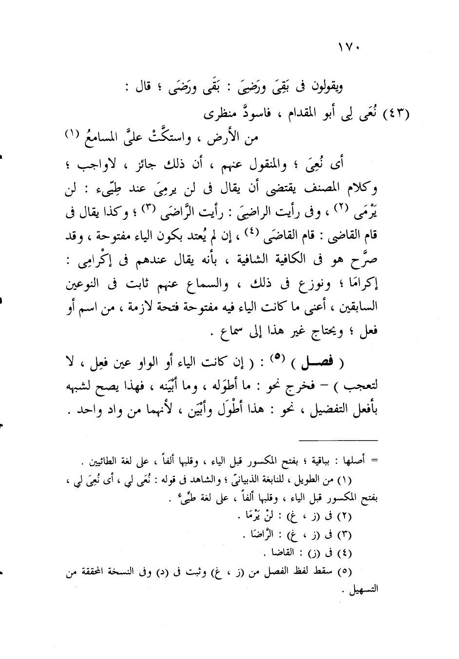 اي نعي؛ والمنقول عنهم، أن ذلك جائز، لا واجب؛ وكلام المصنف يقتضي أن يقال في لن يرمي عند طيئ: لن يرمى، وفي رأيت الراضي: رأيت الراضي؛ وكذا يقال في قام القاضي: قام القاضي، إن لم يعتد بكون الياء مفتوحة، وقد صرح هو في الكافية الشافية، بأنه يقال عندهم في إكرامي: إكرامَا؛ ونوزع في ذلك، والسماع عنهم ثابت في النوعين السابقين، أعني ما كانت الياء فيه مفتوحة فتحة لازمة، من اسم أو فعل؛ ويحتاج غير هذا إلى سماع.